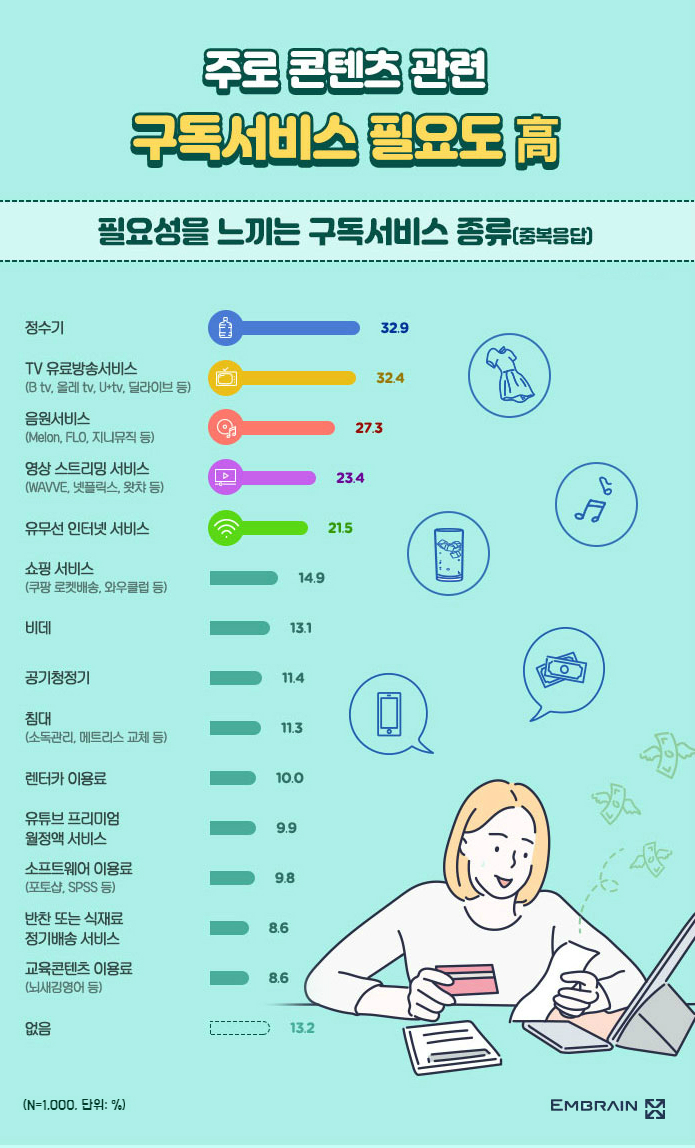 - 이용경험 많은 서비스는 음원, TV 유료방송, 정수기, 영상 스트리밍 순