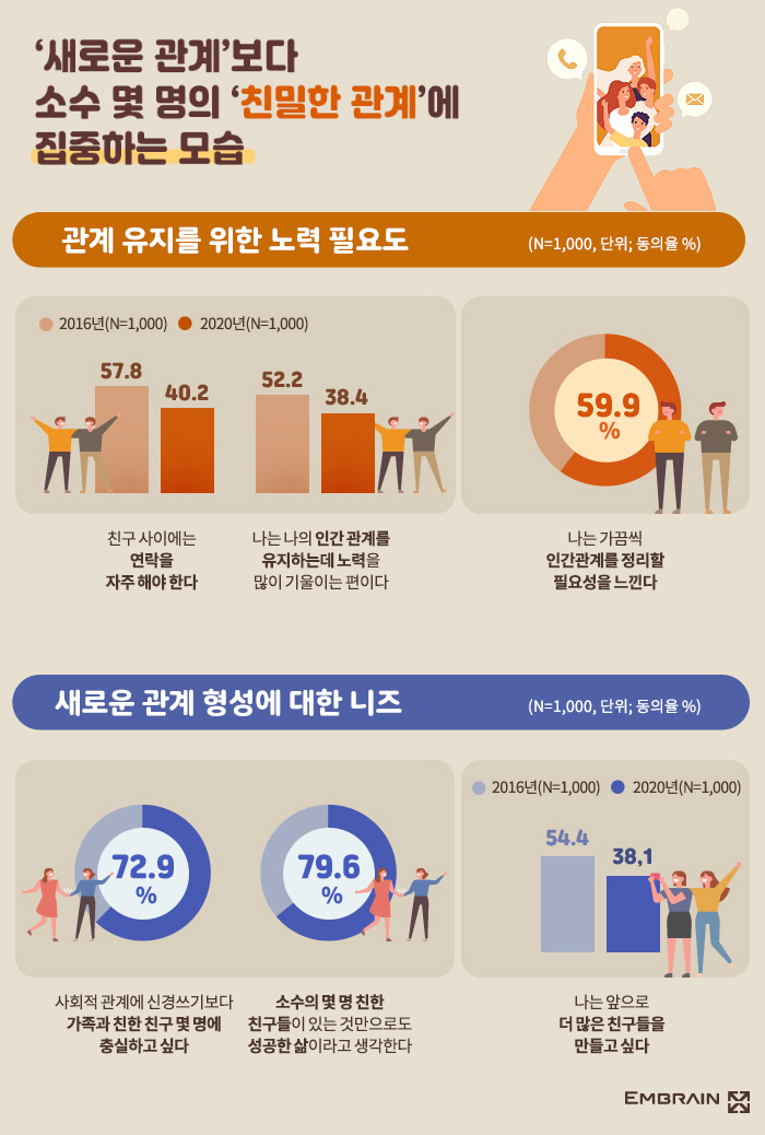 → 시장조사전문기업 엠브레인 트렌드모니터(trendmonitor.co.kr)가 SNS 활동 경험이 있는 전국 만 19세~59세 성인 남녀 1,000명을 대상으로 ‘인간관계’에 대한 인식과 ‘음성통화’ 및 ‘SNS’ 이용 관련 설문 조사를 실시한 결과, 오늘날 한국사회는 인간관계의 형성 및 유지를 위해 노력하려는 태도가 약해 보였으며, 일상적인 커뮤니케이션 수단은 음성통화에서 모바일메신저로 이동한 것으로 조사되었다. 우선 사회전반적으로 인간관계를 유지하거나 확장하려는 마음이 크지 않다는 것을 느낄 수 있었다. 전체 38.4%만이 평소 인간관계를 유지하는데 있어 노력을 많이 기울이는 편이라고 응답한 것으로, 이러한 태도가 예전보다 더욱 약해졌다(16년 52.2%→20년 38.4%)는 사실이 시사하는 바가 크다. 특히 30대~40대가 인간관계를 유지하기 위한 노력(20대 44.8%, 30대 31.6%, 40대 34.4%, 50대 42.8%)을 많이 기울이지 않는 것으로 나타났는데, 아무래도 한창 일에 치여 사는 시기인 만큼 사회생활을 시작하는 20대와 마무리하는 50대보다 주변 인간관계에 소홀할 수밖에 없다는 생각을 해볼 수 있었다. 또한 친구 사이에는 연락을 자주 해야 한다는 생각(16년 57.8%→20년 40.2%)도 많이 줄어든 모습이었다. 최근의 코로나19 사태는 인간관계를 더욱 고립시키고 있는 것으로 보여졌다. 사회적 거리 두기가 시행되다 보니 오히려 전보다 연락을 좀 더 많이 하게 된다고 말하는 사람들(26.7%)보다 요즘 인간관계가 많이 소원해진 듯한 느낌을 받고 있는 사람들(38.9%)이 많았다. 기존 인간관계를 정리하고 싶어하는 마음도 꽤 큰 것으로 나타났다. 10명 중 6명(59.9%)이 가끔씩 인간관계를 정리할 필요성을 느낀다고 속내를 밝힌 것으로, 이런 마음은 연령에 관계 없이 비슷했다. 더 나아가 현재의 삶이 팍팍해서 인간관계에까지 신경을 쓸 여력이 없다는 사람들(29.3%)도 결코 적지 않은 수준이었다.