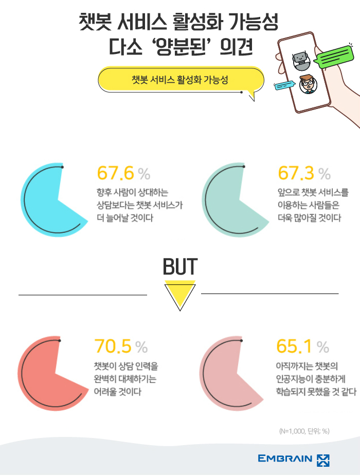 아직은 챗봇이 상담인력을 완벽히 대체하기 어려울 것이라는 전망 우세