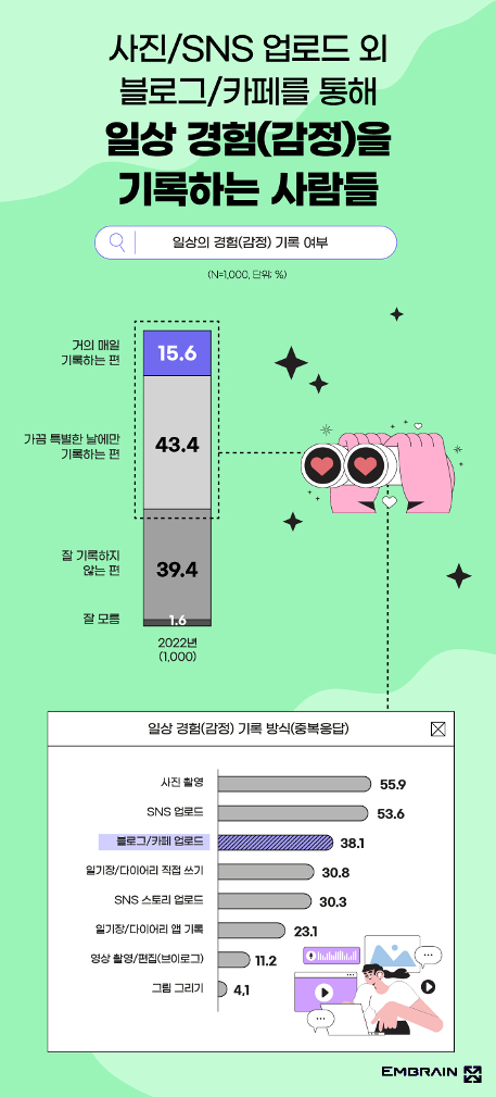한편, 작년 네이버 블로그에서 개최했던 ‘오늘일기 챌린지’에 대한 인지도(잘 알고 있음 23.2%, 잘 모름 26.1%, 전혀 모름 50.7%)는 낮은 편이었다. 하지만 향후 유사 챌린지 등에 대한 참여 의사는 60.7%로 높게 나타나고 있었다. 특히 여성(여성 67.0%, 남성 54.4%)과 저연령층(20대 70.0%, 30대 68.4%, 40대 57.2%, 40대 47.2%), 평소 일상 기록 및 공유 빈도가 높은 응답자일수록 더 많은 관심을 드러냈는데, 이를 통해 앞으로 일상 기록에 대한 높은 관심을 바탕으로 관련 시장도 더욱 성장할 것으로 전망해볼 수 있었다.