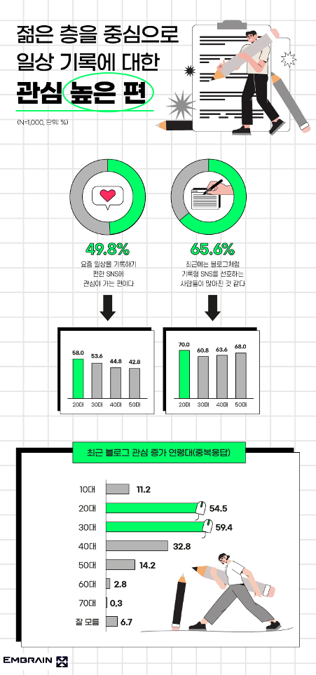 → 시장조사전문기업 엠브레인 트렌드모니터(trendmonitor.co.kr)가 현재 SNS 계정을 보유하고 있는 전국 만 19~59세 성인 남녀 1,000명을 대상으로 ‘블로그’ 이용 관련 인식 조사를 실시한 결과, 이전보다 블로그에 대한 관심이 증가한 것을 확인할 수 있었다. 전체 응답자의 10명 중 4명(42.3%, 동의율)이 최근 블로그에 대한 관심이 많아졌다고 응답했는데, 이는 코로나19의 영향(73.8%)으로 기록형 SNS를 선호하는 사람들이 많아진 점(65.6%)이 주 원인으로 보인다. 실제로 블로그는 인스타그램(69.0%, 중복응답)과 유튜브(62.6%)의 뒤를 이어 최근 이용 빈도가 높아진 것으로 나타났으며, 특히 여성(여성 44.4%, 남성 22.6%)과 저연령층(20대 32.4%, 30대 44.4%, 40대 29.2%, 50대 28.0%), SNS 헤비 유저(게시물 주기적 업로드 45.8%, 게시물만 보는 편 27.9%, 계정만 보유 27.5%)일수록 상대적으로 블로그 이용 빈도가 좀 더 잦은 특징을 보였다. 전체 응답자의 10명 중 8명(81.6%)은 블로그 계정을 개설해둔 상태라고 응답했는데 이 중 38.8%는 1년 이내 포스팅 경험도 있는 것으로 나타나 최근 블로그에 대한 높아진 관심을 실감하게 했다. 주로 일상/생각(45.9%, 중복응답), 맛집/카페 리뷰(37.6%) 등의 게시물을 월 1~3회 정도(26.0%) 업로드 한다는 응답이 많은 편이었다. 블로그에 대한 높아진 관심은 일상 기록에 용이하고(65.7%, 중복응답) 나중에 돌아보기 편리하다는 장점(55.1%)이 크기 때문인 것으로 나타났다. 특히 2030 젊은 세대를 중심으로 말 못할 고민 등의 진솔한 모습을 기록할 수 있고(20대 24.2%, 30대 21.2%, 40대 20.9%, 50대 19.0%) 다른 SNS보다 텍스트 위주로 기록할 수 있어서라는 응답(20대 27.4%, 30대 28.9%, 40대 7.0%, 50대 14.3%)도 소폭 높은 특징을 보였다.