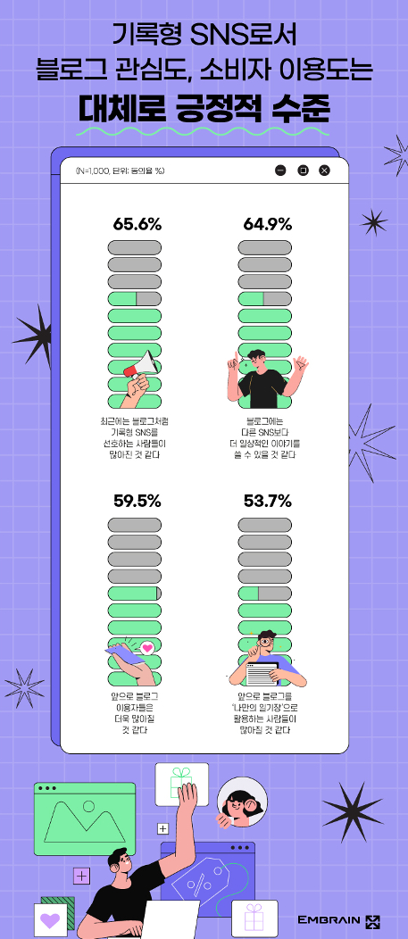 이 밖에도 블로그엔 나만의 개성을 드러낼 수 있을 것 같고(70.2%, 동의율), 다른 SNS보다 더 일상적인 얘기를 쓸 수 있을 것 같다(64.9%)는 응답이 나타났으며, 나의 정체성을 드러내기에 용이하고(59.0%) 다른 SNS보다 더 솔직하고 진솔한 이야기를 쓸 수 있을 것 같다는 긍정 인식(54.6%)도 높은 편이었다. 실제로 최근 주변에서 블로그 포스팅 비율이 높아진 것 같다는 응답(43.9%, 동의율)을 통해 보다 진실된 모습을 공유할 수 있는 블로그로 자연스레 관심이 전환되고 있음을 유추해볼 수 있었다.