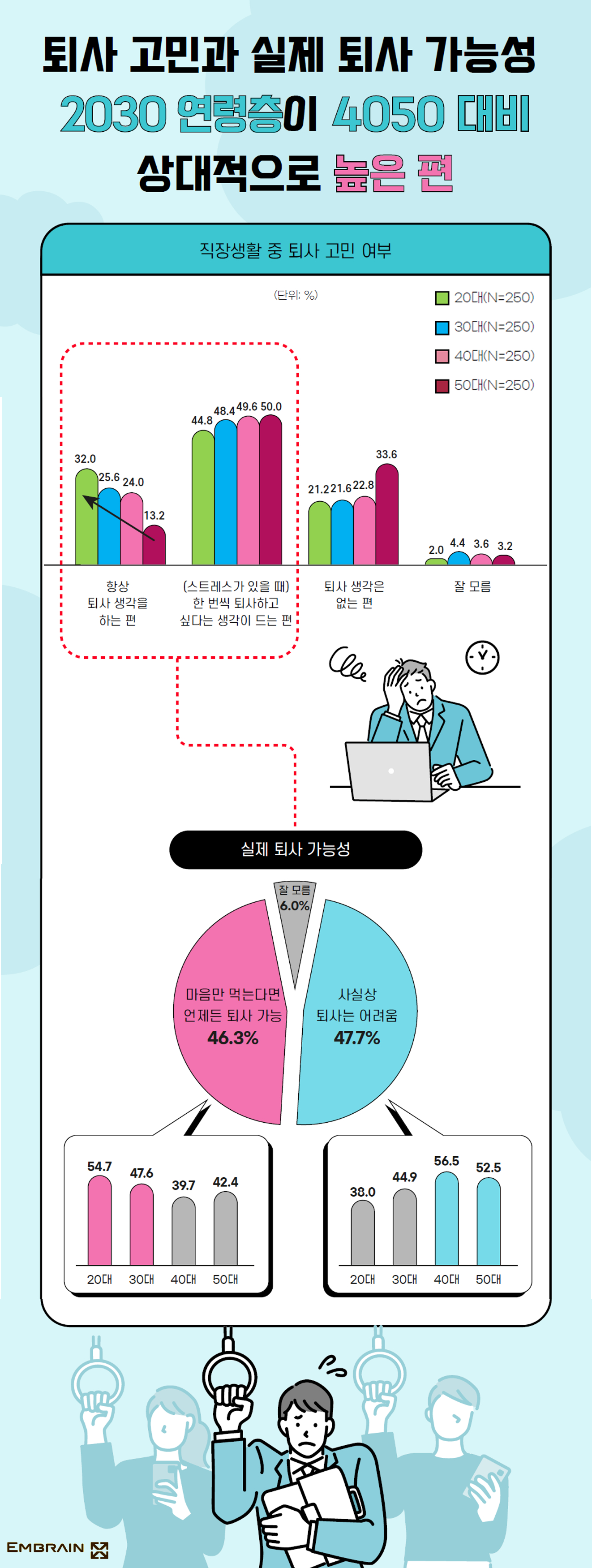 → 한편, 최근 2030세대의 조기 퇴사를 바라보는 시선은 부정적이지만은 않은 모습이었다. 전체 응답자의 10명 중 4명(44.1%)이 최근 부쩍 퇴사 고민이 많아졌다고 응답했는데, 어차피 직장생활만으로는 충분한 돈을 모을 수 없는 사회적 현실을 이해하기 때문인 것(20대 58.0%, 30대 58.4%, 40대 54.4%, 50대 60.0%)으로 짐작해볼 수 있었다. 특히나 연령과 직급이 낮은 응답자일수록 주변인이나 직장 동료의 퇴사를 부러운 시선으로 바라보거나(20대 60.4%, 30대 56.4%, 40대 46.4%, 50대 43.2%) 오히려 축하해주는 분위기라는 응답(20대 61.6%, 30대 52.0%, 40대 35.6%, 50대 28.4%)이 높게 나타나, 저연령층의 경우 퇴사를 실패나 퇴보가 아닌 ‘새로운 도약’으로 인식하고 있음을 읽어볼 수 있었다. 물론 연령이나 직급이 높은 50대 응답자의 경우 조기 퇴사에 회의적인 시선을 드러내고 있었다. 높은 경쟁률을 뚫고 들어간 직장을 쉽게 퇴사하는 젊은 세대가 잘 이해되지 않고(20대 27.6%, 30대 26.8%, 40대 38.8%, 50대 52.8%) 요즘 젊은 직장인들은 계획 없이 퇴사를 결정하는 것 같다(20대 22.8%, 30대 32.0%, 40대 40.4%, 50대 50.0%)며 ‘퇴사’를 ‘무모한 도전’쯤으로 바라보는 시선이 많았던 것으로, 연령에 따라 ‘퇴사’를 바라보는 시선이 어떻게 다를 수 있는지를 단적으로 보여주는 결과라 할 수 있겠다.