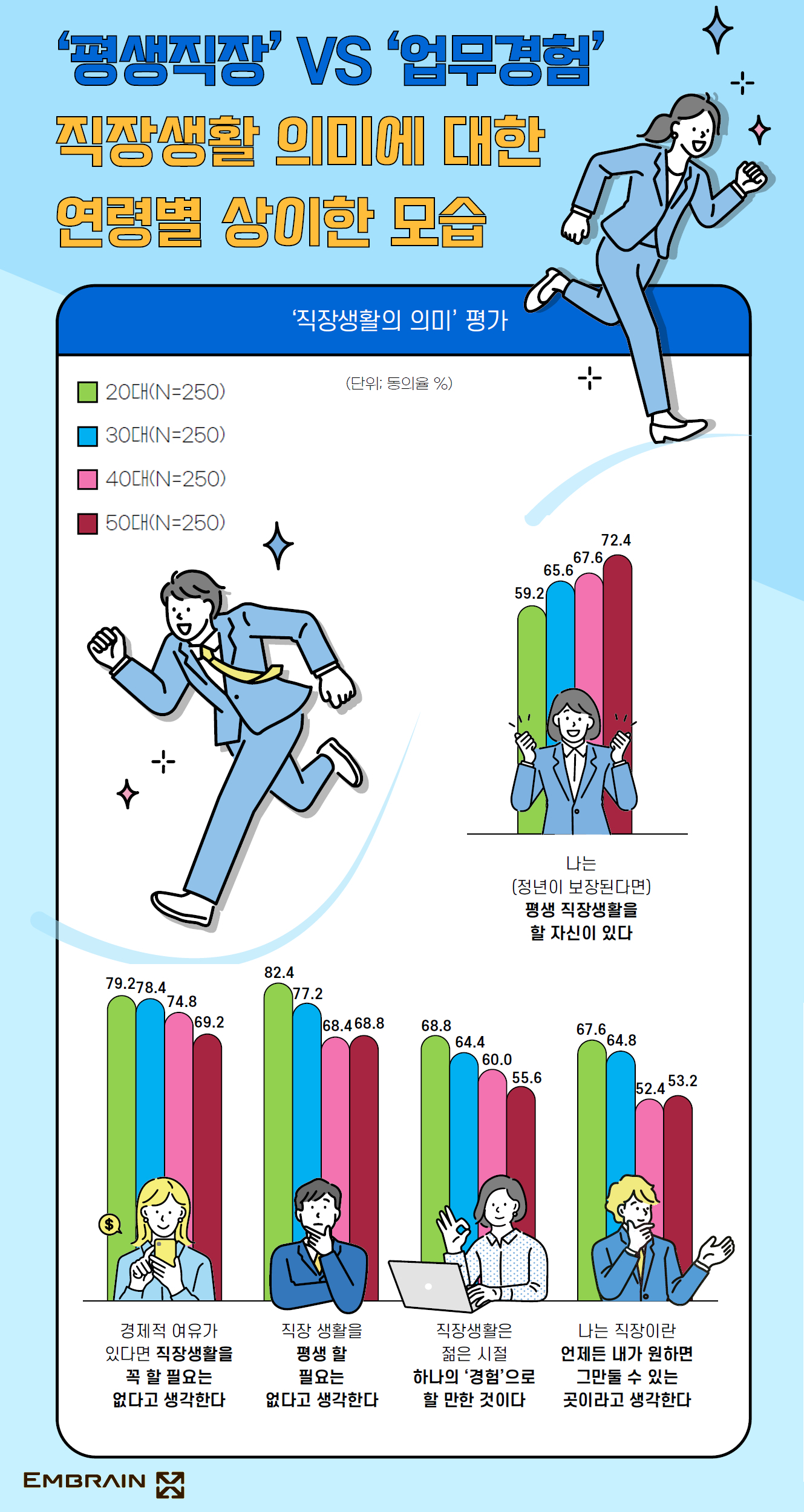 반면, 2030세대의 태도는 달랐다. 이들의 경우 직장생활에 큰 의미를 두지 않는 경향이 더 강했는데, 경제적인 여유만 된다면 직장생활을 꼭 해야 할 필요는 없는 것 같고(20대 88.4%, 30대 87.6%, 40대 82.0%, 50대 80.0%) 직장생활을 평생 해야 할 필요도 없는 것 같다(20대 82.4%, 30대 77.2%, 40대 68.4%, 50대 68.8%)는 응답이 높게 나타났다. 직장을 단순 경험의 일환이자 언제든 그만둘 수 있는 곳으로 인식하고 있는 것이었다. 물론 세대별 모두 공통적으로 경제적 여유가 뒷받침되지 않는다면 당장 퇴사하긴 어렵고(20대 82.8%, 30대 86.8%, 40대 85.6%, 50대 90.0%) 퇴사 이후 계획이 명확하지 않다면 성급한 퇴사는 힘든 일(20대 76.0%, 30대 79.6%, 40대 82.4%, 50대 86.4%)이라는 높은 수준의 응답을 살펴볼 때, 전반적으로 퇴사를 쉽게 결정하는 경우는 많지 않다는 점도 엿볼 수 있었다.