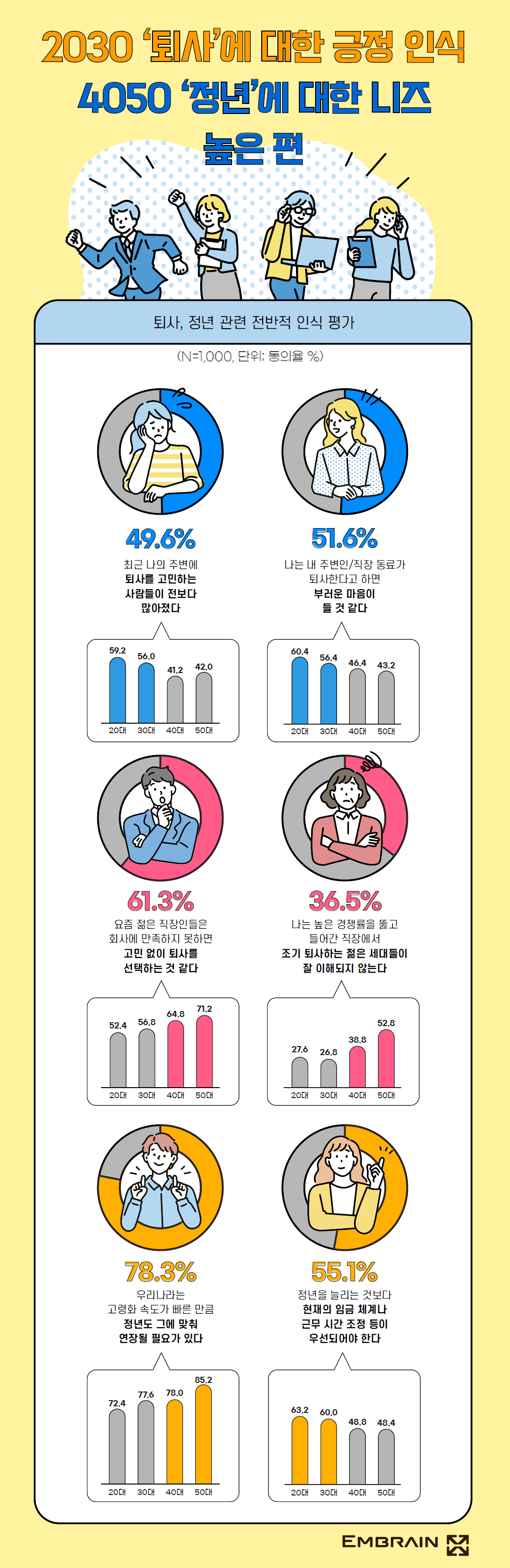 → 더불어 청년 세대의 조기 퇴사 이슈를 바라보는 데에 있어 연령별 구분 없이 사회 구조적 문제를 주요 원인으로 염두하고 있는 점 역시 주목해볼 만한 결과였다. 2030세대의 조기 퇴사 현상이 워라밸과 삶의 자유를 추구하는 태도(60.2%)나 조직보다 개인의 삶을 중요시 여기는 세대적 특성(54.4%)이 많이 반영되는 것은 맞지만, 결국 사회와 기업에 그 책임이 있다는 인식이 연령에 관계없이 모두 높게 나타나고 있었던 것이다. 아무래도 조기 퇴사 증가의 주요 원인으로 수직적이고 권위적인 조직 문화(43.2%)나 만족스럽지 못한 급여 수준(35.5%), 조직에 헌신해야 한다는 압박감(35.1%) 등 사회 구조적인 문제가 지적되고 있는 점과 무관하지 않아 보이는 결과로, 실제 기업 차원에서도 젊은 직장인들의 조기 퇴사 증가는 심각하게 바라봐야 할 문제(81.0%, 동의율)인 만큼 장기적 기업 비전 제시(79.8%), 복지 제도 확충(79.7%), 수평적 조직 문화 구축(71.8%) 등을 위해 노력해야 한다는 점을 드러내고 있었다.
