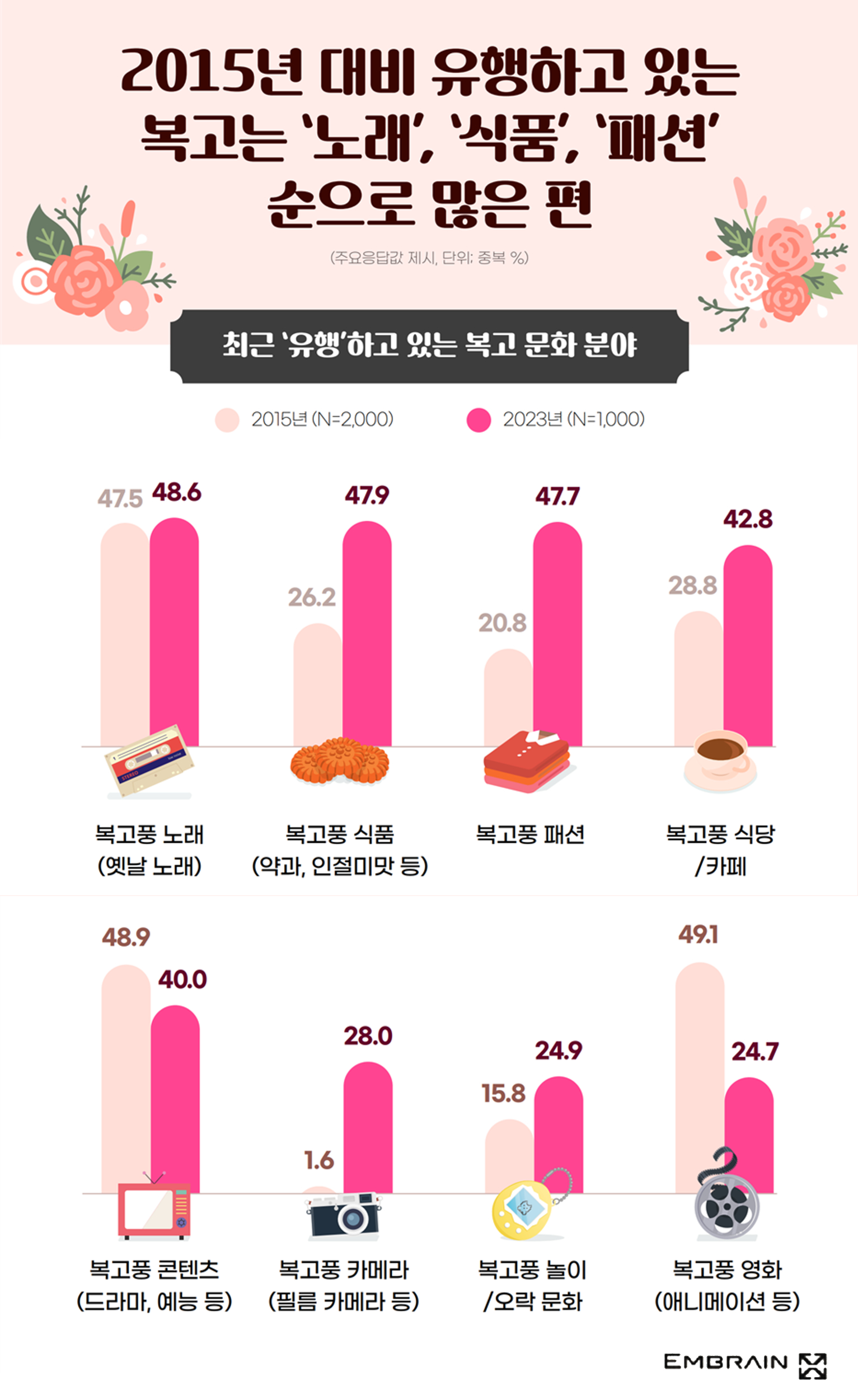 복고 문화 중 대중 소비자들의 호감을 얻고 있는 유형으로는 복고풍 식품(43.9%, 중복응답)과 복고풍 노래(40.1%), 복고풍 콘텐츠(34.8%)를 언급하는 경우가 많았으며, 복고풍 패션(27.7%)이 그 뒤를 이었다. 최근 레트로 문화가 식품, 음악, 콘텐츠, 패션 등 다양한 분야에서 유행하고 있음을 살펴볼 수 있는 결과로, 과거 2015년의 복고 문화가 음악, 영화, 드라마 등 ‘콘텐츠’ 산업 위주로 성행했던 것과 달리, 최근의 복고문화는 더욱 다양한 분야로 확산되고 있다는 점이 특징적이었다(하단 그래프 참조). 특히 복고풍 식품(22.6%(2015) → 43.9%(2023))과 복고풍 패션(14.8%(2015) → 27.7%(2023)), 복고풍 카메라(2.8%(2015) → 13.8%(2023))에 대한 호감도가 이전에 비해 크게 증가한 점이 눈에 띄는 결과였다.