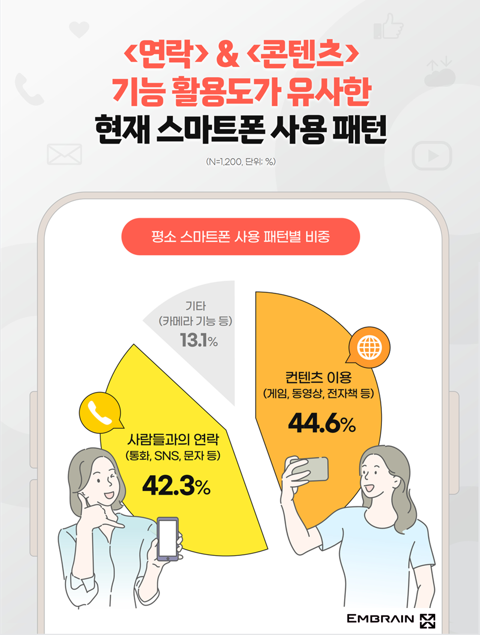 - 스마트폰 이용 시 44.6% ‘컨텐츠 시청’, 42.3%, ‘연락’