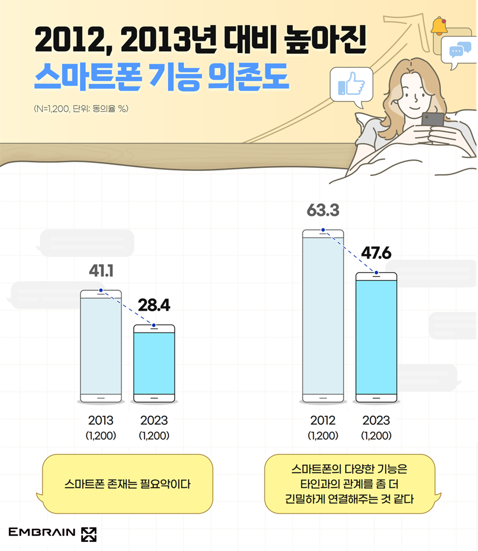 → 한편, 스마트폰 활용도가 점차 높아짐과 동시에 스마트폰에 의존하는 경향 또한 뚜렷해지고 있는 모습을 확인할 수 있었다. 우선, 평소 스마트폰 사용 시 통화나 SNS 등 기본적인 연락(42.3%)을 위해 사용하는 것과 비슷한 비율로 게임, 동영상 등 컨텐츠 시청(44.6%)에 사용하고 있는 것으로 나타났다. 이 때문인지 10년 전 동일 조사 대비 3GB 미만 데이터 이용률(69.3%(2013) → 18.4%(2023))이 크게 감소한 반면 100GB 이상의 무제한 데이터 이용률은 비교적 높은 수준임을 확인할 수 있었다(3GB 이상–10GB 미만 27.4%, 10GB 이상-30GB 미만 17.8%, 100GB 이상-무제한 17.8%, 50GB 이상-100GB 미만 8.1%). 아울러 스마트폰의 다양한 기능이 타인과의 관계를 좀 더 긴밀하게 연결해 주는 것 같다(63.3%(2012) → 47.6%(2023))는 응답이 이전 조사 대비 한층 낮아진 모습을 보여, 이제는 스마트폰이 단순 통화 수단을 넘어 라이프스타일 전반에 영향을 미치고 있음을 짐작해 볼 수 있었다. 단, 전체 응답자 10명 중 4명(44.7%)이 요즘 스마트폰을 멀리해야 할 필요성을 느낀다고 응답할 정도로 스마트폰 의존도가 높게 평가된 점은 생각해 볼 만한 결과였다. 일상생활에서의 스마트폰 사용이 익숙해진 만큼, 지나친 사용에 대해 어느 정도 불안함을 느끼고 대중소비자들의 모습을 살펴볼 수 있는 결과였다.