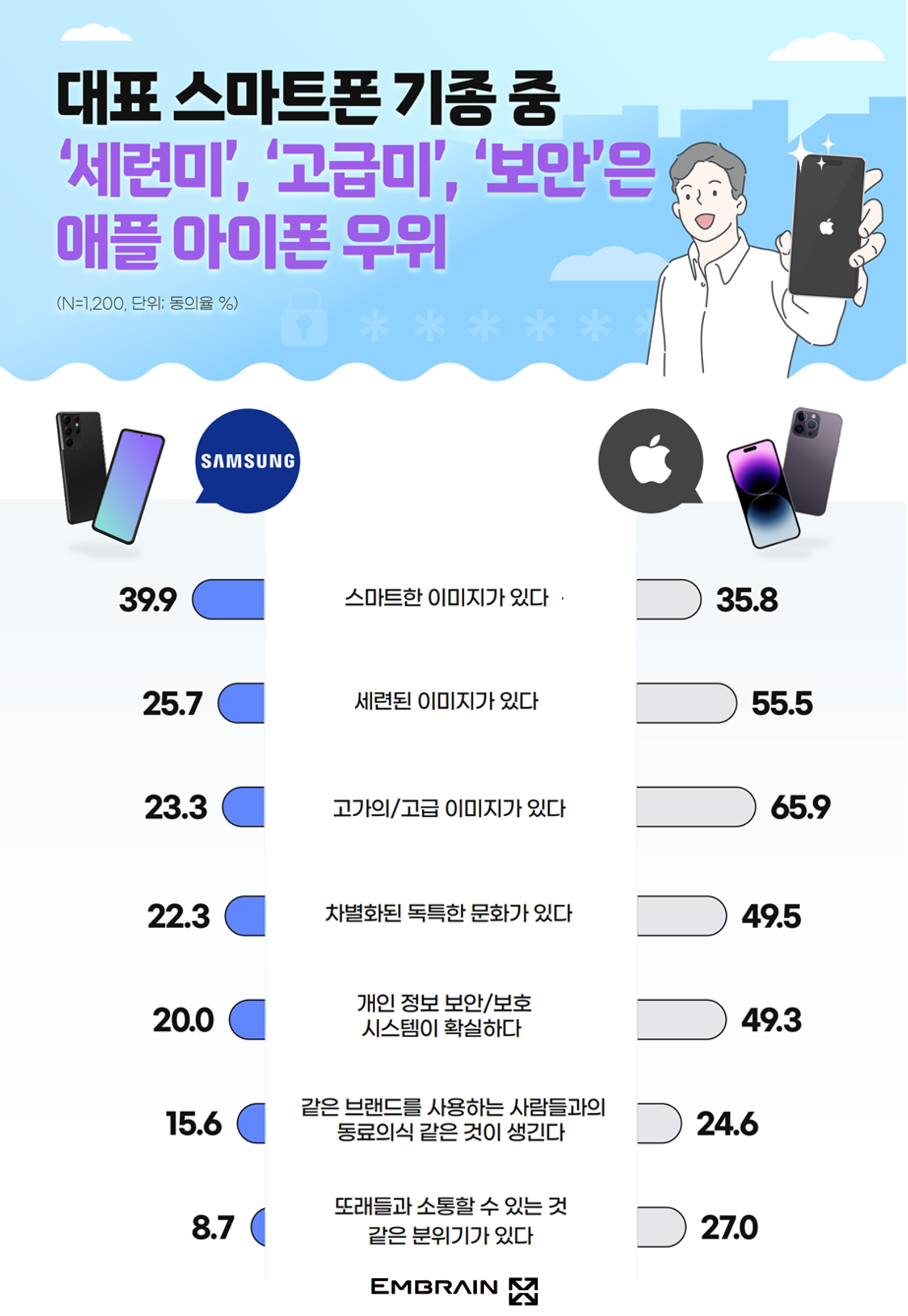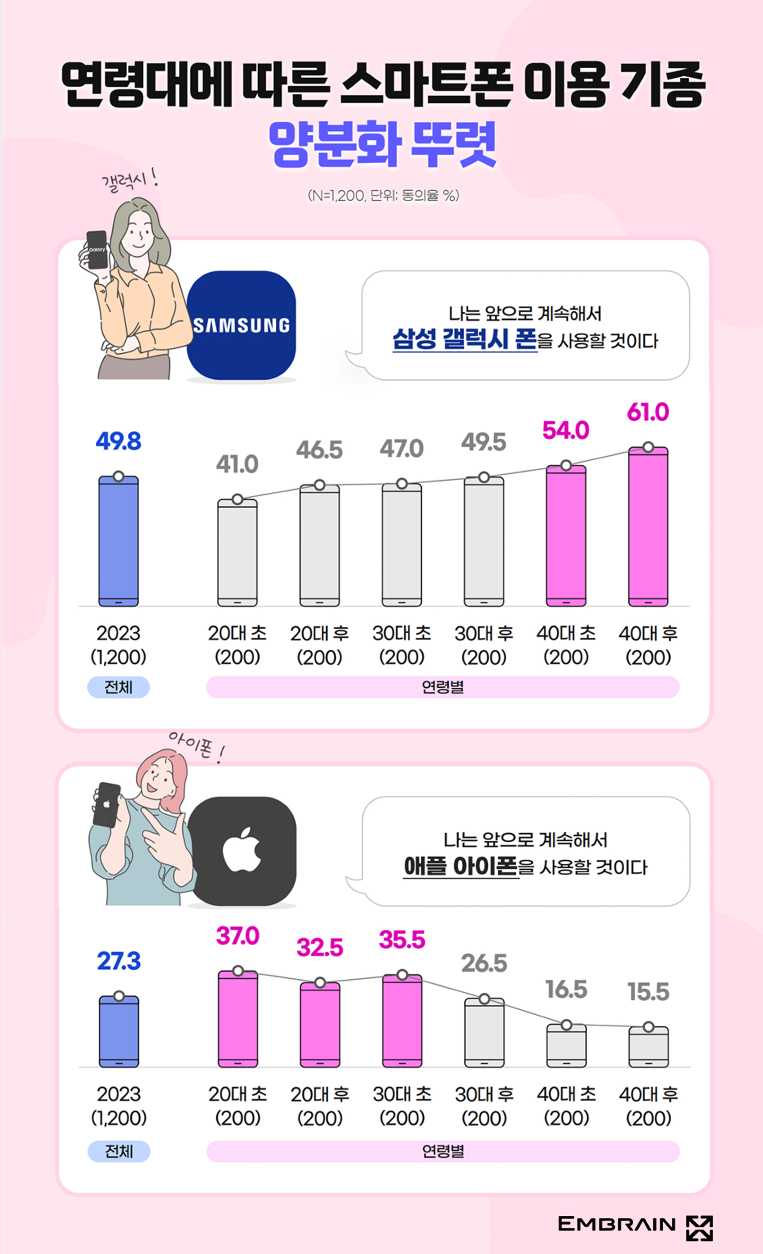 → 시장조사전문기업 엠브레인 트렌드모니터(trendmonitor.co.kr)가 전국 만 19~49세 성인 남녀 1,200명을 대상으로 ‘삼성 갤럭시 vs 애플 아이폰 브랜드 이미지 관련 조사’를 실시한 결과, 일상생활에서 스마트폰 의존도가 높아지고 있는 가운데, 연령별로 선호하는 스마트폰 기종에 뚜렷한 차이가 있는 것으로 조사되었다.