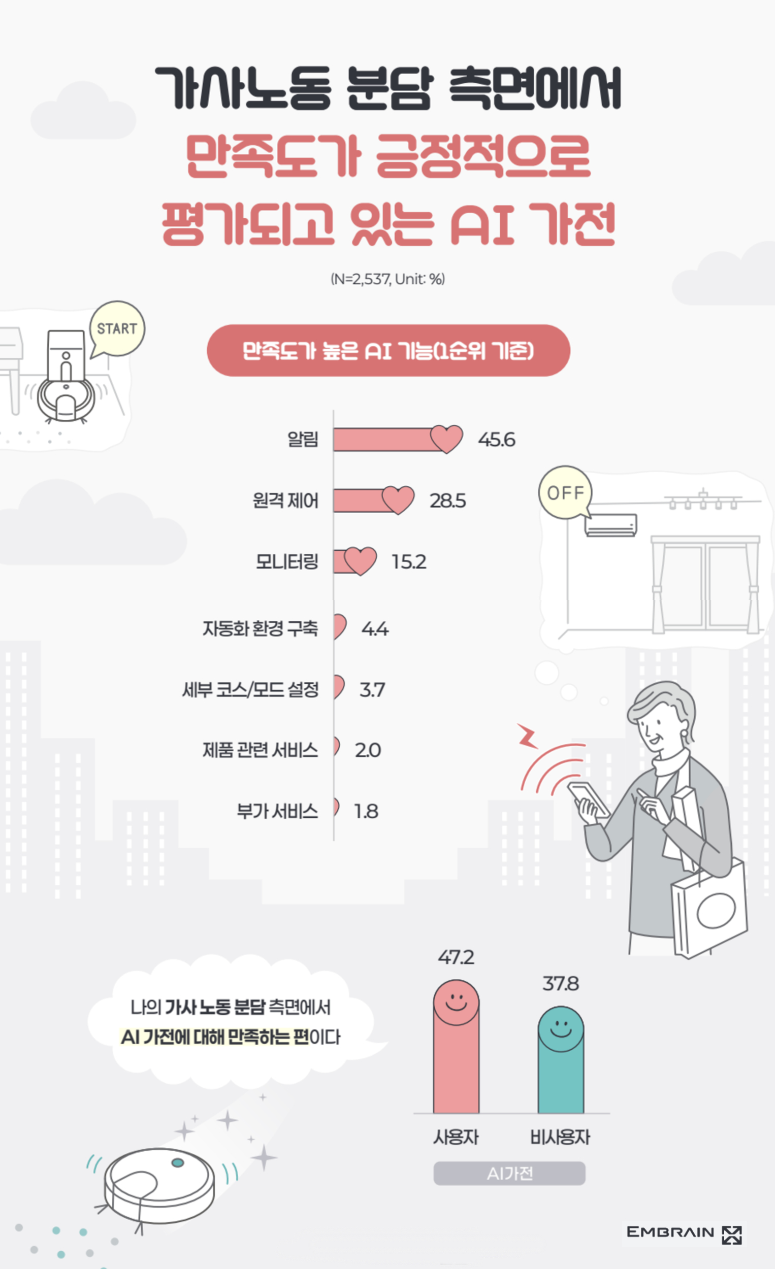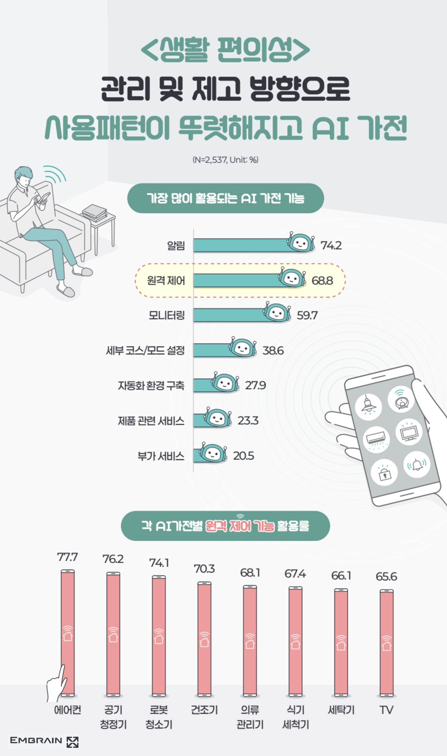 → 시장조사전문기업 엠브레인이 최근 1년 이내 AI 가전 구매 및 이용 경험이 있는 만 20~64세 성인 남녀 2,537명을 대상으로 ‘AI 가전 소비자 인식 조사’를 실시한 결과, 일상생활에서 AI 가전에 대한 만족도가 높게 평가된 가운데, AI 기능을 자신의 라이프스타일에 맞춰 활용하고 있는 모습을 확인할 수 있었다. 특히, 원격 제어·가족 내 연동 기능 등을 통해 보다 효율적인 일상생활이 가능해지고 있는 것으로 조사되었다.