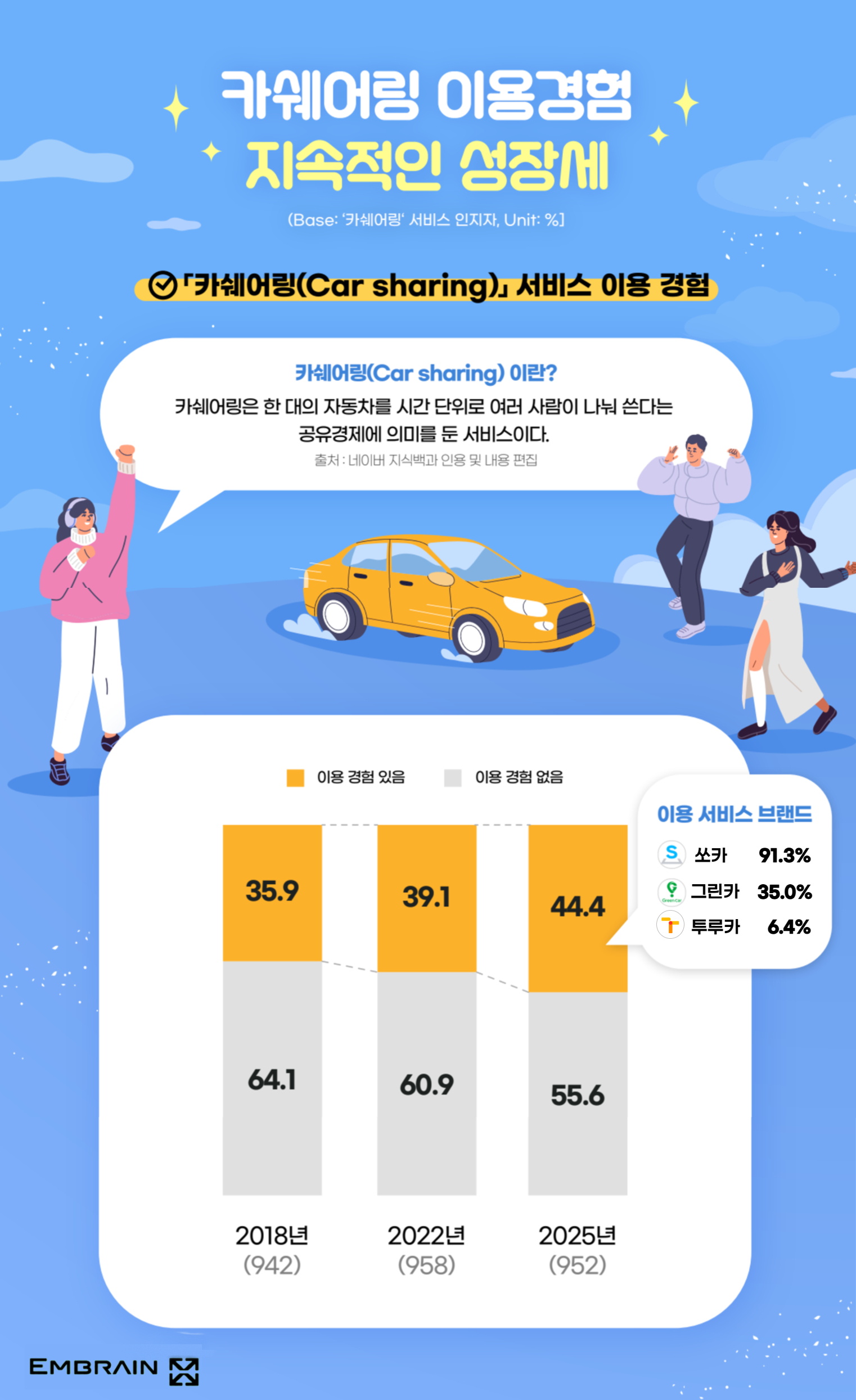 → 시장조사전문기업 엠브레인 트렌드모니터(trendmonitor.co.kr)가 전국 만 19~59세의 운전면허 소지 남녀 1,000명을 대상으로 ‘2025 카쉐어링 관련 U&A& 조사’를 실시한 결과, 차량을 소유하지 않고 여러 사람이 함께 사용하는 공유경제 기반의 ‘카쉐어링’ 서비스의 필요성이 높게 평가되고 있는 모습을 확인할 수 있었다.