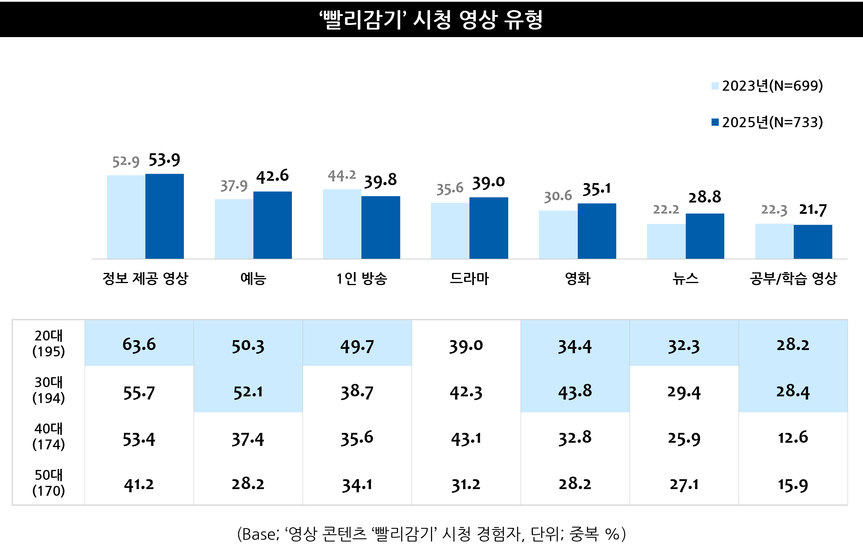 → 영상 시청 시 ‘빨리감기’를 선호하는 경향이 강해지면서, 더 다양한 장르를 더 빠른 속도로 시청하는 경우가 많아지고 있는 것으로 나타났다. 우선, 평소 ‘빨리보기’ 방식으로 시청하는 콘텐츠 유형으로 정보 제공 영상(53.9%, 중복응답)을 언급하는 경우가 가장 많았는데, 예능이나 드라마, 영화, 뉴스 등의 장르에서 빨리감기 시청 경험이 한층 높아진 모습을 보인 점이 주목할 만한 결과였다(하단 그래프 참조). 콘텐츠 종류에 관계없이 배속 시청이 확산되고 있다는 점에서, 작품의 몰입감이나 예술성보다는 시간 효율을 우선시하는 태도가 보다 일상화되고 있음을 재확인할 수 있는 대목이었다. 특히, 저연령층일수록 다양한 콘텐츠를 빨리감기로 시청하는 경향이 두드러진 편이었는데, 이들 세대는 어릴 때부터 학습이나 여가 등 다양한 정보를 영상을 통해 습득해온 만큼, 짧은 시간 안에 쉽게 콘텐츠를 소비하는 방식을 더욱 선호하는 것으로 풀이된다. 또한 빨리감기 시청 빈도가 잦을수록, 정보수집용 영상은 대부분 빨리감기로 보는 경향이 강한 편이었고(빨리감기 시청하는 편 64.4%, 잘 안하는 편 48.3%, 경험 없음 13.5%), 예술성이 강한 작품도 배속 시청하는 경우가 많은 특징을 보였다(빨리감기 시청하는 편 22.9%, 잘 안하는 편 11.9%, 경험 없음 3.7%).