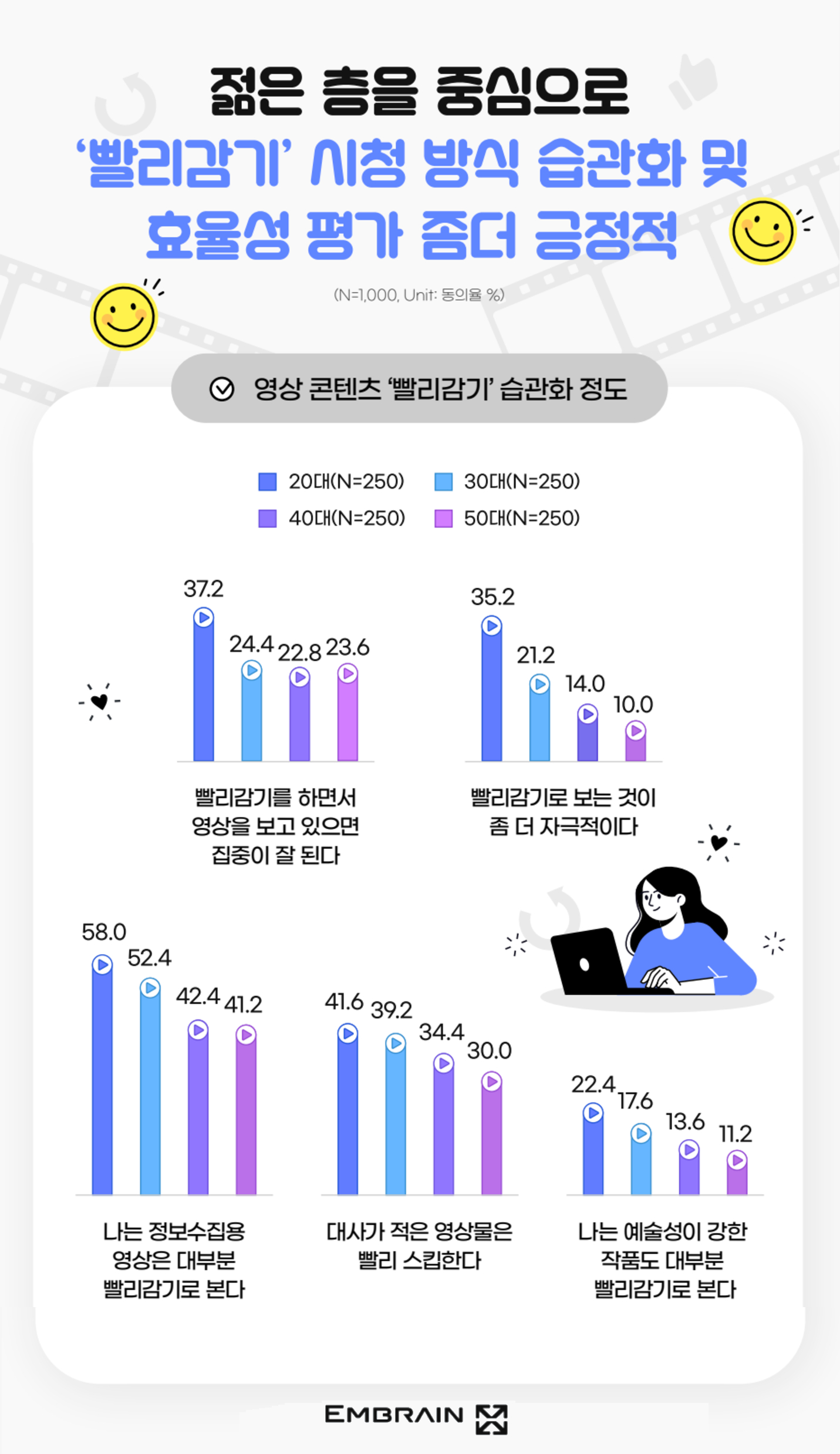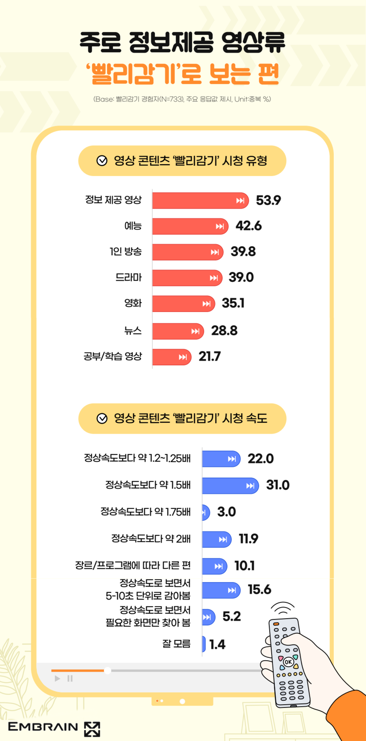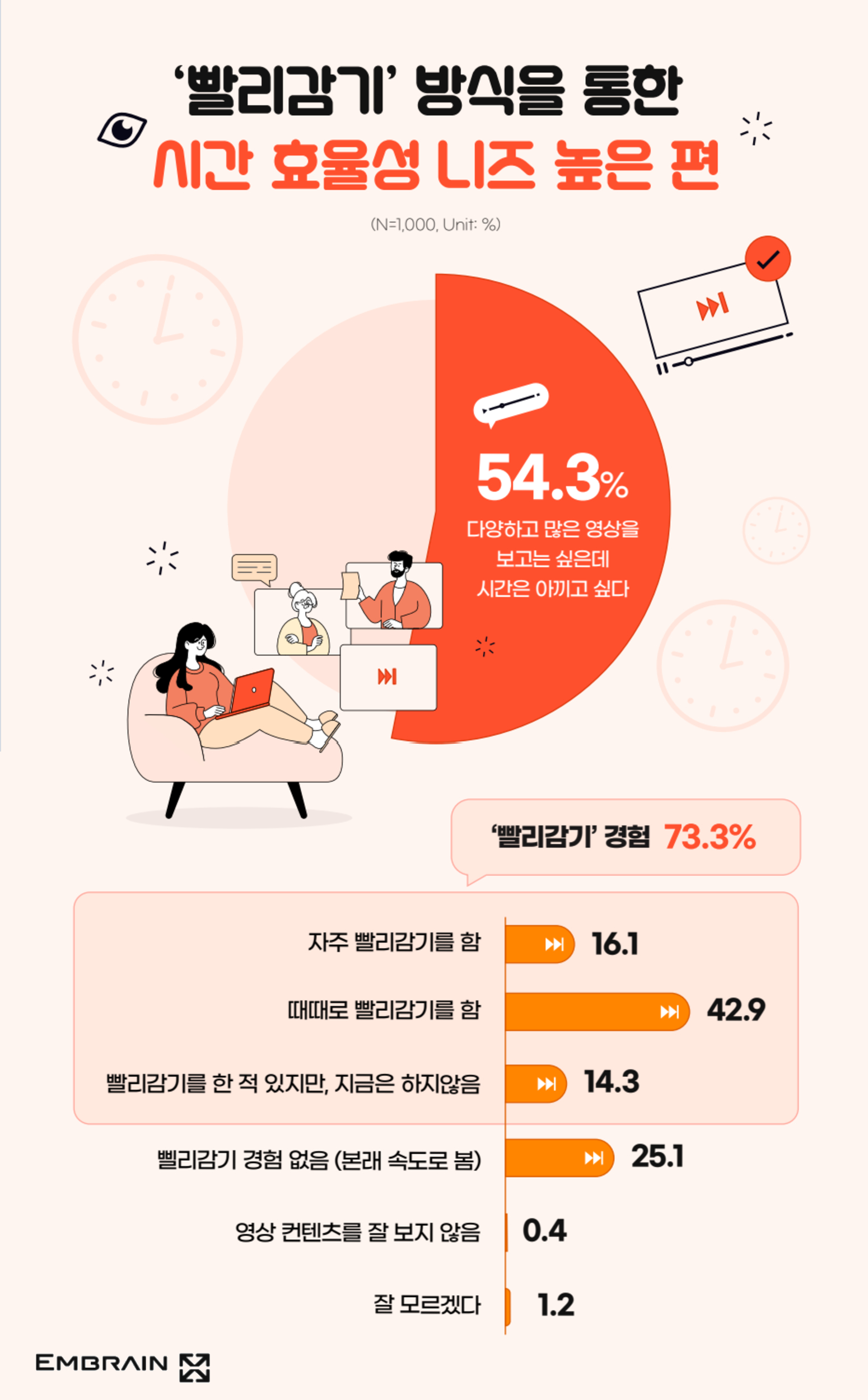 → 시장조사전문기업 엠브레인 트렌드모니터(trendmonitor.co.kr)가 전국 만 19~59세 남녀 1,000명을 대상으로 ‘2025 영상 콘텐츠 ‘빨리감기’ 시청 습관 관련 조사’를 실시한 결과, 한정된 시간 안에 더 많은 영상을 소비하려는 니즈가 높아지면서, ‘빨리감기’가 시간 대비 만족도를 높이는 효율적인 시청 방식으로 자리 잡고 있는 것으로 조사되었다.