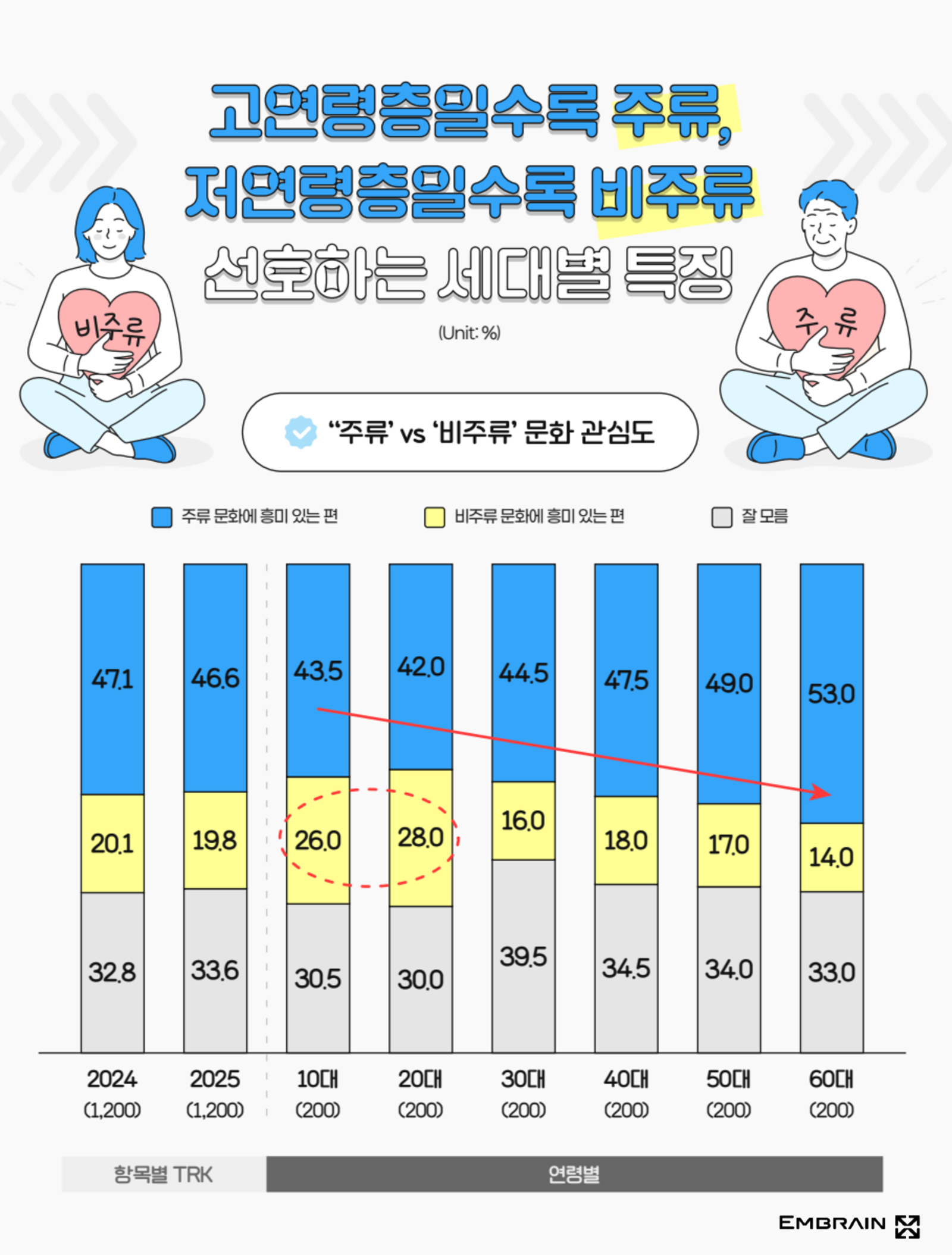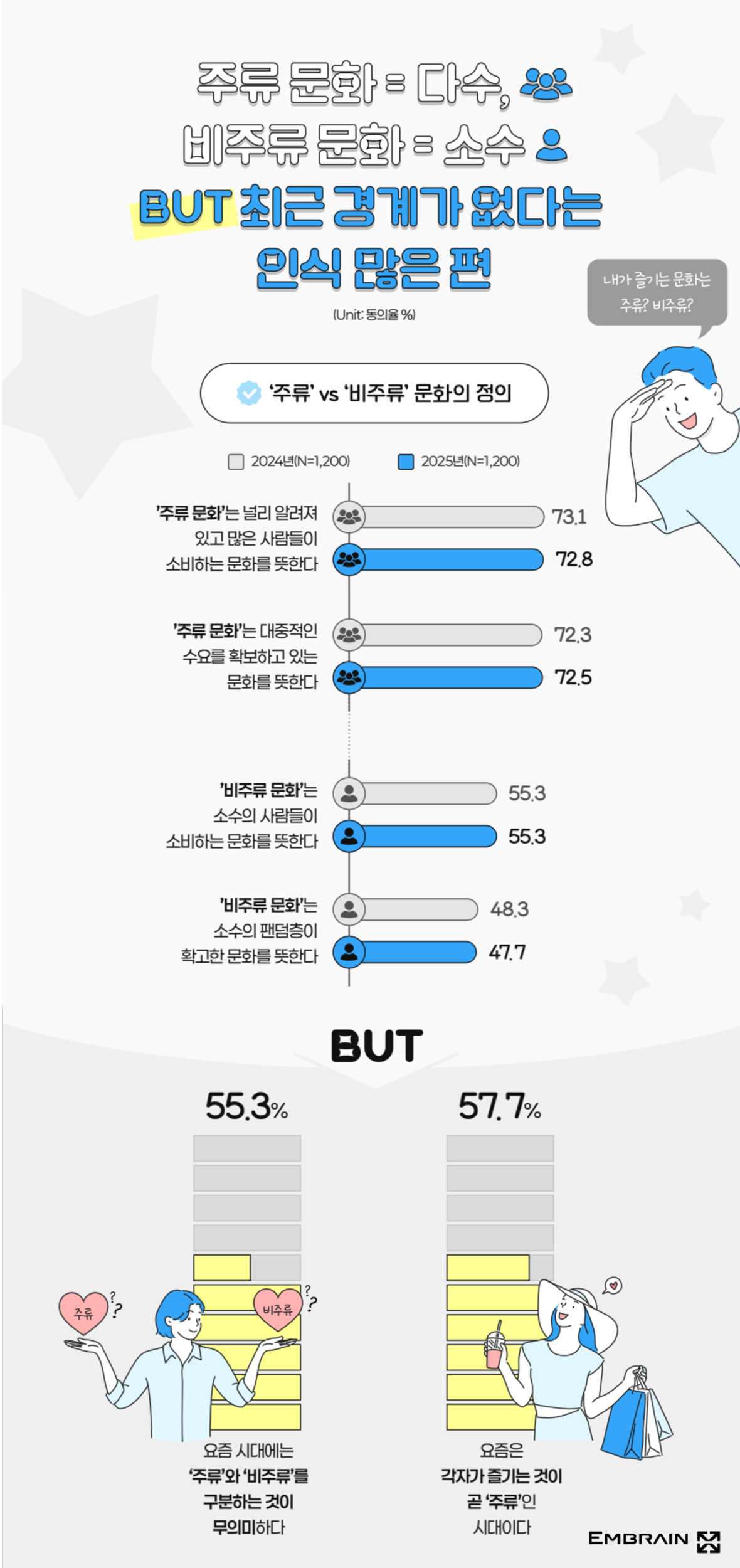→ 시장조사전문기업 엠브레인 트렌드모니터(trendmonitor.co.kr)가 전국 만 13~69세 남녀 1,200명을 대상으로 ‘2025 주류 vs 비주류 문화 관련 인식 조사’를 실시한 결과, ‘주류’와 ‘비주류’ 문화의 경계가 점점 희미해지면서, 개인의 취향과 만족감을 우선시하는 경향이 두드러지고 있는 것으로 조사되었다. 아울러 ‘비주류’ 문화가 더 이상 마이너한 관심사로만 여겨지지 않고, 새로운 트렌드를 이끄는 하나의 흐름으로 받아들여지고 있는 모습까지 살펴볼 수 있었다.