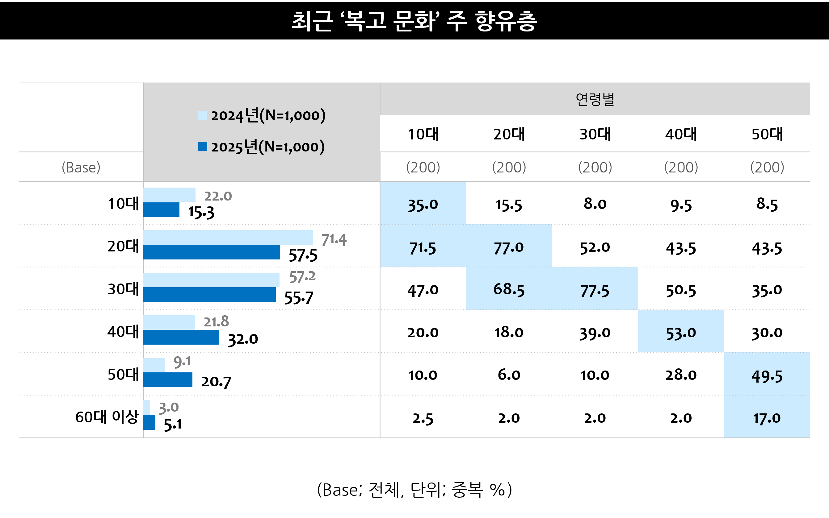 → 대중소비자들은 지금 시대에서 느낄 수 없는 가치를 복고 문화에서 찾고 있는 모습을 보였다. 우선, 전체 응답자의 상당수가 옛 것이 가지고 있는 사소한 ‘불편함’이 요즘에는 오히려 낭만적으로 다가오는 것 같다(73.7%, 동의율)는 데에 공감을 내비쳤으며, 과거의 아날로그적인 여유로운 삶에 그리움을 느끼는 경향(74.1%)도 강한 편이었다. 아울러 지금과 같은 AI 시대에는 옛 것이 가지고 있는 ‘진정성’을 찾으려는 사람들이 많아질 것 같다(67.7%, 동의율)는 전망도 높게 평가되고 있었다. 결국, AI 기술이 일상에 깊숙하게 들어올수록, 오히려 옛 감성과 진정성을 강조한 콘텐츠가 차별화된 트렌드로 부상할 가능성이 높다는 점을 짐작해 볼 수 있었다. 특히, 저연령층에서 고연령층 못지않게 과거를 좀 더 ‘낭만적이고’(10대 81.5%, 20대 78.5%, 30대 76.5%, 40대 85.0%, 50대 80.0%), ‘열정적인’ 시대로 인식하는 경향(10대 61.0%, 20대 52.0%, 30대 51.0%, 40대 54.0%, 50대 56.0%)을 보인 점이 주목할 만한 결과였다. 경쟁사회에서 자라온 이들 세대는 상대적으로 ‘낭만’, ‘열정’ 등의 가치를 쉽게 경험하지 못했던 만큼, 이에 대한 결핍이 과거 시절에 대한 부러움으로 표출되고 있는 것으로 풀이된다. 실제로 복고 문화를 주로 향유하는 연령층으로 2030세대를 꼽은 비율이 높게 나타나, 젊은 세대가 복고 트렌드의 주요 소비층으로 자리잡고 있는 모습까지 살펴볼 수 있었다(하단 그래프 참조). 과거 고연령층에게 익숙했던 복고 문화가 특정 세대에 국한되지 않고 전 세대로 확대되고 있음을 엿볼 수 있는 대목이었다. 앞으로 복고(레트로) 문화를 즐기는 세대 경계는 더욱 흐려질 것 같다(55.6%, 동의율)는 인식도 적지 않아, 향후 복고 문화가 세대를 잇는 트렌드로 확산될 가능성도 높아 보인다.