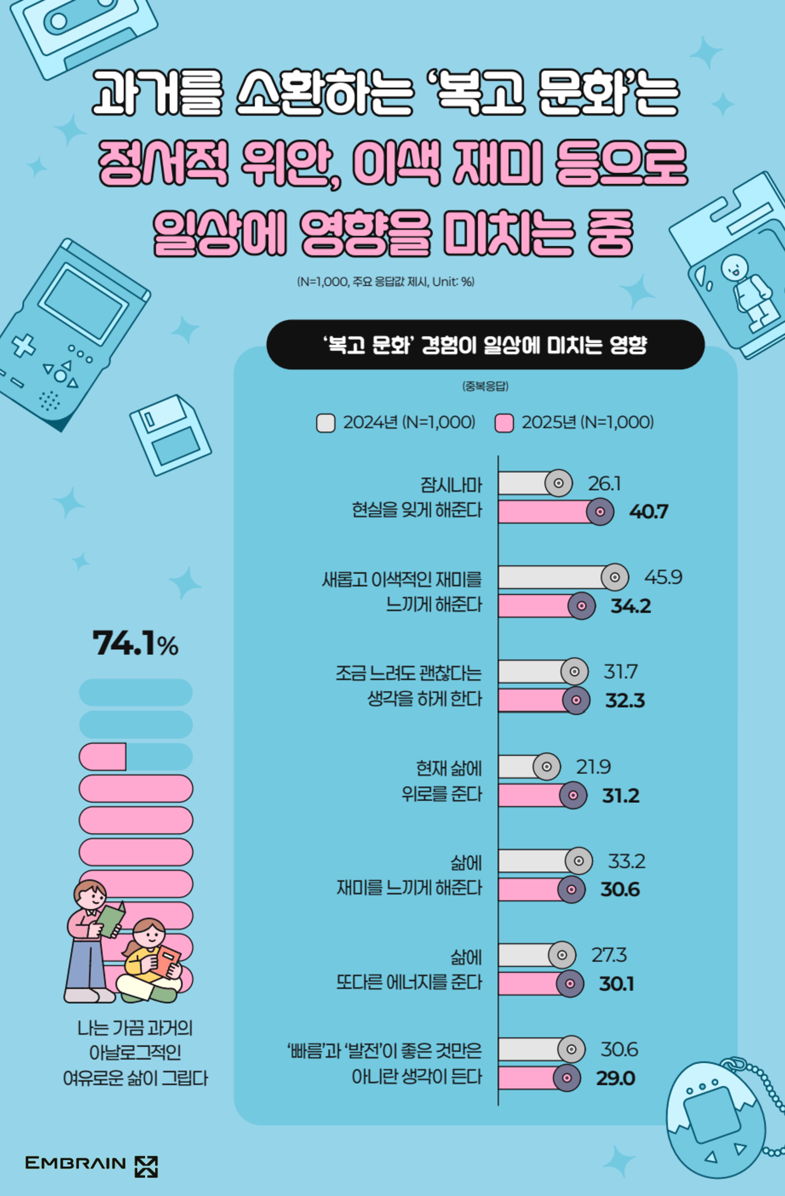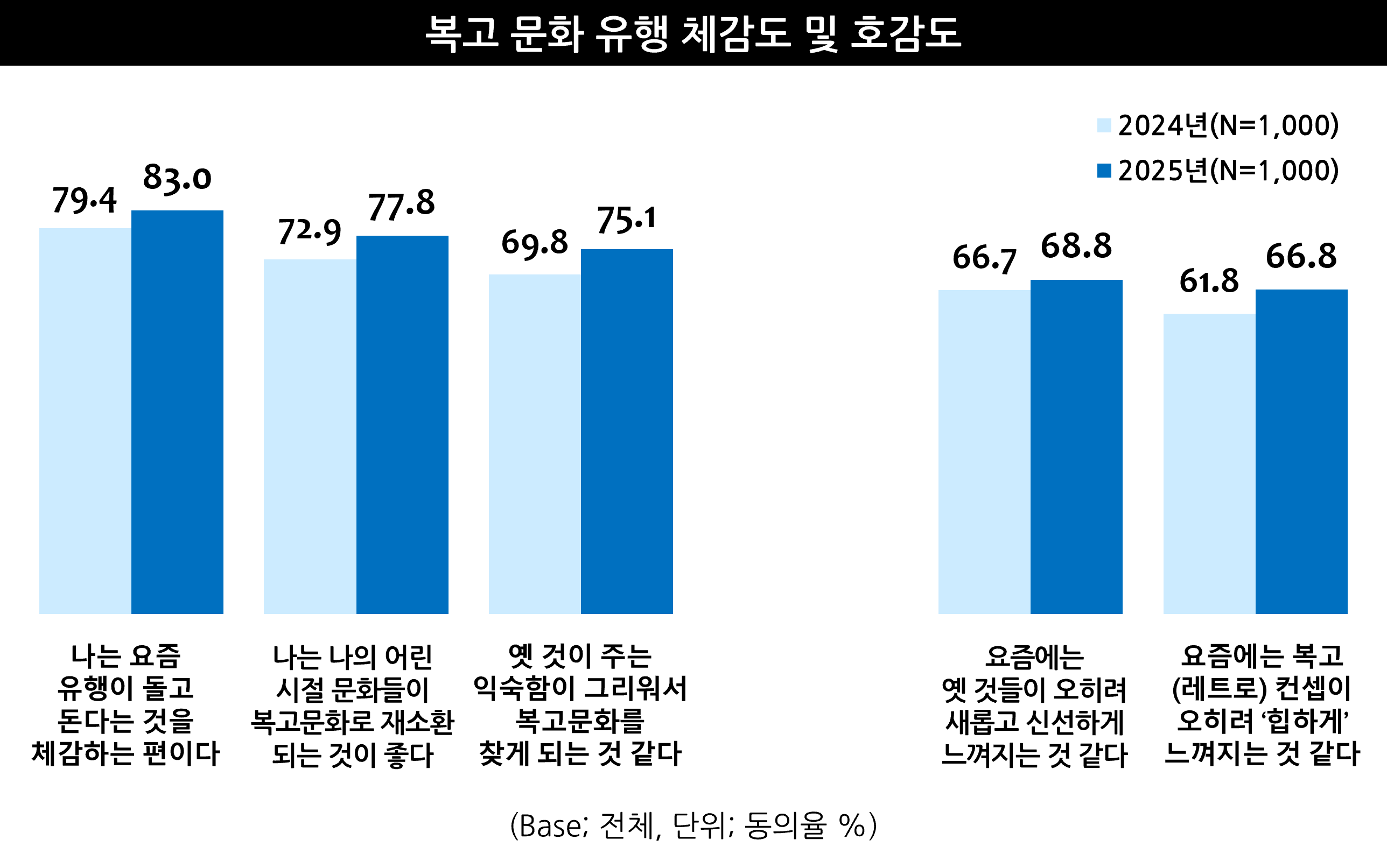 우선, 전체 응답자의 상당수가 요즘에는 옛 것들이 오히려 신선하고(68.8%, 동의율), ‘힙하게’ 느껴지는 것 같다(66.8%)고 평가할 정도로, 복고풍 컨셉이 트렌디한 콘텐츠로 여겨지고 있는 모습을 확인할 수 있었다. 아울러 최근에는 유행이 돌고 도는 것 같고(83.0%, 동의율), 다양한 분야에서 복고(레트로) 컨셉이 등장하는 것이 반갑다(75.8%)는 응답이 높게 나타나는 등 소비자들이 체감하는 복고 문화의 인기가 상당한 수준임을 엿볼 수 있었다. 반면, 복고 문화가 빠르게 식상해지고 있고(17.8%, 동의율), 지나치게 다양한 분야에서 복고(레트로) 컨셉이 등장하는 것 같아 불편하다(17.4%)는 인식은 극히 드물어, 복고 문화가 단기적인 유행에 그치지 않고, 지속적으로 유행을 이어갈 가능성이 높아 보였다. 이처럼 복고 문화가 소비자들의 호감을 얻고 있는 배경에는 불확실성이 큰 상황일수록 과거의 익숙함에서 위안을 찾으려는 경향이 강해지고 있는 것과 관련이 있어 보인다. 현대 사회를 살아가는 사람들의 삶이 과거보다 팍팍해진 것 같고(80.0%, 동의율), 사회가 불안할수록 옛 것을 찾는 사람들이 많아지는 것 같다(74.1%)는 인식이 높게 평가된 것으로, 사람들이 과거를 그리워하는 것은 과거의 행복한 기억이 있기 때문이란 응답도 81.0%에 달한 결과를 확인할 수 있었다. 실제로 복고 문화가 잠시나마 현실을 잊게 해준다(26.1%(2024) → 40.7%(2025))고 언급한 비율이 이전 조사 대비 크게 증가한 가운데, 조금 느려도 괜찮다는 생각을 하게 하고(31.7%(2024) → 32.3%(2025)), 현재 삶에 위로를 준다(21.9%(2024) → 31.2%(2025))는 응답이 한층 높아진 모습을 보이는 등 복고 문화가 삶에 안정감과 위안을 주는 요소로 여겨지고 있음을 짐작해 볼 수 있었다.
