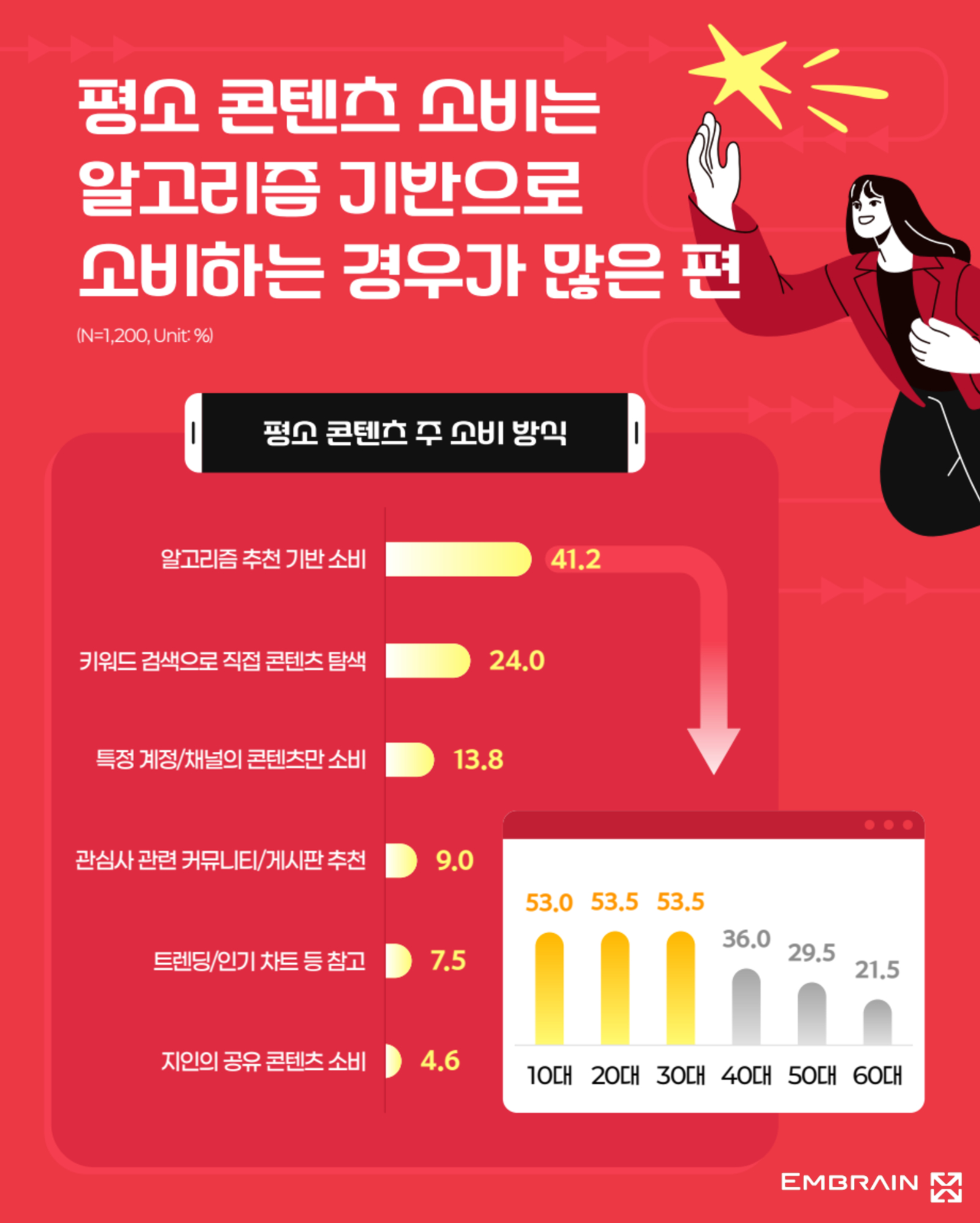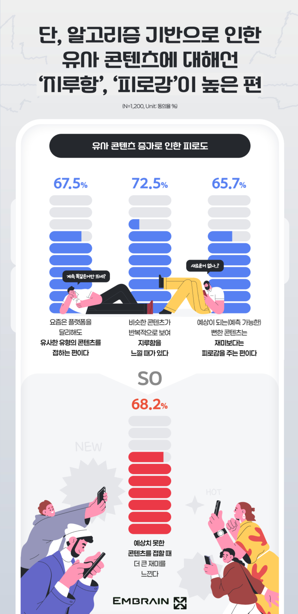 → 시장조사전문기업 엠브레인 트렌드모니터(trendmonitor.co.kr)가 전국 만 13~69세 남녀 1,200명을 대상으로 ‘SNS 알고리즘 콘텐츠 소비 관련 인식 조사’를 실시한 결과, ‘알고리즘’ 기반 콘텐츠 소비에 익숙한 모습을 보이면서도, 유사한 콘텐츠에 지속적으로 노출되는 것에 대한 피로감이 높게 평가되고 있었다. 그 결과, 예측 불가능하고, 독창적인 콘텐츠에 대한 관심이 점차 확대되고 있는 것으로 조사되었다.