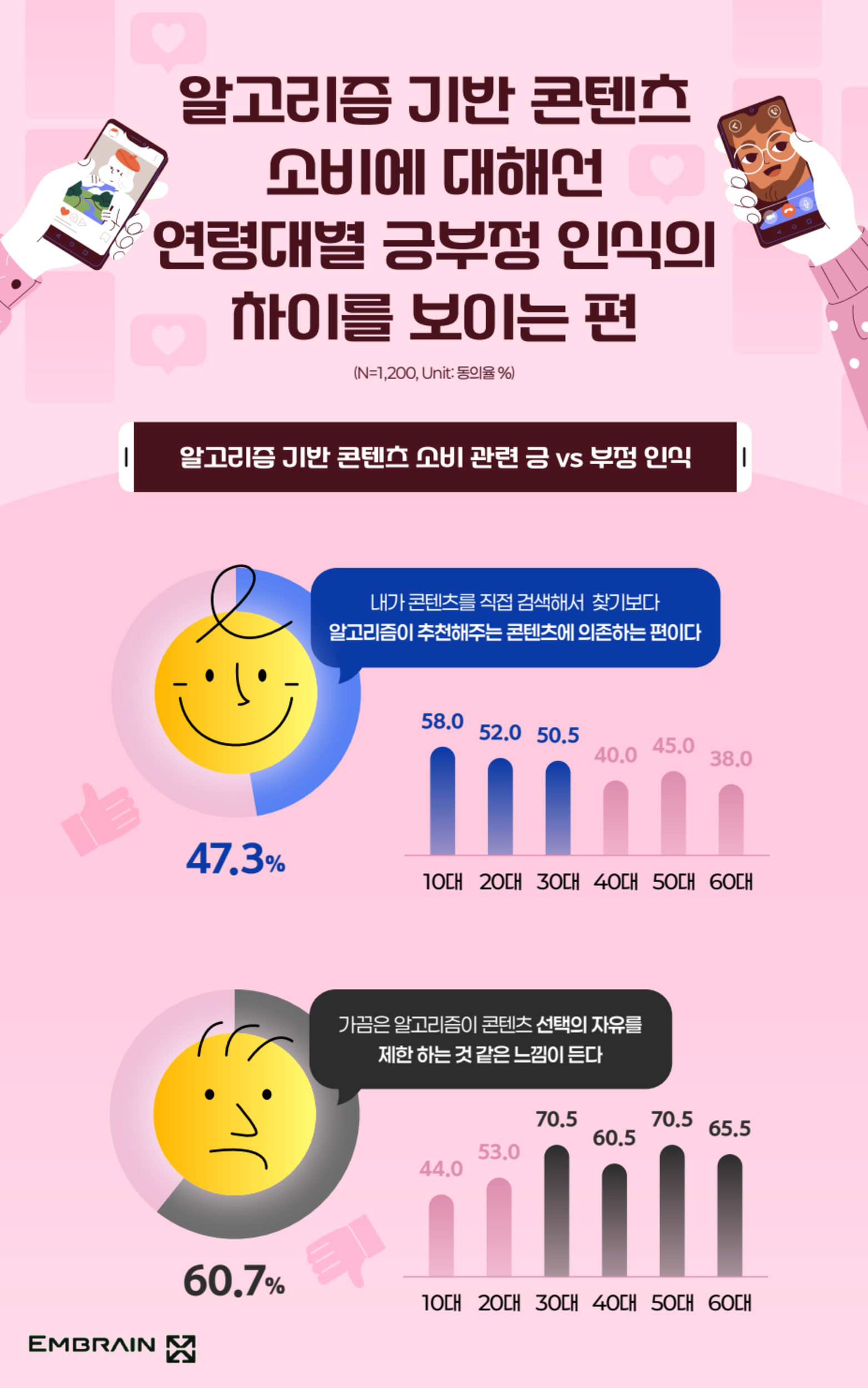 우선, 전체 응답자의 절반가량이 평소 콘텐츠를 직접 검색해서 찾기보다 알고리즘이 추천해 주는 콘텐츠에 의존(47.3%, 동의율)하는 경향을 보였고, 콘텐츠를 찾아보기 보다는 자연스럽게 ‘보게 되는 것’을 좀 더 선호(46.5%)하는 모습을 확인할 수 있었다. 아울러 알고리즘이 요즘 유행하는 것을 놓치지 않고 잘 보여주는 것 같다(55.9%, 동의율)는 인식이 과반으로 평가되는 등 알고리즘 기반 콘텐츠를 어느정도 신뢰하고 있는 태도까지 살펴볼 수 있었다. 실제로 주요 콘텐츠 소비 방식으로 알고리즘 추천에 기반한 콘텐츠 시청(41.2%, 중복응답)을 꼽은 비율이 가장 많았고, 키워드 검색으로 직접 콘텐츠를 탐색한다(24.0%)는 응답이 그 뒤를 이었다. 특히, 저연령층일수록 알고리즘 추천을 그대로 따르는 경우가 많은 편이었고(10대 53.0%, 20대 53.5%, 30대 53.5%, 40대 36.0%, 50대 29.5%, 60대 21.5%), 고연령층은 키워드 검색을 통해 직접 원하는 콘텐츠를 찾아보는 경향(10대 11.0%, 20대 17.0%, 30대 16.5%, 40대 29.5%, 50대 31.0%, 60대 39.0%)이 뚜렷한 특징을 보였다. 저연령층에서 알고리즘이 자신의 취향을 잘 반영한다고 느끼는 비율(10대 66.5%, 20대 58.0%, 30대 49.5%, 40대 29.5%, 50대 36.0%, 60대 29.5%)이 높았던 반면, 고연령층에서는 알고리즘이 대중적으로 반응이 좋은 콘텐츠에 다소 편향되어 있고, 가끔은 선택의 자유를 제한하는 것 같다는 지적이 많은 만큼(하단 그래프 참조), 고연령층은 알고리즘이 특정 취향을 강화할 수 있다는 점에 대해 상대적으로 민감하게 반응하고 있음을 엿볼 수 있었다.