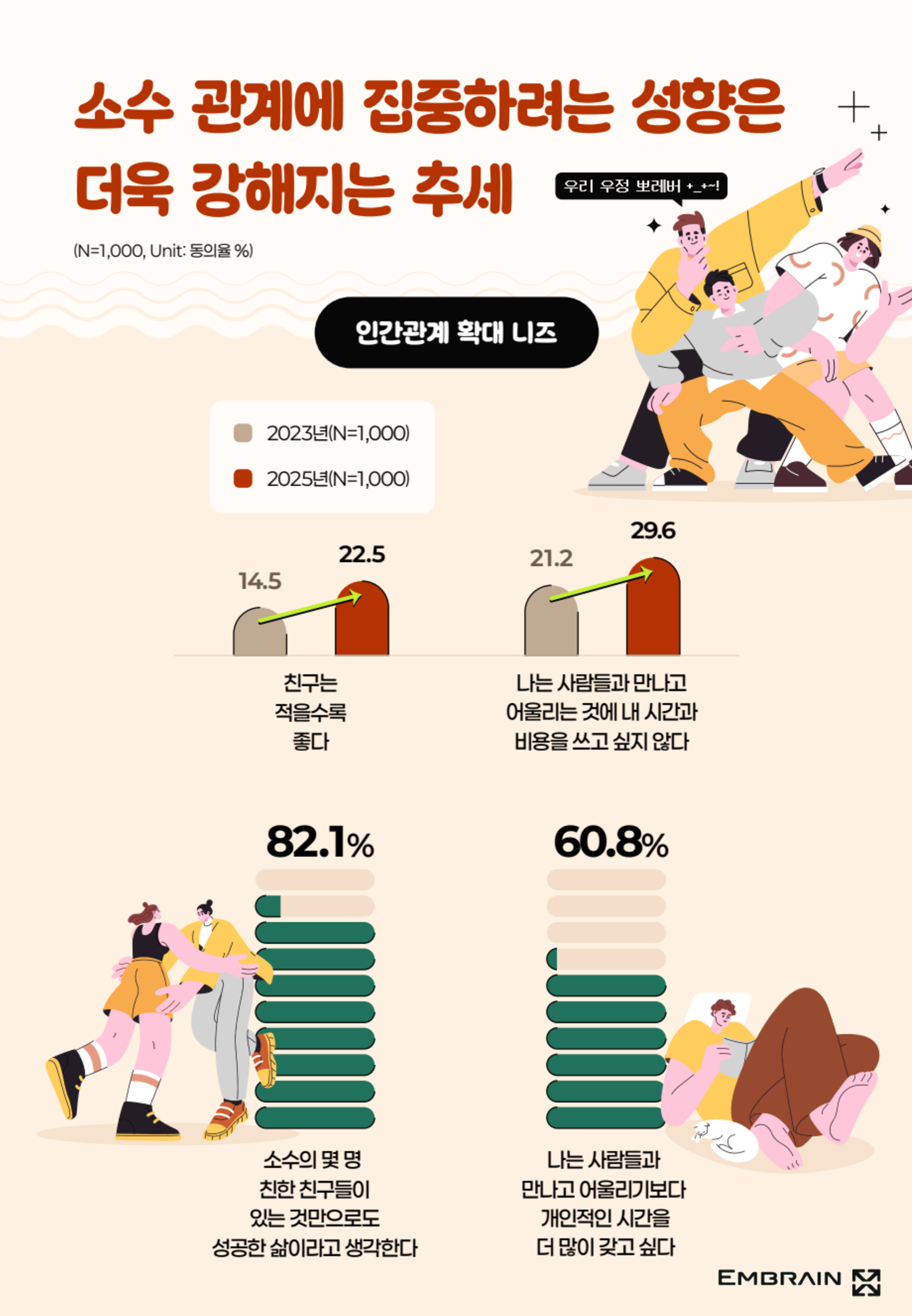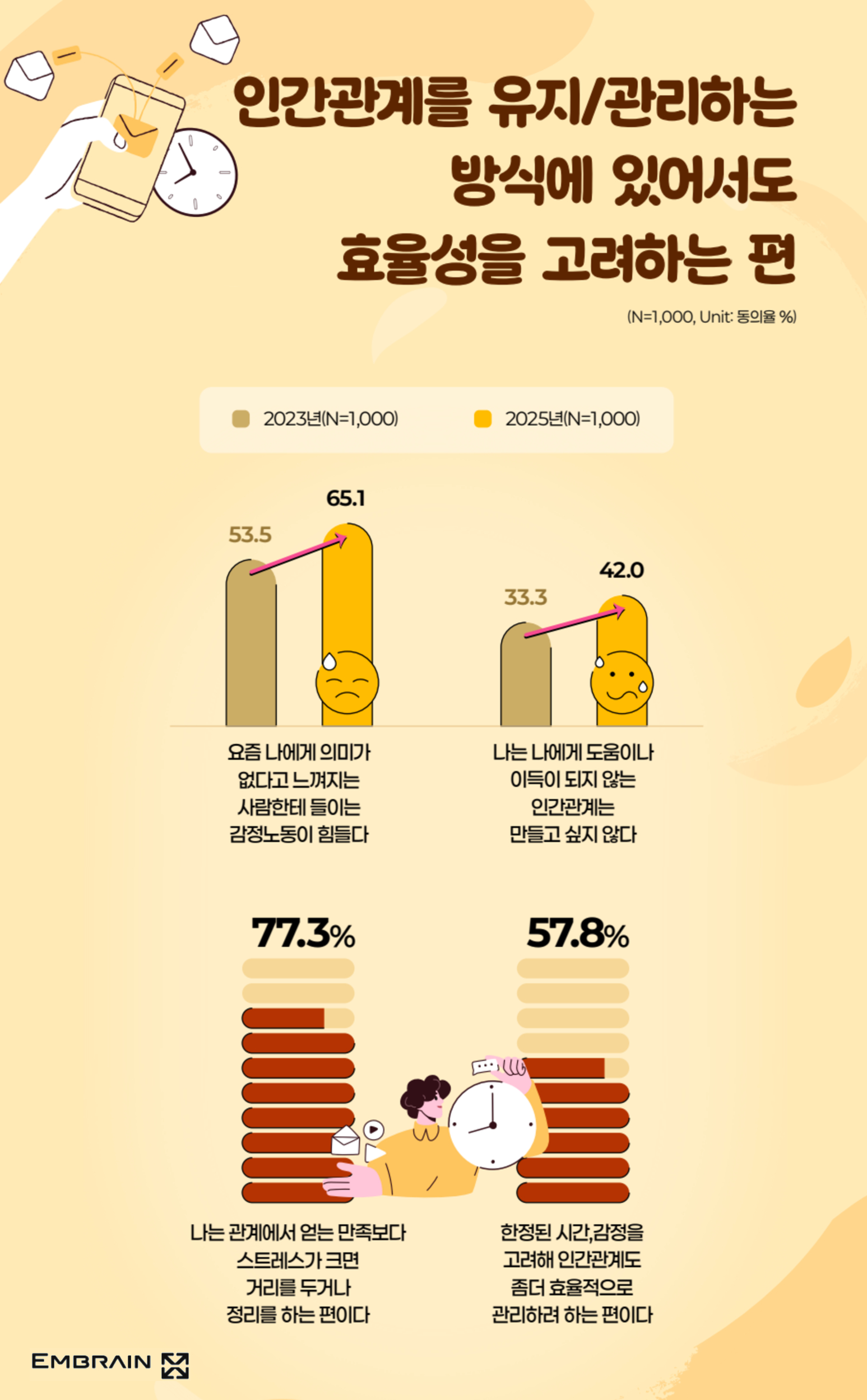 → 시장조사전문기업 엠브레인 트렌드모니터(trendmonitor.co.kr)가 전국 만 19~59세 성인 남녀 1,000명을 대상으로 ‘2025 인간관계 및 연애관 관련 인식 조사’를 실시한 결과, 관계에 대한 피로도가 높아지면서 인간관계와 연애 과정에서 ‘효율성’을 중시하는 태도가 강해지고 있는 것으로 조사되었다.