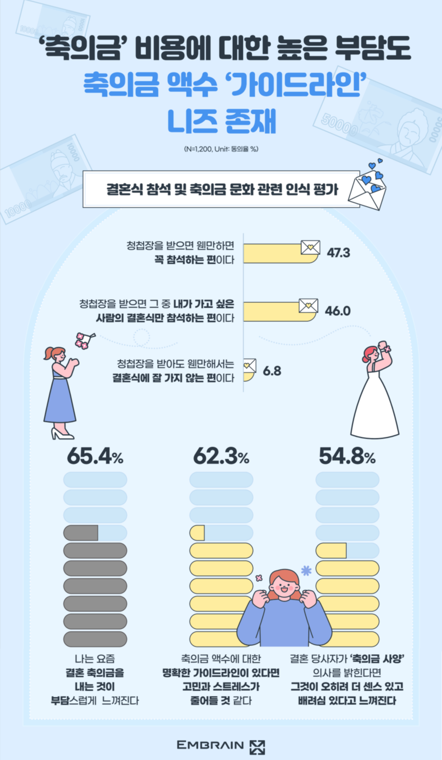 한편, 결혼식 참석 문화와 관련해서는 경제적 부담감이 주요 변수로 작용하고 있는 모습이었다. 먼저, 청첩장을 받았을 때는 ‘웬만하면 꼭 참석한다’(47.3%)는 입장과 ‘가고 싶은 결혼식만 선택해서 참석한다’(46.0%)는 입장이 갈리는 편이었는데, 특히 축의금에 대한 부담감이 더욱 가중되고 있는 것으로 나타났다. 요즘 결혼 축의금을 내는 것이 부담스럽게 느껴지고(59.5%(2022) → 65.4%(2025)), 축의금 부담 때문에 결혼을 진심으로 축하해줘야 하는 마음이 조금 줄어드는 것 같다(37.2%(2022) → 45.1%(2025))는 인식이 이전 조사 대비 소폭 증가한 것으로, 경제적 여유가 줄어드는 상황에서 결혼식 참석 자체에 피로감을 느끼고 있음을 엿볼 수 있었다. 또한 결혼식 참석을 강요받거나 의무적으로 가야 하는 문화가 불편하게 느껴진다(59.9%, 동의율)는 인식도 적지 않아, 마음에도 없이 결혼식을 참석해야 하는 상황 자체에 큰 거부감을 느끼고 있는 것으로 보인다. 이에 전체 응답자 10명 중 6명(62.3%)은 축의금 액수에 대한 명확한 가이드라인이 있다면 고민과 스트레스가 줄어들 것 같다는 의견을 내비치는 등 경제적·정서적 부담을 완화할 수 있는 기준 마련에 대한 니즈가 높아지고 있음을 확인할 수 있었다.