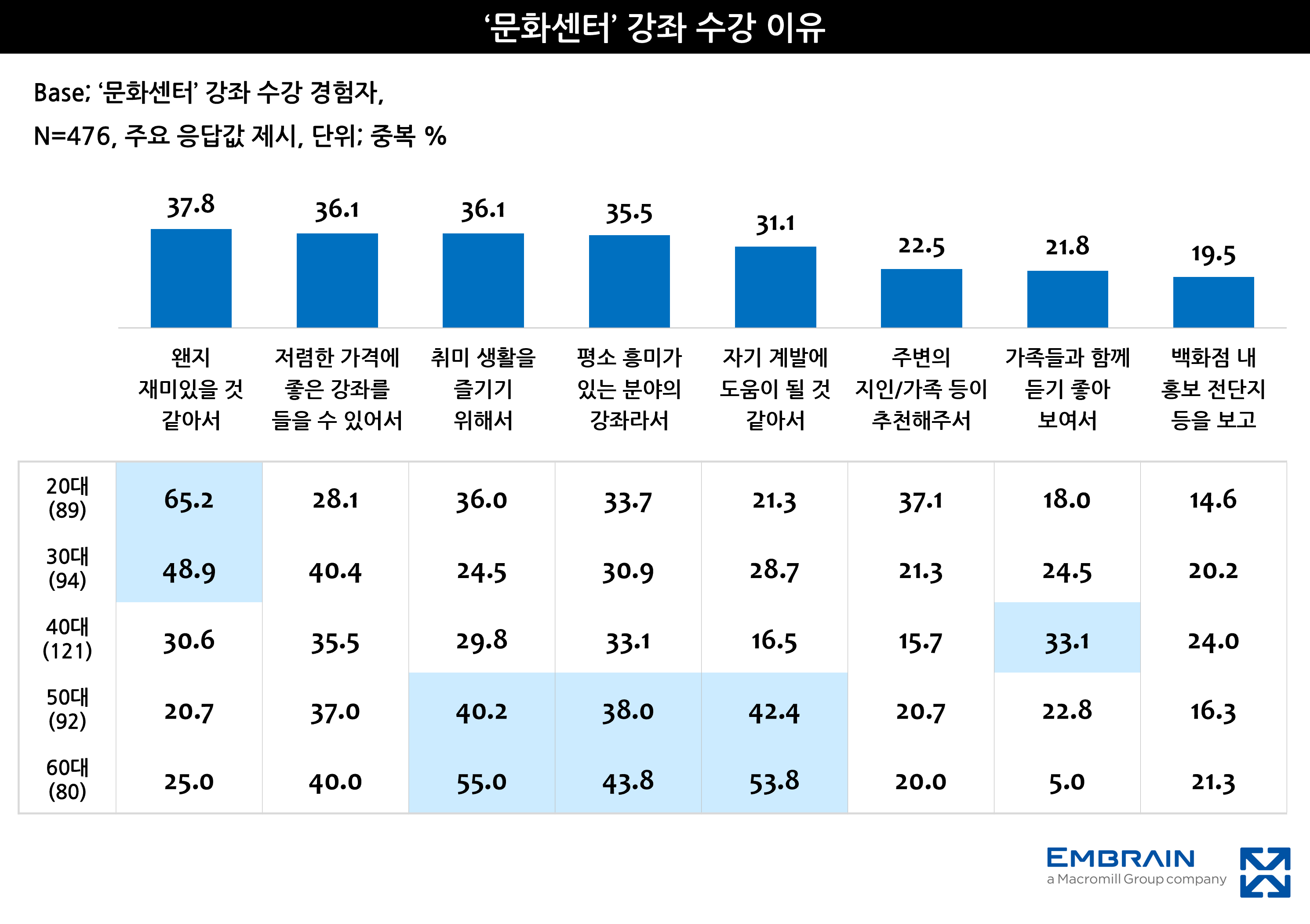 우선, 전체 응답자의 상당수가 백화점, 대형마트의 인기있는 양질의 문화센터 강좌는 해당 매장의 강점(매력 요인)이 될 수 있다(79.2%, 동의율)고 평가할 정도로, 문화센터가 매장 방문을 유도하는 주요 역할을 하고 있는 모습이었다. 아울러 문화센터 강좌가 인기를 끌면 간접 매출 증가 효과가 클 것 같다(77.8%)는 전망도 높은 수준으로, 문화센터 수강 경험이 내부 시설 이용과 소비 활동을 유인하는 플랫폼으로 자리 잡고 있음을 확인해 볼 수 있었다. 실제로 문화센터 수강 경험자 비율은 47.6%로 절반에 가까웠으며, 여성(남성 39.8%, 여성 55.4%) 및 40대 응답자(20대 44.5%, 30대 47.0%, 40대 60.5%, 50대 46.0%, 60대 40.0%)를 중심으로 수강 경험이 많은 편이었다. 문화센터 강좌를 수강한 이유로는 왠지 재미있을 것 같다(37.8%, 중복응답)는 점을 가장 우선적으로 꼽았으며, 저렴한 가격에 좋은 강좌를 들을 수 있고(36.1%), 취미 생활을 즐기기 위해서(36.1%)란 응답이 그 뒤를 이었다. 합리적인 비용으로 새로운 취미를 시도해 볼 수 있다는 점이 뚜렷한 소구 포인트가 되고 있음을 짐작해 볼 수 있었다. 특히, 20대 저연령층은 ‘재미’ 목적으로, 50대 고연령층은 ‘취미’, ‘자기 계발’을 위해 문화센터 강좌를 수강하는 경우가 많은 특징을 보여(우측 그래프 참조), 각 세대의 다양한 니즈를 충족시키는 플랫폼으로 기능하고 있는 모습까지 살펴볼 수 있었다.