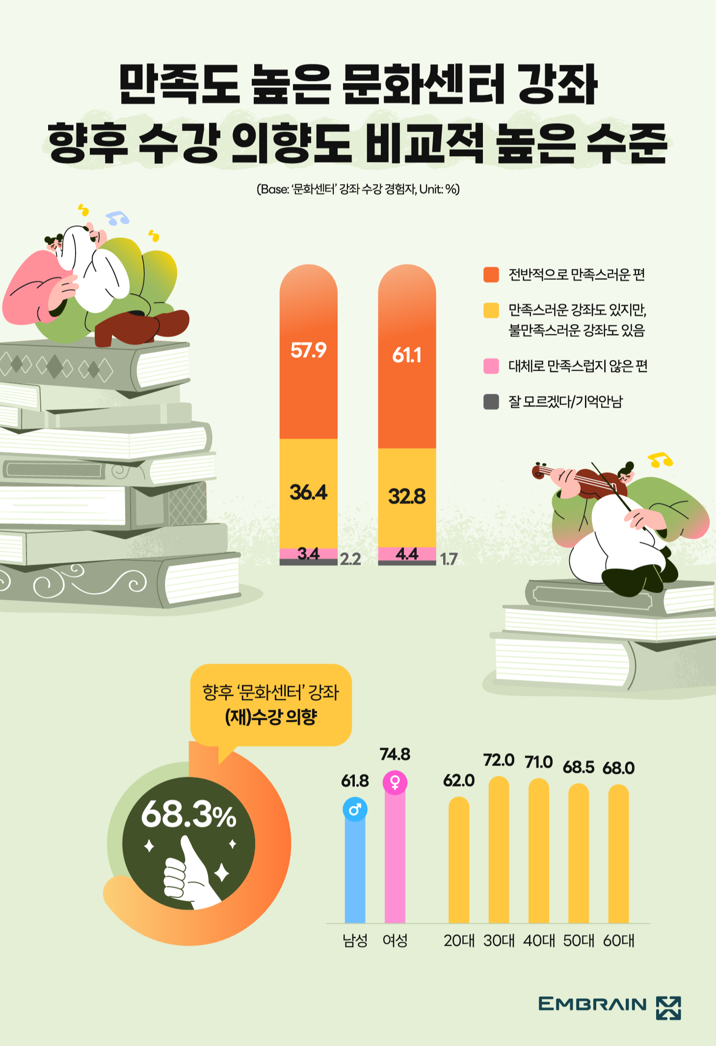 → 한편, 문화센터는 주로 여성(81.9%, 동의율) 및 주부들이 이용하는 곳이란 이미지(74.4%)가 강하게 남아있는 가운데, 최근 이용층이 확대되고 있다는 체감도가 높게 나타난 점이 주목할 만한 결과였다. 우선, 문화센터 강좌를 수강하는 연령대의 범주가 다양해진 것 같다(54.1%, 동의율)는 데에 공감대가 형성되어 있었고, 부부나 가족 단위로 문화센터를 같이 수강하는 사람들이 많은 것 같다(42.3%)는 인식이 적지 않았다. 실제로 전체 응답자 10명 중 7명(68.9%)이 기회가 된다면 가족, 친구 등과 함께 문화센터 강좌를 수강해 보고 싶다는 니즈를 내비쳐, 문화센터가 다양한 연령대와 라이프스타일을 아우르는 수업으로 이용층을 확장해 가고 있음을 짐작해 볼 수 있었다. 그 결과, 향후 문화센터 강좌 재수강 의향은 68.3%로 높게 나타났으며, 특히 여성(남성 61.8%, 여성 74.8%) 및 4050세대를 중심으로 강좌 수강 의향이 높은 편이었다(20대 62.0%, 30대 72.0%, 40대 71.0%, 50대 68.5%, 60대 68.0%). (재)수강 의향이 있는 강좌로는 요리/베이킹(50.1%, 중복응답), 운동/피트니스(36.2%) 등 취미 생활을 즐길 수 있는 수업을 주로 꼽았고, 투자/재테크(25.9%(2024) → 33.8%(2025)), 악기/노래(27.8%(2024) → 31.5%(2025)) 수업에 대한 관심이 소폭 증가한 점이 특징적이었다. 아울러 향후 문화센터 강좌 선택 시, 수강료 가격대(53.6%, 중복응답)와 강좌 퀄리티(53.2%)를 우선적으로 고려하겠다는 응답이 많은 편이었고, 주로 평일 저녁(32.8%)이나 주말 오전 시간대(30.3%)를 선호하는 모습을 보였다.