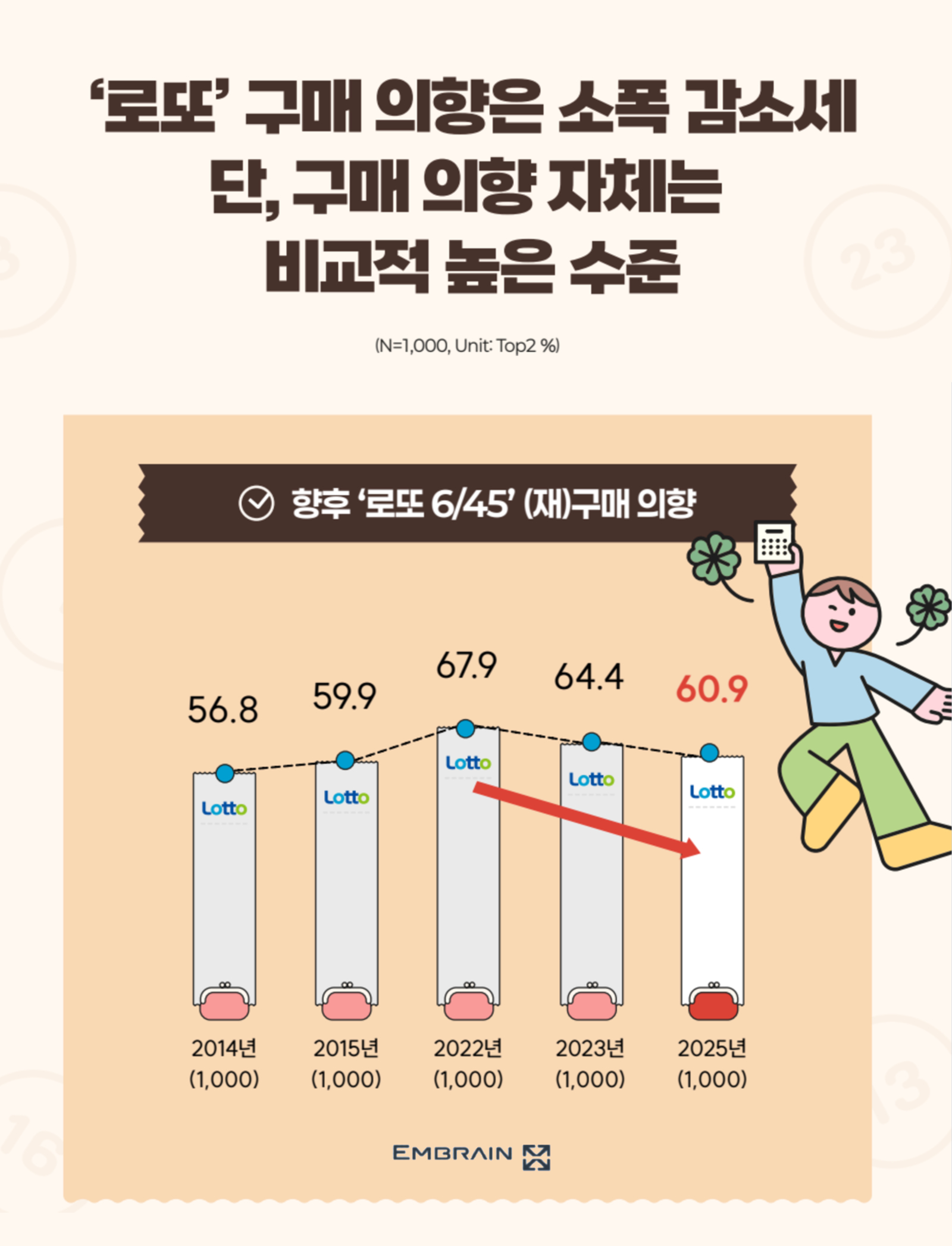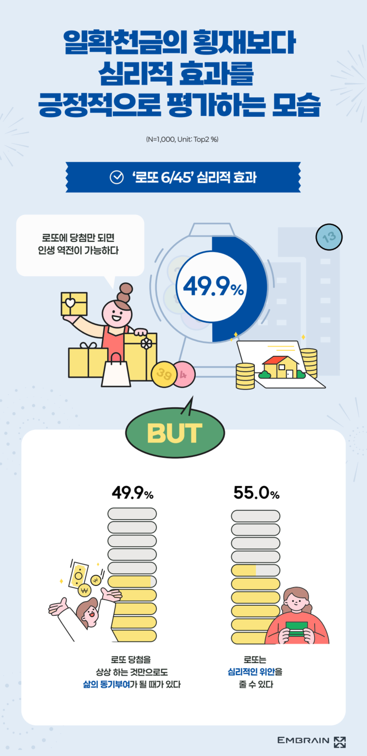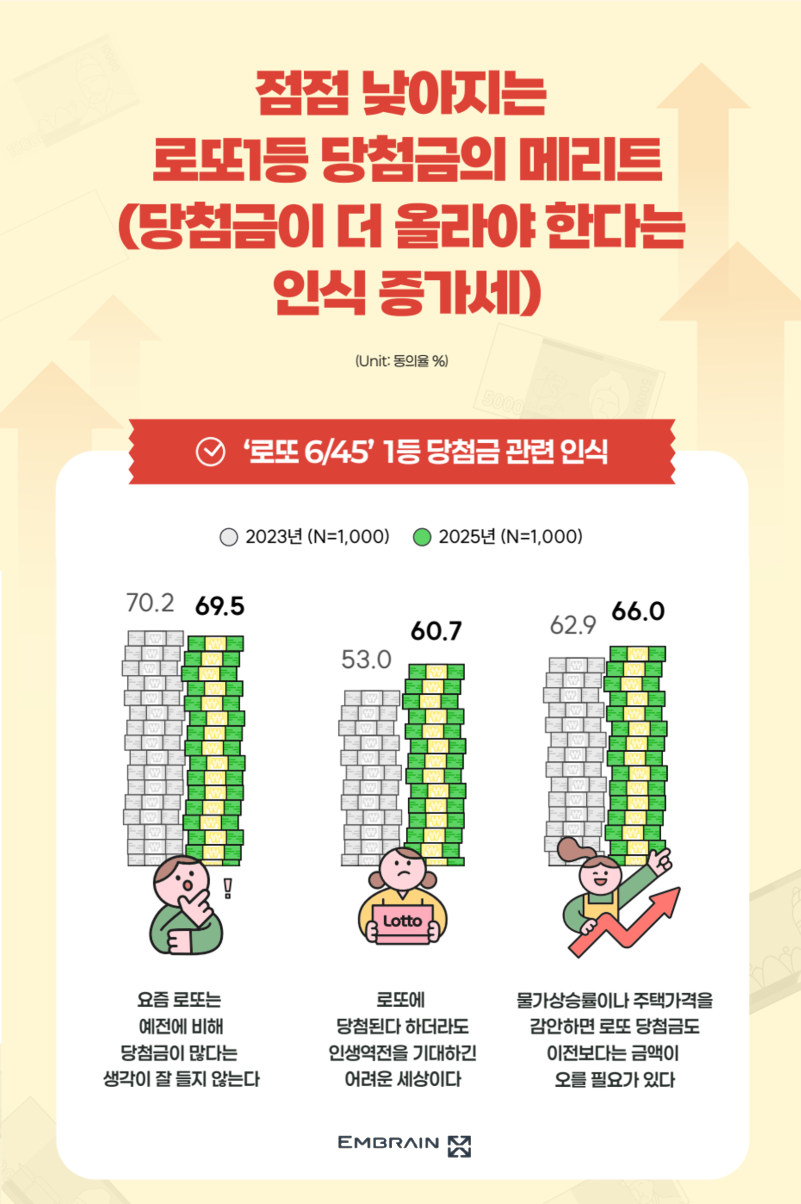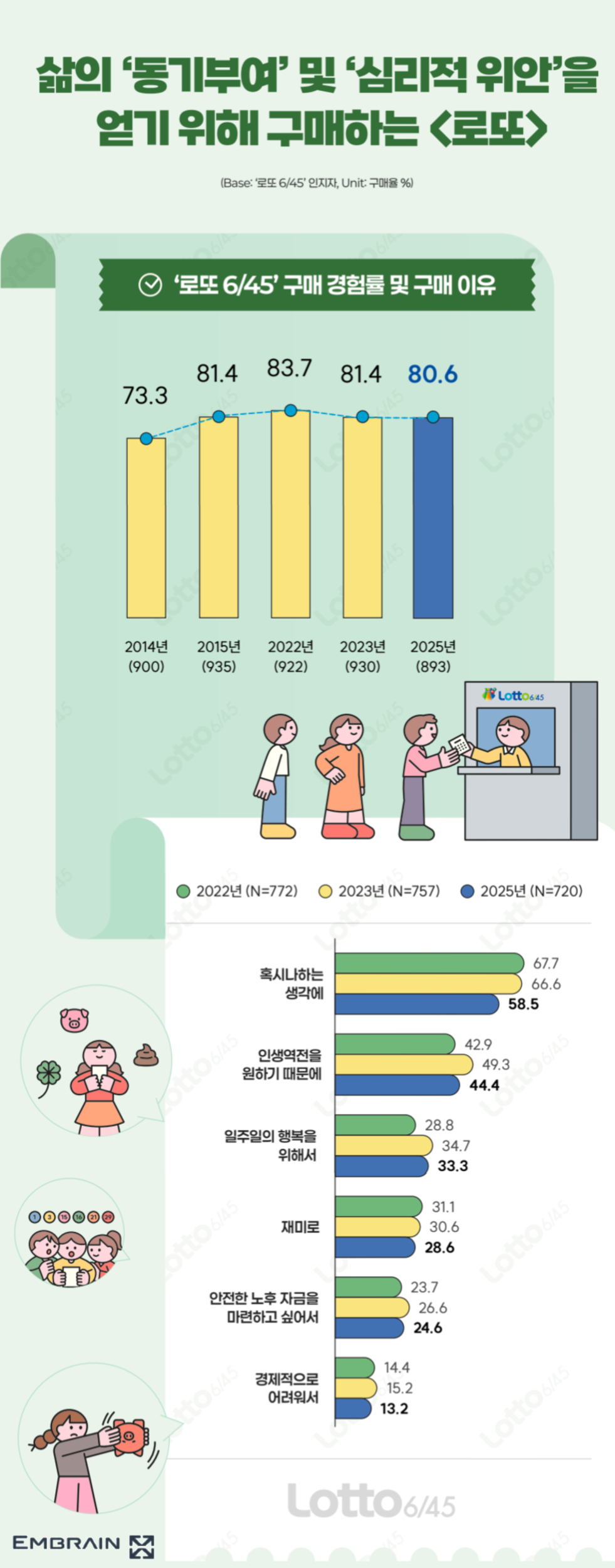 → 시장조사전문기업 엠브레인 트렌드모니터(trendmonitor.co.kr)가 전국 만 19~59세 성인 남녀 1,000명을 대상으로 ‘2025 로또 6/45 구매 경험 관련 인식 조사’를 실시한 결과, 전반적으로 인생역전에 대한 기대감을 품고 로또를 구매하는 경우가 많은 모습을 확인할 수 있었다. 다만, 고물가가 장기화되면서, 1등 당첨금의 체감 가치가 크게 낮아지고 있는 것으로 조사되었다.