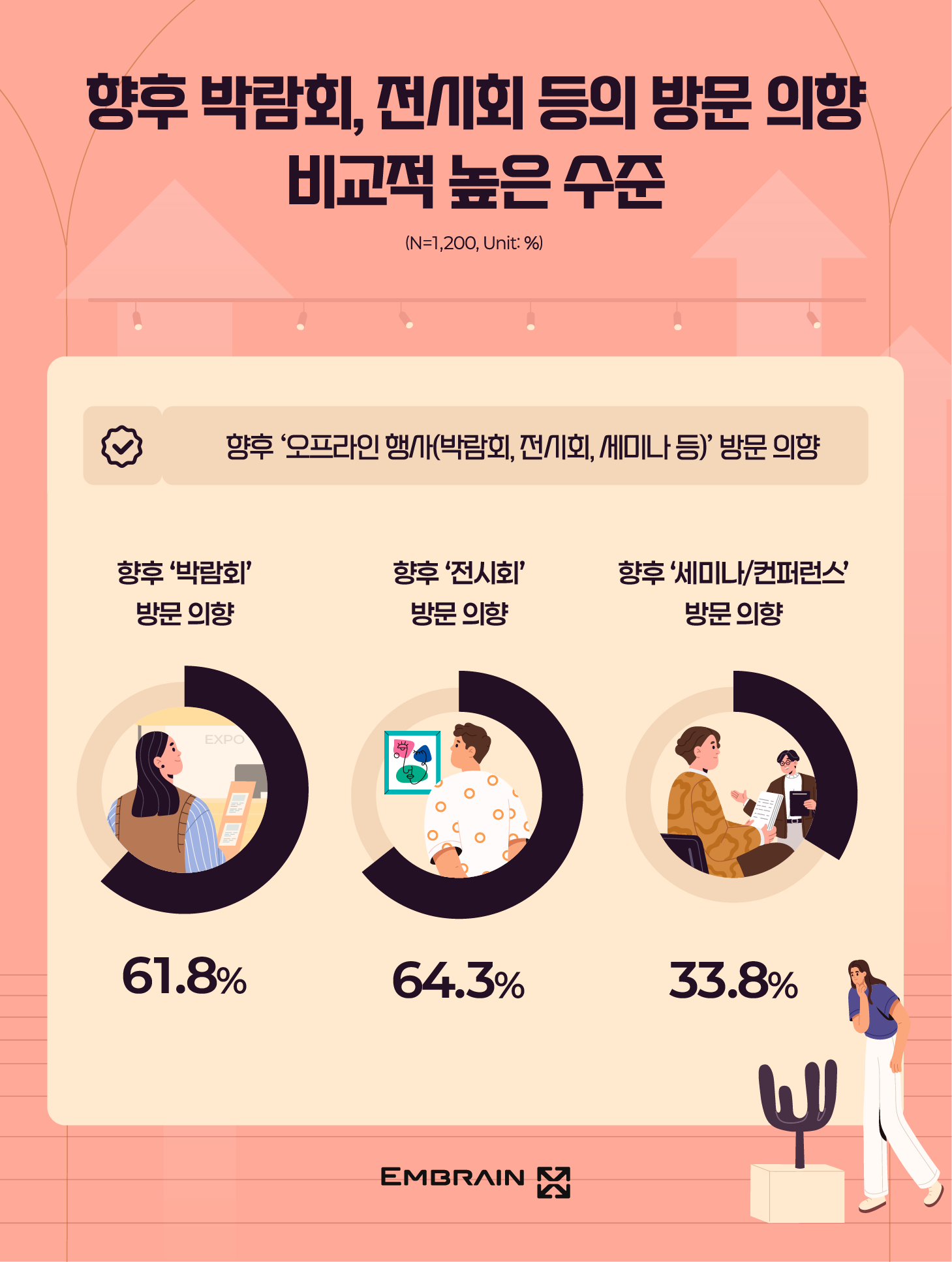 이에 따라 오프라인 행사의 전망도 긍정적으로 점쳐지고 있었다. 앞으로 이색적인 박람회·전시회가 지금보다 더 많아질 것 같다(74.3%, 동의율)는 전망이 우세했으며, AR/VR 등의 기술이 박람회나 전시회 등의 경험을 크게 바꿔 놓을 것(68.1%)이란 기대감도 높은 모습을 보였다. 실제로 향후 박람회(61.8%) 및 전시회 방문 의향(64.3%)이 높게 나타났으며, 주로 여행(35.9%, 중복응답), 취미(34.0%), 재테크/투자(31.4%) 분야의 오프라인 행사에 대한 관심이 많은 편이었다. 다만 방문 과정에서 사람이 지나치게 많고(48.4%, 중복응답), 휴게 공간이 부족하다(38.8%)는 불만이 적지 않게 제기되고 있는 만큼, 향후 혼잡도 관리와 공간 개선이 이뤄진다면 오프라인 행사에 대한 전반적인 만족도와 재방문 의향이 한층 더 높아질 것으로 예상된다.
