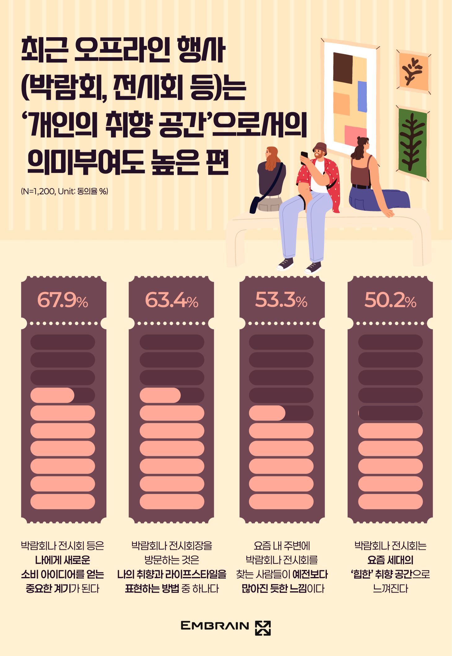 → 전반적으로 오프라인 행사는 생생한 경험으로 새로운 인사이트를 얻을 수 있다는 점에서 높게 평가되고 있었다. 우선, 최근 1년 내 오프라인 행사에 참석한 경험이 있는 응답자의 상당수가 박람회나 전시회장에 방문하는 것을 자신의 취향과 라이프스타일을 표현하는 방법 중 하나(63.4%, 동의율)로 받아들이고 있었으며, 자신의 취미나 관심사에 맞는 박람회·전시회장을 방문하고자 하는 니즈(75.3%) 역시 높은 모습을 보였다. 아울러 박람회나 전시회는 배우면서 즐길 수 있는 경험(73.1%, 동의율)이자, 자신에게 투자하는 시간(71.3%)이란 인식이 높은 편이었고, 현장에서 직접 경험해야 그 가치를 실감할 수 있다는 응답이 66.8%에 달한 결과를 확인할 수 있었다. 오프라인 행사가 직접 보고 느끼는 과정을 통해 자신의 취향을 구체화해가는 공간으로 여겨지고 있음을 엿볼 수 있는 대목이었다. 실제로 박람회나 전시회 등이 새로운 소비 아이디어를 얻는 중요한 계기가 된다(67.9%, 동의율)는 데에 높은 공감대가 형성되어 있어, 오프라인 행사가 체험과 몰입을 통해 새로운 인사이트와 소비 아이디어를 얻는 장으로 기능하고 있는 모습까지 살펴볼 수 있었다.