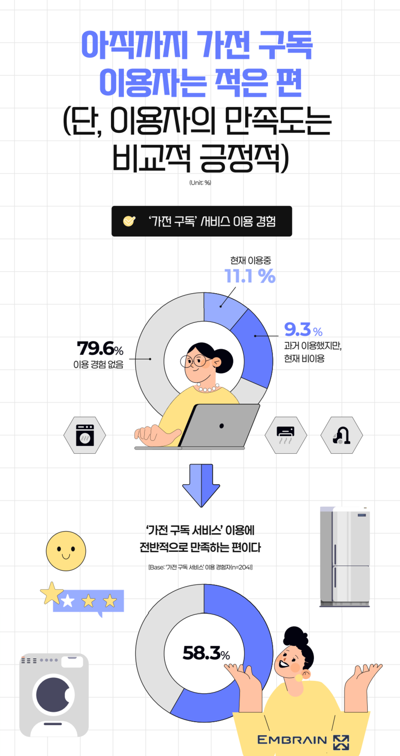 → 시장조사전문기업 엠브레인 트렌드모니터(trendmonitor.co.kr)가 전국 만 19~69세 성인 남녀 1,000명을 대상으로 ‘가전 구독 서비스 관련 U&A 조사’를 실시한 결과, 월 이용료로 정기적인 가전 케어 서비스를 받을 수 있는 ‘가전 구독 서비스’가 관리 편의성과 비용 부담 완화 측면에서 합리적인 선택지로 인식되고 있는 것으로 나타났다. 다만 서비스 인지도와 이용 경험률은 여전히 낮은 수준이며, 불필요한 고정비로 이어질 수 있다는 우려도 함께 확인됐다.