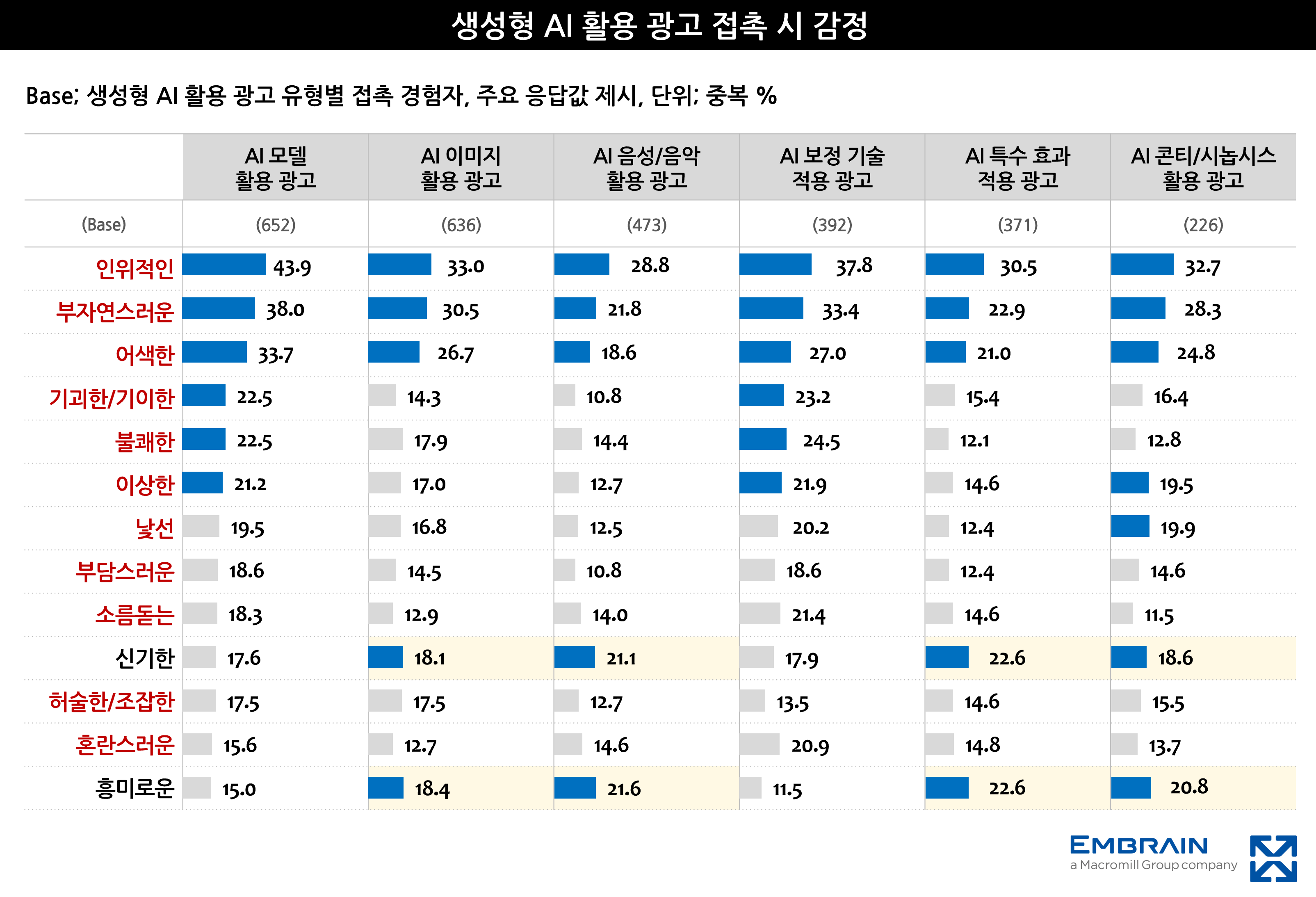 생성형 AI 광고 접촉 빈도가 증가하는 반면, 광고에 대한 소비자 평가는 부정적인 반응이 두드러졌다. 응답자들은 AI 광고를 접했을 때, ‘인위적인’, ‘부자연스러운’, ‘어색한’ 등의 이미지를 주로 떠올렸으며, 불쾌감을 느끼는 경향이 강했다. ‘흥미롭다’, ‘신기하다’는 긍정적 반응도 일부 나타났지만, 전반적으로는 부정적 평가가 우세한 결과를 보였다(하단 그래프 참조). 이는 생성형 AI 광고가 소비자가 체감하는 자연스러움과 진정성 측면에서 아직 기대 수준에 미치지 못하고 있는 것으로 해석해 볼 수 있었다. 특히 광고는 브랜드의 신뢰도 및 이미지 형성과 직결되는 만큼, 기술적 완성도를 높이는 것을 넘어 소비자가 어떤 요소에서 위화감을 느끼는지 파악하고 이를 개선하는 전략이 필요할 것으로 보인다.