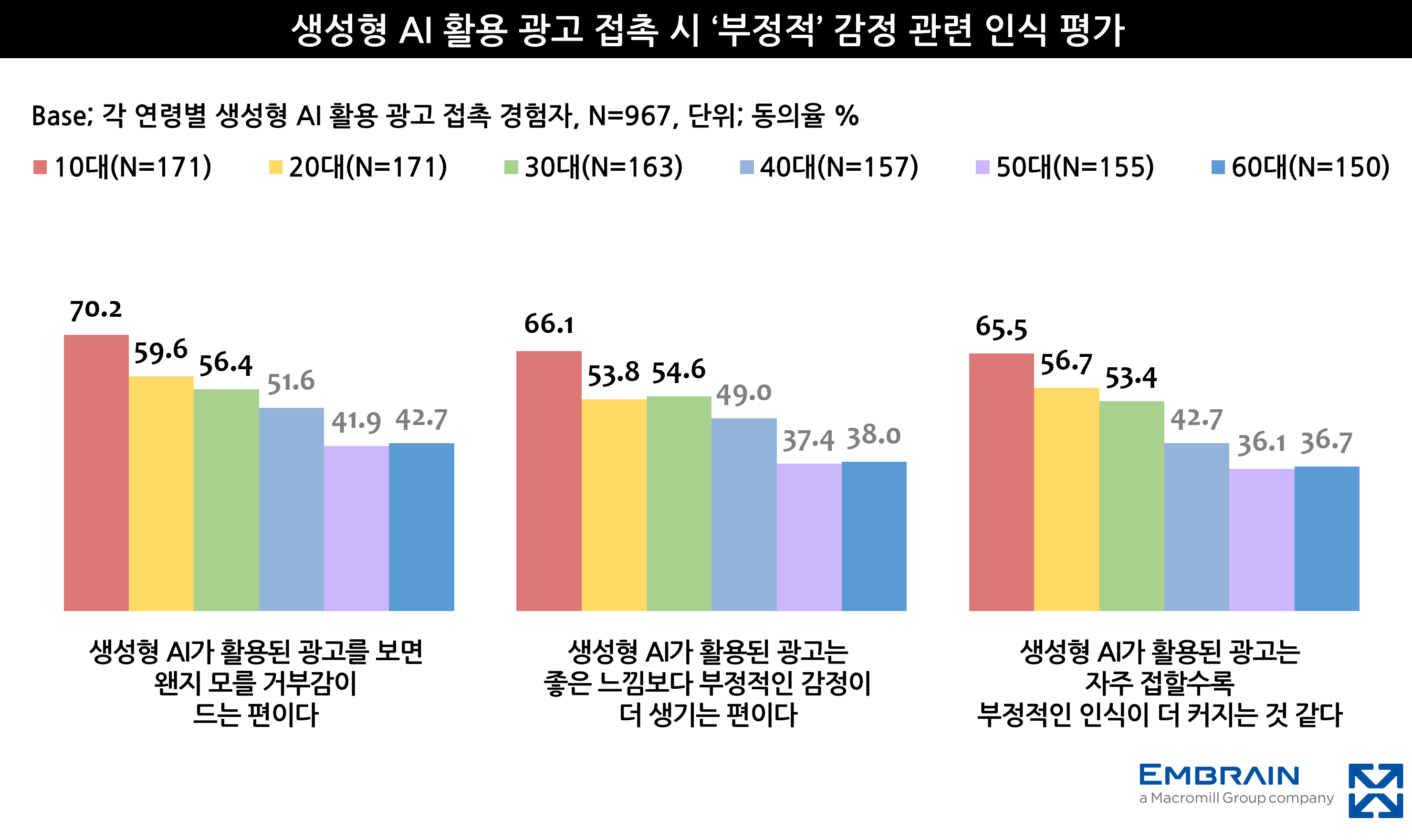 → 한편, 이러한 부정적 인식은 소비 행동에도 영향을 미치고 있었다. AI 광고를 접할 경우 해당 제품 및 브랜드에 대한 구매 의향을 밝힌 응답자는 40.8%에 그쳤고, 실제 AI 광고 접촉 경험자가 브랜드 및 제품에 호기심을 갖거나(20.1%, 동의율)나 실제 구매로 이어진 경험(12.9%)은 매우 미미한 수준이었다. 또한 AI 광고보다 사람이 직접 제작한 광고에 대한 호감도(63.0%)가 더 높았으며, 저연령층일수록 이러한 경향이 뚜렷했다(10대 76.0%, 20대 71.0%, 30대 59.0%, 40대 54.5%, 50대 60.5%, 60대 57.0%). 최근 AI 광고 확대 현상에 대한 인식도 연령별로 상이한 결과를 보여, 세대간 AI 광고 수용도에 격차가 존재함을 확인할 수 있었다(하단 그래프 참조).