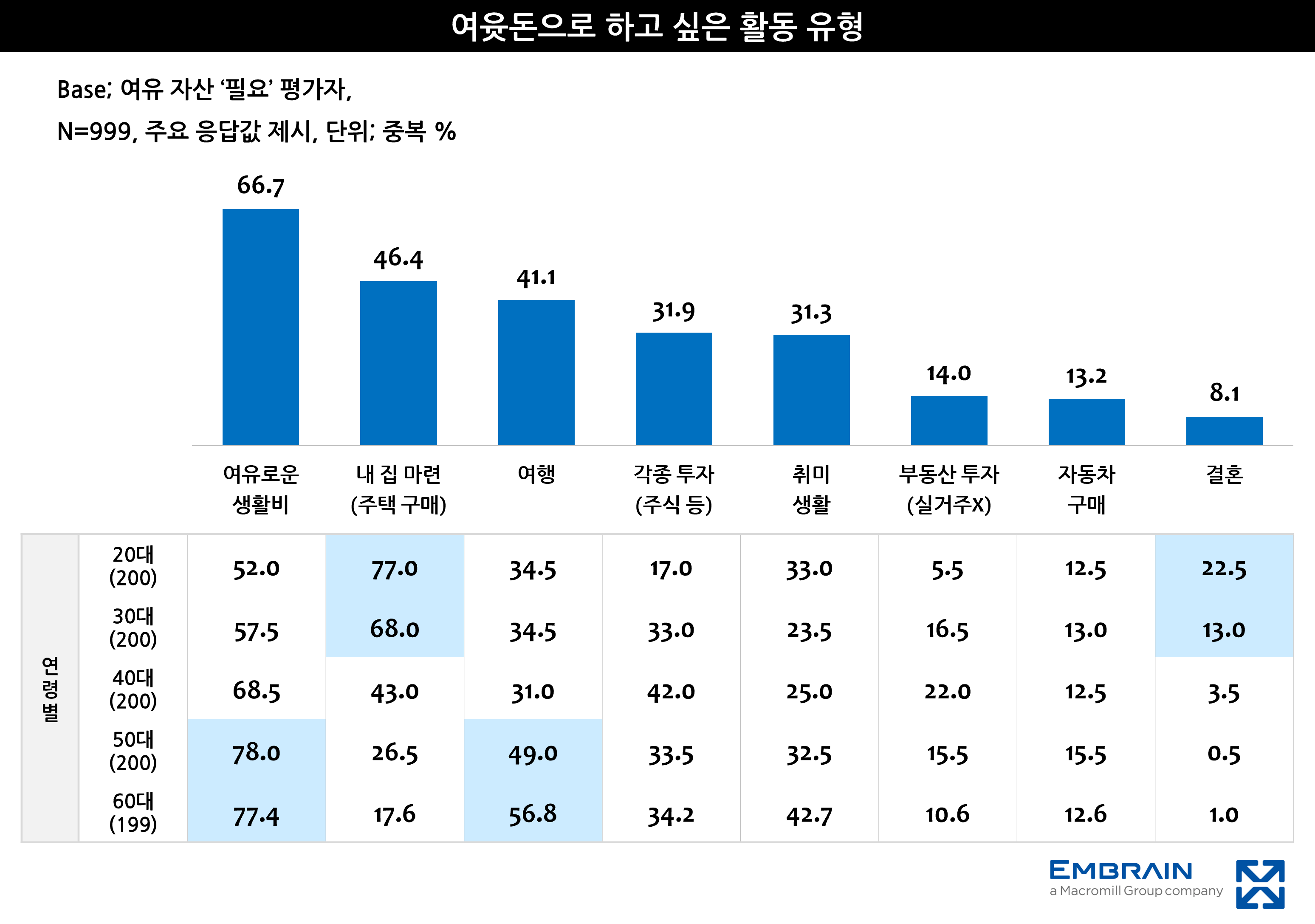 한편, 경제활동을 하고 있다는 전제하에 ‘돈 걱정 없이 생활할 수 있는 최소 자산’ 규모로는 10~15억 원(21.0%)을 꼽은 응답이 가장 많았고, 1-3억 원 미만(17.2%), 3-5억 원 미만(14.1%)이 그 뒤를 이었다. 아울러 경제적 여유가 생길 경우 활용처로는 생활비(66.7%, 중복응답)가 1순위였으며, 내 집 마련(46.4%), 여행(41.1%) 등 실질적인 삶의 질 향상과 직결된 항목에 대한 수요가 높게 나타났다. 연령별로는 고연령층이 생활비·여행 등 현재의 안정과 여가를 우선시한 반면, 저연령층은 내 집 마련·결혼 자금 등 미래 계획과 연결된 항목에 더 높은 관심을 보였다(하단 그래프 참조). 생애주기에 따라 자산의 역할과 활용 목적이 뚜렷하게 달라지고 있음을 엿볼 수 있는 대목이다.
