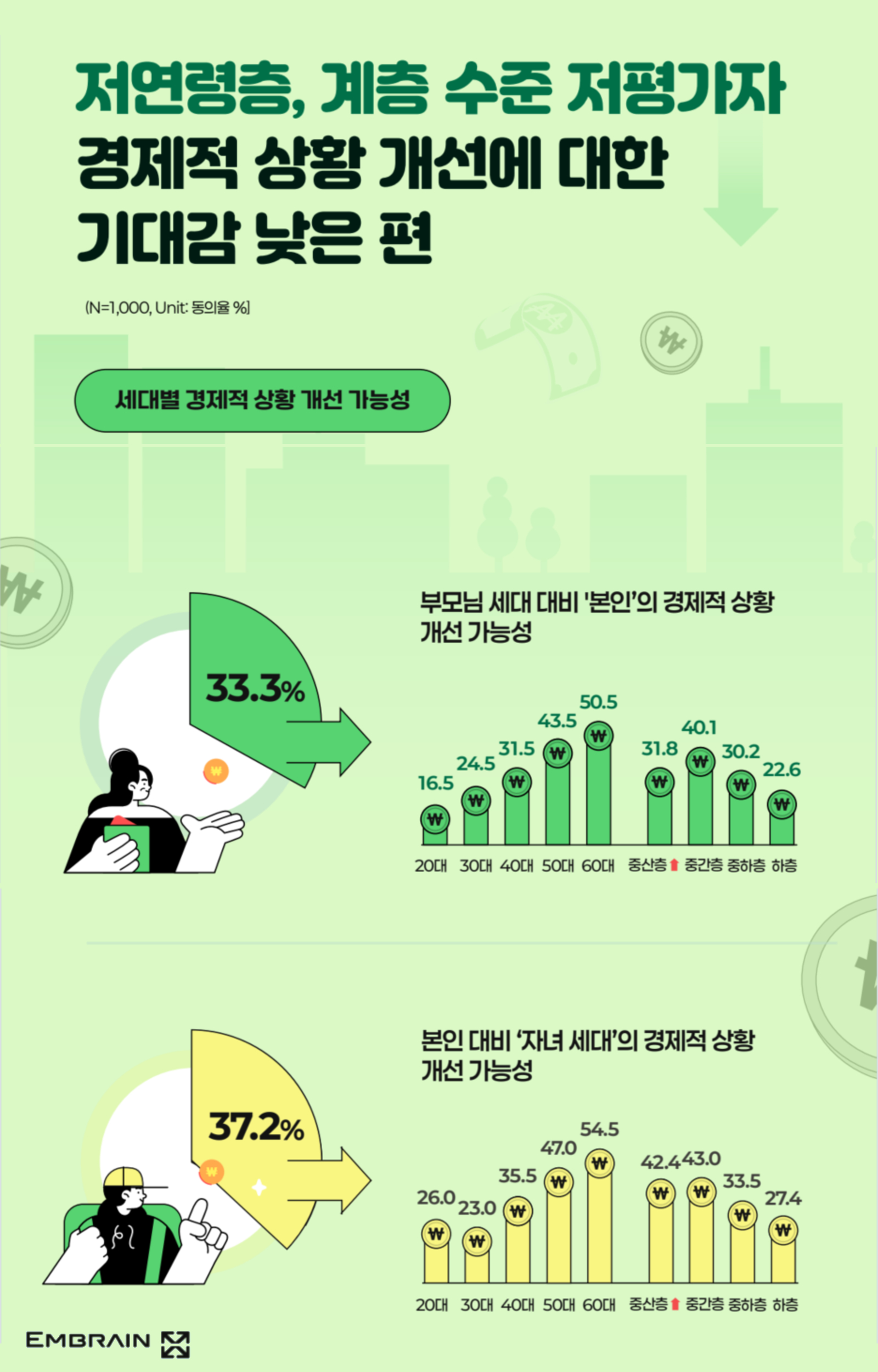 한편 향후 한국 사회에서 만족할 만한 소득을 얻을 수 있을 것이라는 긍정적 전망은 14.7%에 그쳤다. 부모 세대 대비 자신의 경제 상황이 나빠질 것(41.0%)이라는 응답이 나아질 것(33.3%)이라는 전망을 웃돌았고, 자녀 세대의 경제적 상황 역시 크게 나아지지 않을 것(43.0%)이라는 인식이 우세했다. 특히 저연령층에서 비관적 전망이 두드러진 점은(하단 그래프 참조), 향후 소비 여력과 자산 형성에 장기적인 영향을 미칠 수 있다는 점에서 우려되는 대목이다.