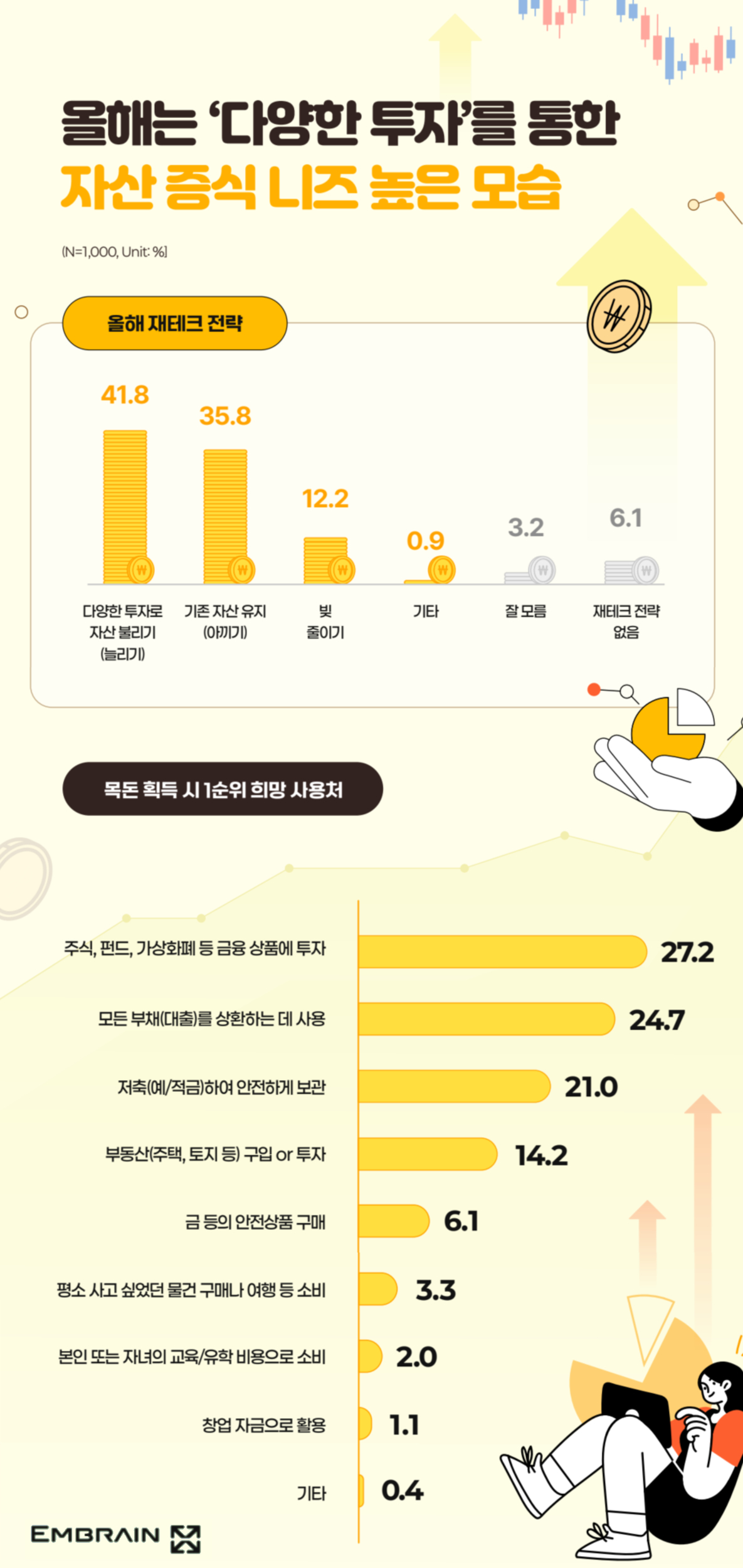 → 시장조사전문기업 엠브레인 트렌드모니터(trendmonitor.co.kr)가 전국 만 19~69세 성인 남녀 1,000명을 대상으로 ‘2026 투자 전망 및 돈에 대한 인식 조사’를 실시한 결과, ‘돈’이 삶의 기본 조건이자 사회적 역량을 가늠하는 기준으로 자리잡은 가운데, 미래 소득이 개선될 것이라는 기대감은 크지 않은 것으로 나타났다. 자산 증식에 대한 관심이 높아지며 투자 열기가 달아오른 반면, 투자 과열에 대한 불안감도 함께 공존하는 모습을 확인할 수 있었다.