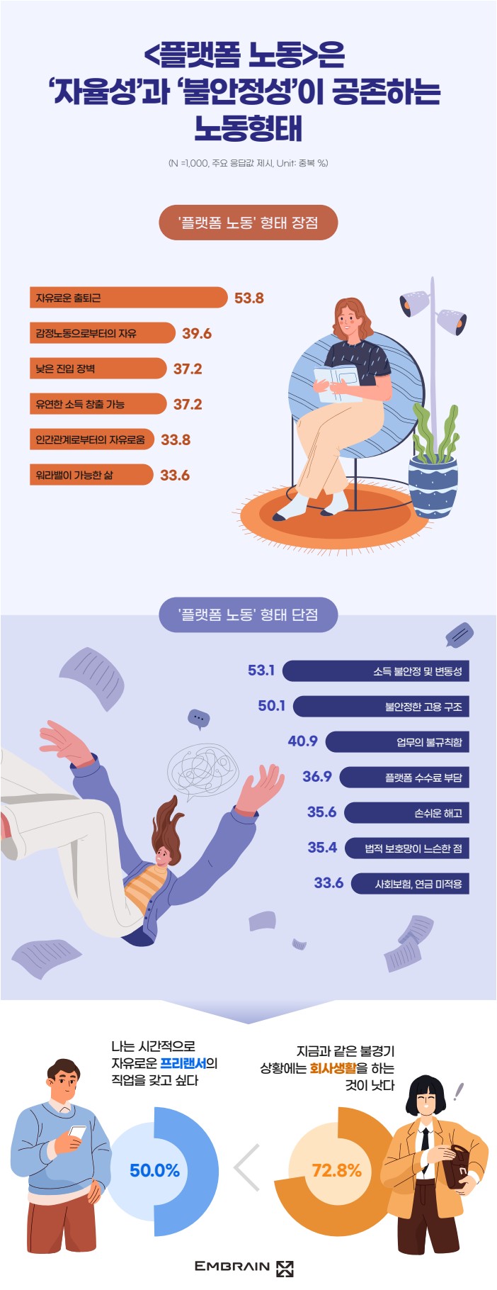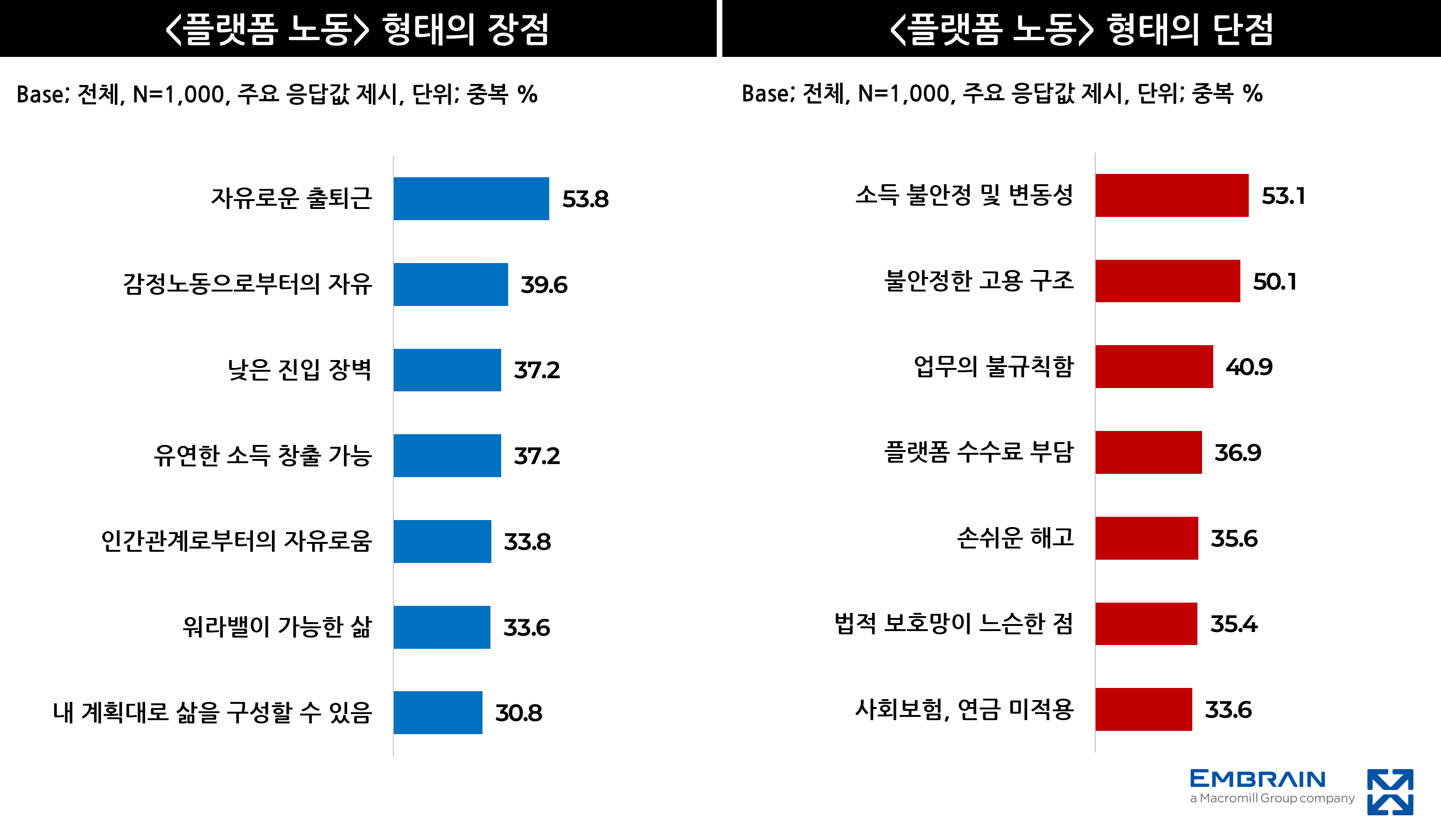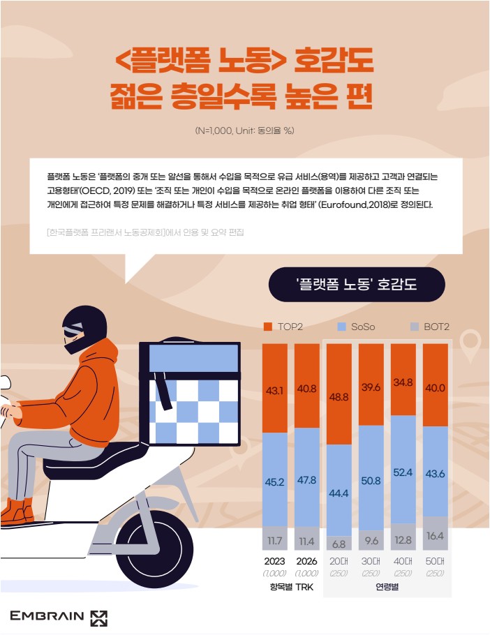 → 시장조사전문기업 엠브레인 트렌드모니터(trendmonitor.co.kr)가 전국 만 19~59세 직업인 남녀 1,000명을 대상으로 ‘2026 플랫폼 노동 및 노동 소득에 대한 태도 조사’를 실시한 결과, 플랫폼 기반 노동 형태가 확산되고 있음에도 대중적 이해도는 여전히 낮은 수준인 것으로 나타났다. 플랫폼 노동의 ‘자율성’과 ‘유연성’은 긍정적으로 평가됐지만, 고용 불안과 소득 불안정에 대한 우려가 맞물리면서 실제 직업 선택에서는 안정적인 직장을 선호하는 경향이 뚜렷하게 확인됐다.