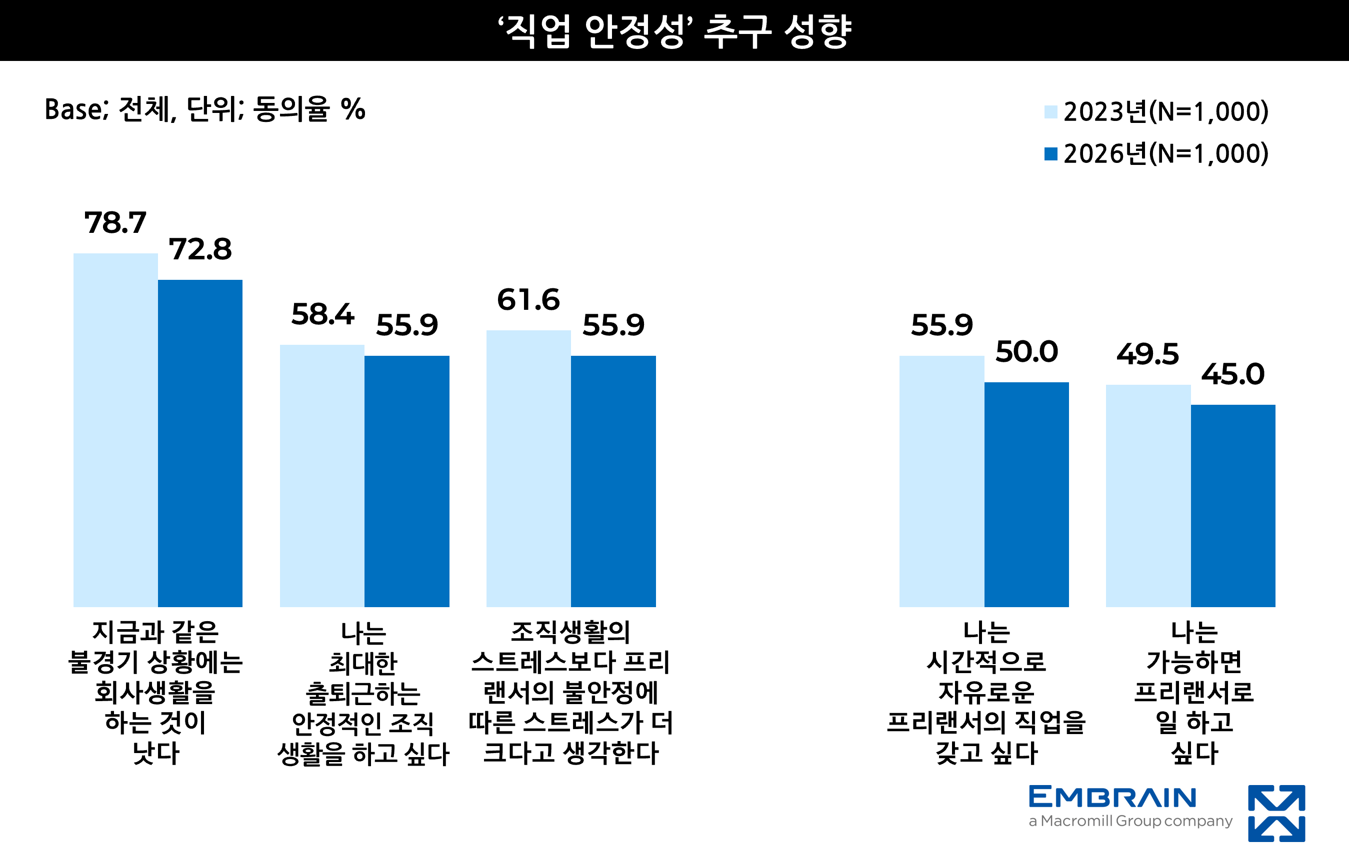- ‘프리랜서’ 선호도 소폭 감소…안정적인 직장 선호 경향 뚜렷