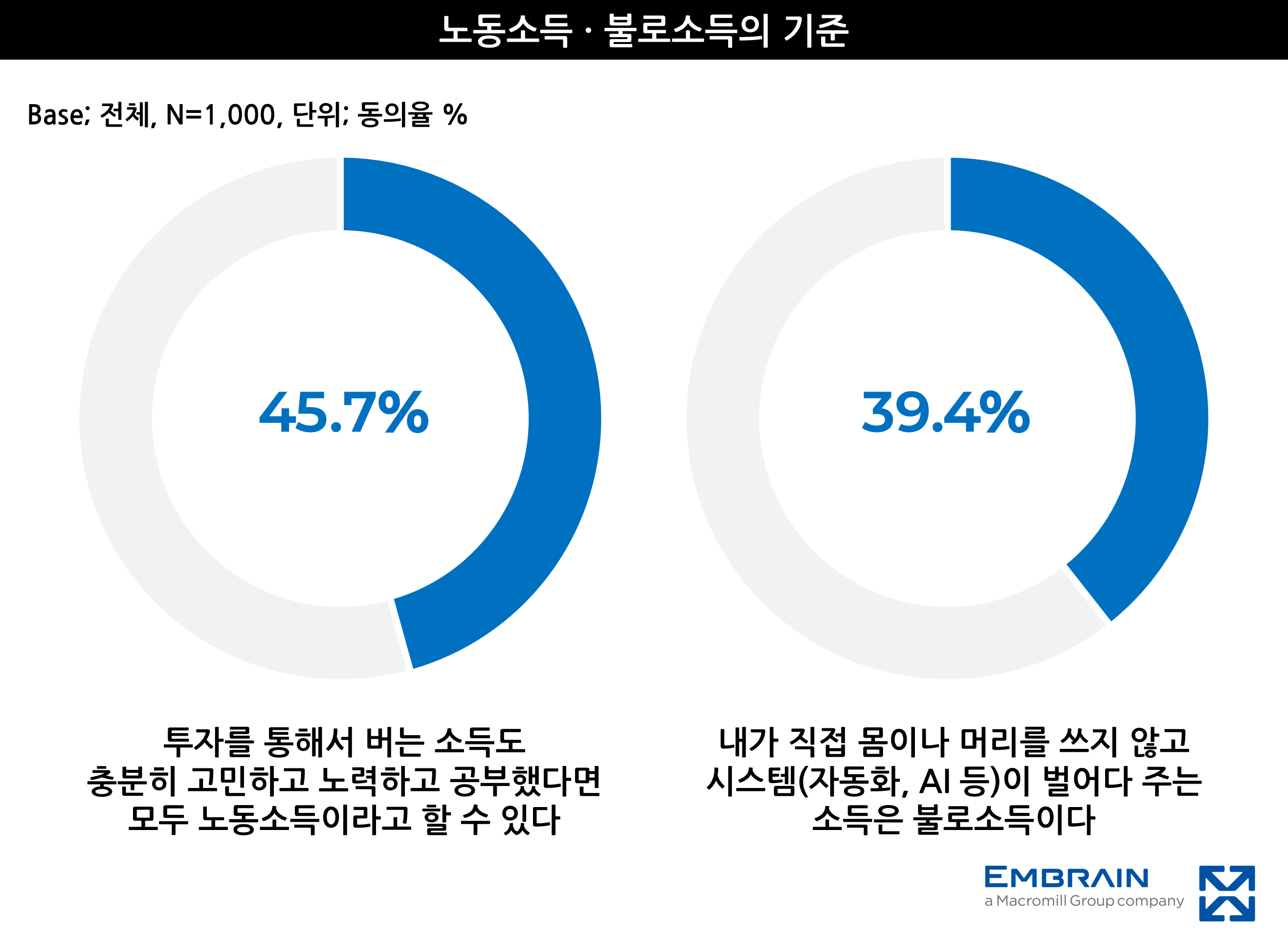 한편, 응답자의 상당수는 본업이나 창작활동에서 발생하는 소득 대부분을 노동소득으로 인정하는 경향을 보였다. 육체노동뿐 아니라 회사 내 업무(87.8%, 동의율)이나 영업·서비스 활동(87.5%), 감정노동(87.2%) 등 다양한 직무에서 발생하는 소득을 노동소득으로 보는 인식이 높았다. 온라인 플랫폼에 등록한 그림·음원의 저작권료(77.8%, 동의율)나, 유튜브·SNS 등 창작 콘텐츠 수익(70.8%) 역시 개인의 노력과 아이디어의 산물이라는 점에서 노동소득으로 인정하는 경향이 뚜렷했다. 반면 ‘투자 소득을 노동소득으로 볼 수 있다’(45.7%, 동의율)거나, ‘직접 몸이나 머리를 쓰지 않고 시스템을 통해 얻는 소득은 불로소득’(39.4%) 이라는 응답은 모두 과반에 미치지 못해, 자본 투자 수익이나 자동화 시스템을 통한 소득의 성격에 대해서는 의견이 엇갈렸다. 투자활동과 플랫폼 경제 활동이 일상화되면서 ‘노동소득’과 ‘불로소득’의 경계가 점차 흐려지고 있음을 보여주는 결과로 해석된다.
