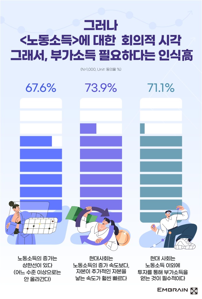→ 상당수 직업인들은 ‘일의 책임이 증가하면 소득(임금)수준도 높아진다’(65.0%, 동의율)는 데 공감하면서도, 노동소득 증가에는 상한선이 있다(67.6%)고 바라보는 경향이 뚜렷했다. 이러한 인식은 자연스럽게 ‘투자를 통한 부가소득이 필수적’이라는 공감(71.1%, 동의율)으로 이어졌다. 실제로 응답자의 73.9%가 ‘현대사회는 노동소득이 증가하는 속도보다, 자본이 자본을 낳는 속도가 훨씬 빠르다’고 답해, 노동만으로 자산을 축적하기 어렵다는 인식이 확산되고 있음을 확인할 수 있었다. 이에 ‘정부는 불로소득(투자차익)에 대한 과세를 강화해 노동소득자와의 격차를 줄여야 한다’는 의견도 44.8%에 달하는 등 노동소득과 불로소득 간 격차에 대한 문제의식도 적지 않았다. 다만 부가 소득이 현실적인 소득 수단으로 자리 잡으면서, ‘불로소득에 높은 세율의 세금을 부과해야 한다’는 응답은 43.6%(2023년)에서 37.7%(2026년)로 소폭 줄었다. 특히 ‘20~30대 청년들은 노동소득만으로 주거·결혼 등 안정적인 삶을 영위하기 어렵다’는 응답이 76.8%에 달해, 향후 부가소득의 중요성은 더욱 커질 것으로 전망된다.