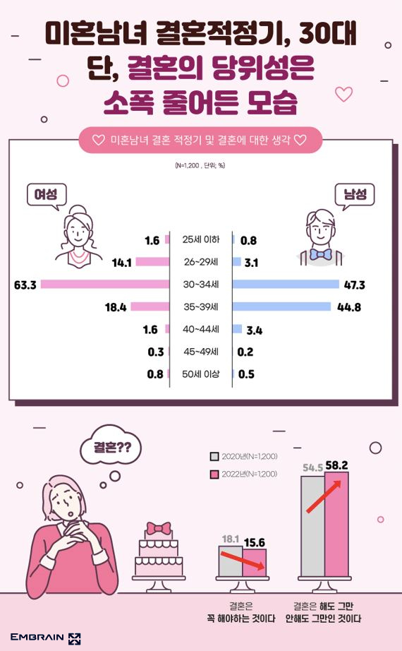 → 시장조사전문기업 엠브레인 트렌드모니터(trendmonitor.co.kr)가 전국의 만 19~45세 미혼 남녀 1,200명을 대상으로 2022 결혼식 관련 인식 조사를 실시한 결과 향후 결혼 계획이 있다고 밝힌 응답자들에게서 이전 조사 대비 결혼 계획이 감소하고 있음을 확인할 수 있었다(70.7%(2017) → 67.2%(2020) → 63.7%(2022)). 또한 결혼은 꼭 해야 하는 것이라고 응답한 비율도 꾸준히 감소하고 있었는데(20.3%(2017) → 18.1%(2020) → 15.6%(2022)), 이를 통해 결혼의 필요성에 의구심을 갖는 사람들이 점점 많아지고 있다는 걸 예상해볼 수 있었다. 특히 ‘결혼은 해도 그만, 안 해도 그만’이라는 응답은 이전보다 증가하고 있었으며(54.5%(2020) → 58.2%(2022)) 이는 남성(48.2%)보다 여성(68.2%)의 동의가 더 많은 편이었다. 실제로 여성의 경우 남성보다 비혼 및 독신주의에 대한 의지 역시 더 높은 수준으로 나타나고 있었다(여성:25.7%, 남성:12.2%).