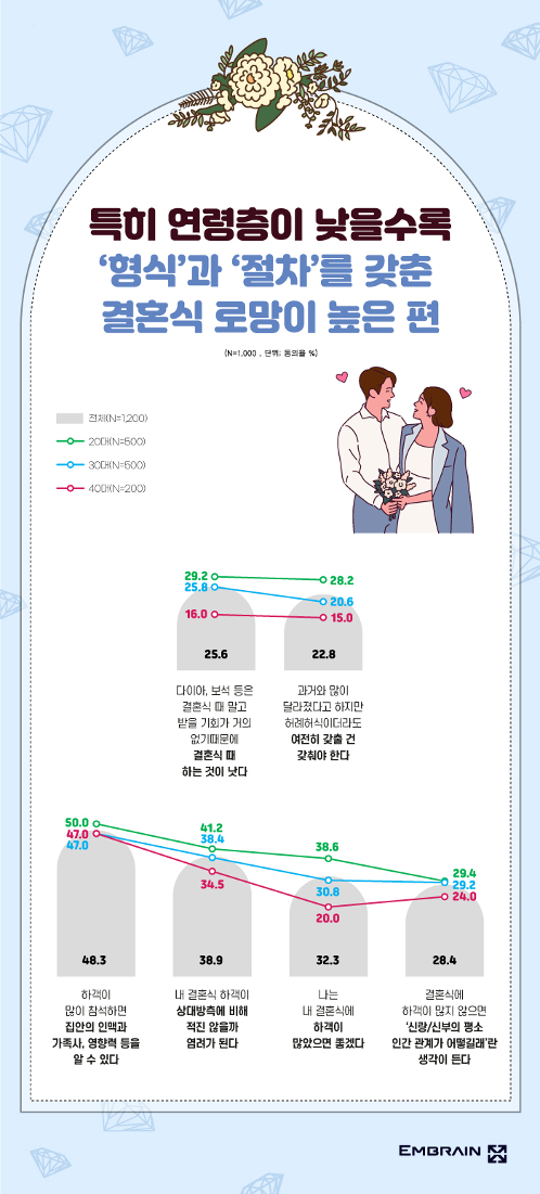 → 결혼식 비용의 경우 남녀가 비슷하고 적절하게 분담해야 한다는 인식이 나타났다. 결혼식 비용의 절반 정도는 나의 저축액(53.8%)으로 마련할 계획이나 나머지 비용은 대출(25.6%) 및 부모님 도움(20.6%) 등으로 충당해야 할 것 같다는 응답이 높은 편이었다. 특히 올해 결혼을 앞둔 결혼 예정자(24.1%)나 상대적으로 저축의 기간이 짧을 수밖에 없는 20대 응답자(20대 23.4%, 30대 19.4%, 40대 16.9%)의 경우 부모님의 경제적 도움을 받았다는 비율이 조금 더 높게 나타났다. 이에 따라 부모님의 도움 없이는 결혼하기 어려운 시대라는 회의적인 반응(58.9%)을 확인할 수 있었으며, 전체 응답자의 10명 중 4명은 부모님이 반대하는 결혼이라면 하지 않겠다고 응답(41.2%)했다. 이처럼 부모의 경제적 뒷받침 여부가 결혼의 전제 조건 중 하나로 자리잡고 있는 상황 속에서 응답자의 무기력한 감정도 엿볼 수 있었다. 결혼은 자신의 능력을 증명하는 방법(46.4%)이자 결혼 대신 부모 밑에서 연애만 하며 풍족하게 살고 싶다는(30.6%) 응답이 낮지 않은 수준으로 나타나고 있었는데, 이를 통해 우리 사회 양극화 현상이 결혼 문화로도 확대되고 있음을 엿볼 수 있었다.