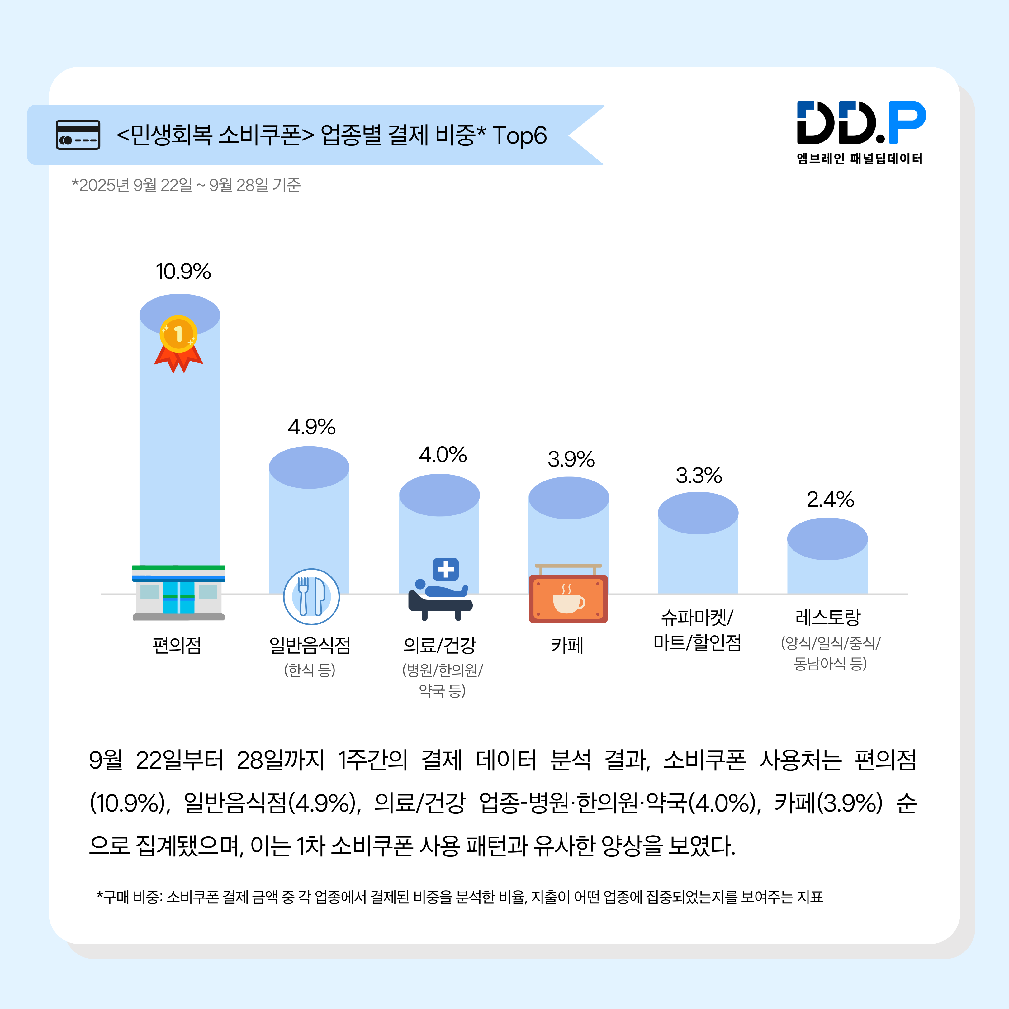 우선, 9월 22일부터 28일까지 1주간의 결제 데이터 분석 결과, 소비쿠폰 사용처는 편의점(10.9%), 일반음식점(4.9%), 의료/건강 업종-병원·한의원·약국(4.0%), 카페(3.9%) 순으로 집계됐으며, 이는 1차 소비쿠폰 사용 패턴과 유사한 양상을 보였다. ‘구매 비중’은 소비쿠폰 결제액 중 각 업종에서 결제된 비중을 분석한 비율로, 소비자의 실질적 지출 집중도를 보여주는 지표인 만큼 민생회복 소비쿠폰이 생활 밀착형 영역에서 활발히 사용되고 있음을 재확인할 수 있었다.