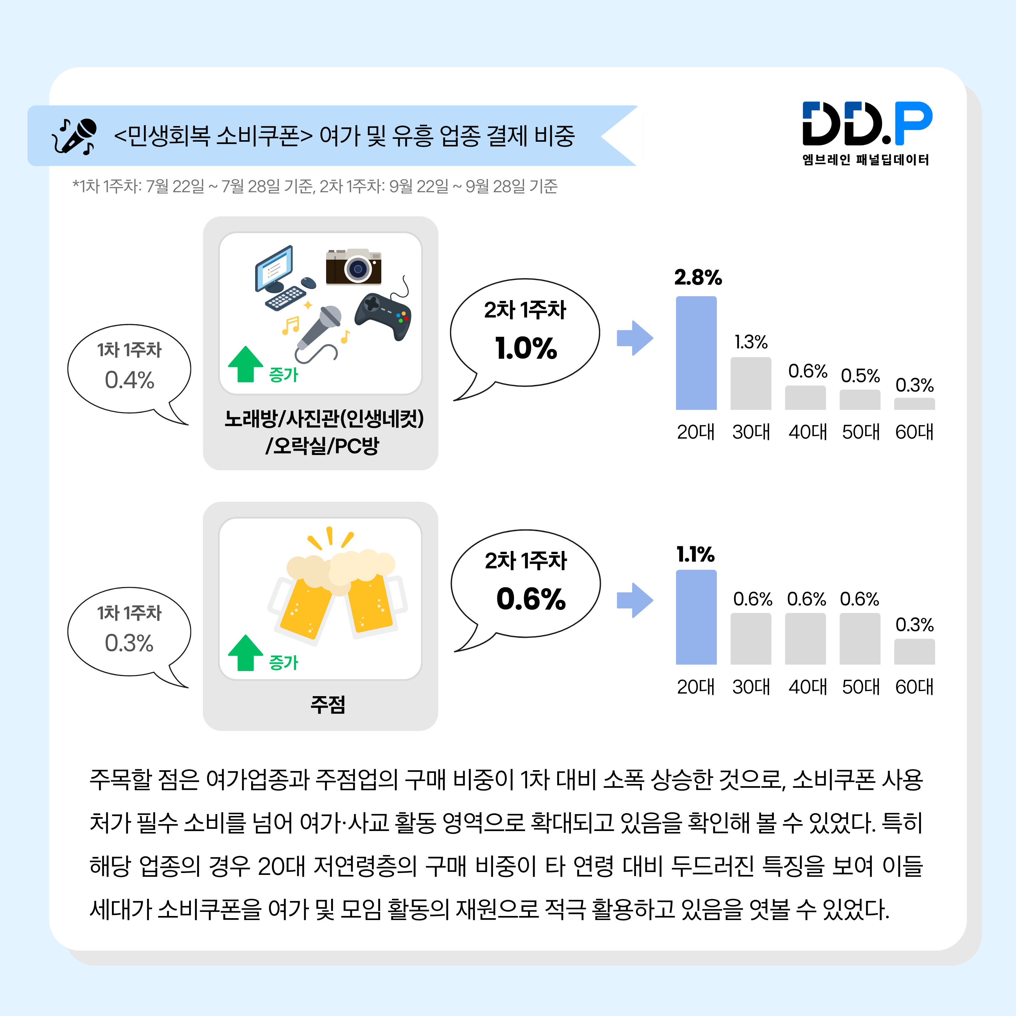 주목할 점은 여가업종(노래방·사진관·오락실 등)과 주점업의 구매 비중이 1차 대비 소폭 상승했다는 것이다. 여가 업종은 0.4%(1차 1주차)에서 1.0%(2차 1주차)로, 주점업은 0.3%에서 0.6%로 각각 증가했는데, 이는 소비쿠폰 사용처가 필수 소비를 넘어 여가·사교 활동 영역으로 확대되고 있음을 시사하는 결과이다. 특히 해당 업종의 경우 20대 저연령층의 구매 비중이 타 연령층 대비 두드러진 특징을 보여(노래방 20대 2.8%, 30대 1.3%, 40대 0.6%, 50대 0.5%, 60대 0.3% / 주점 20대 1.1%, 30대 0.6%, 40대 0.6%, 50대 0.6%, 60대 0.3%), 이들 세대가 소비쿠폰을 여가 및 모임 활동의 재원으로 적극 활용하고 있음을 엿볼 수 있었다.