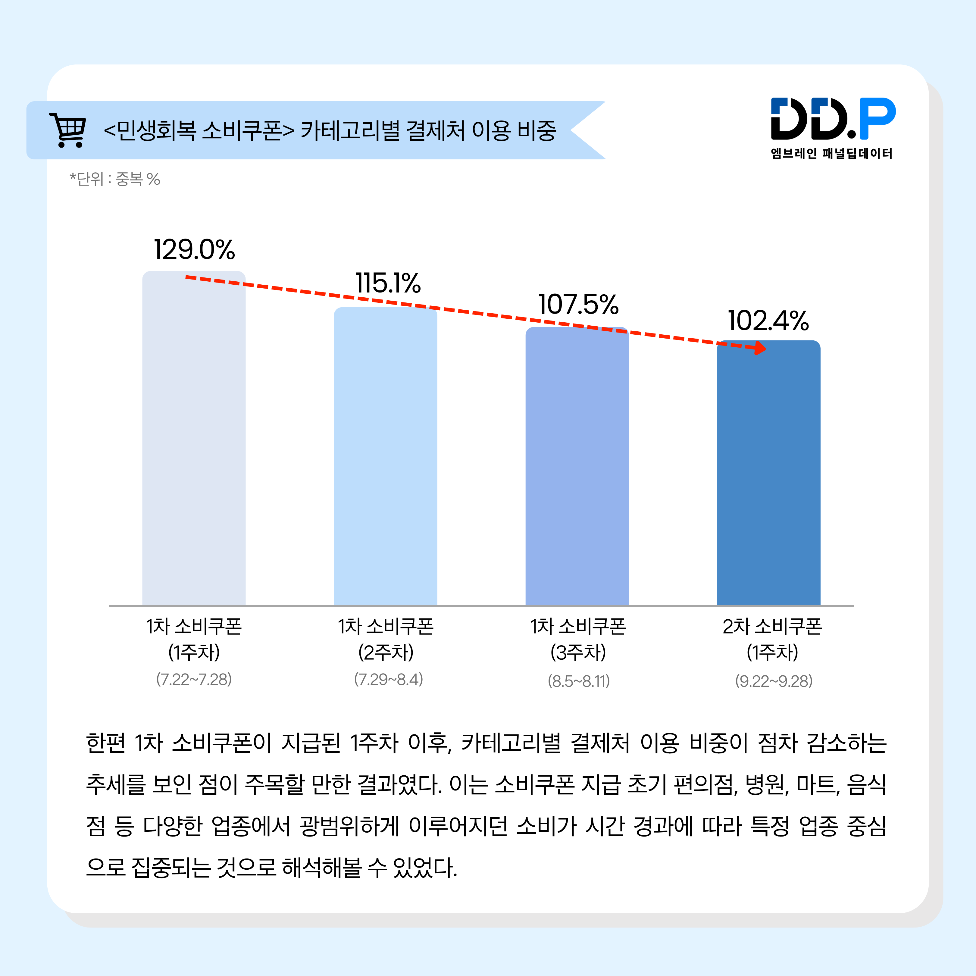 한편, 1차 소비쿠폰이 지급 1주차 이후 카테고리별 결제처 이용 비중이 점진적으로 감소하는 추세를 보인 점은 주목할 만한 결과였다(그래프 참조). 이는 소비쿠폰 지급 초기 편의점, 병원, 마트, 음식점 등 다양한 업종에서 광범위하게 이루어지던 소비가 시간 경과에 따라 특정 업종 중심으로 집중되는 것으로 해석해볼 수 있었다. 즉, 초기의 분산적 소비 패턴이 이후 생활권 중심의 일상적 소비처로 안정화되고 있는 것으로 분석된다.