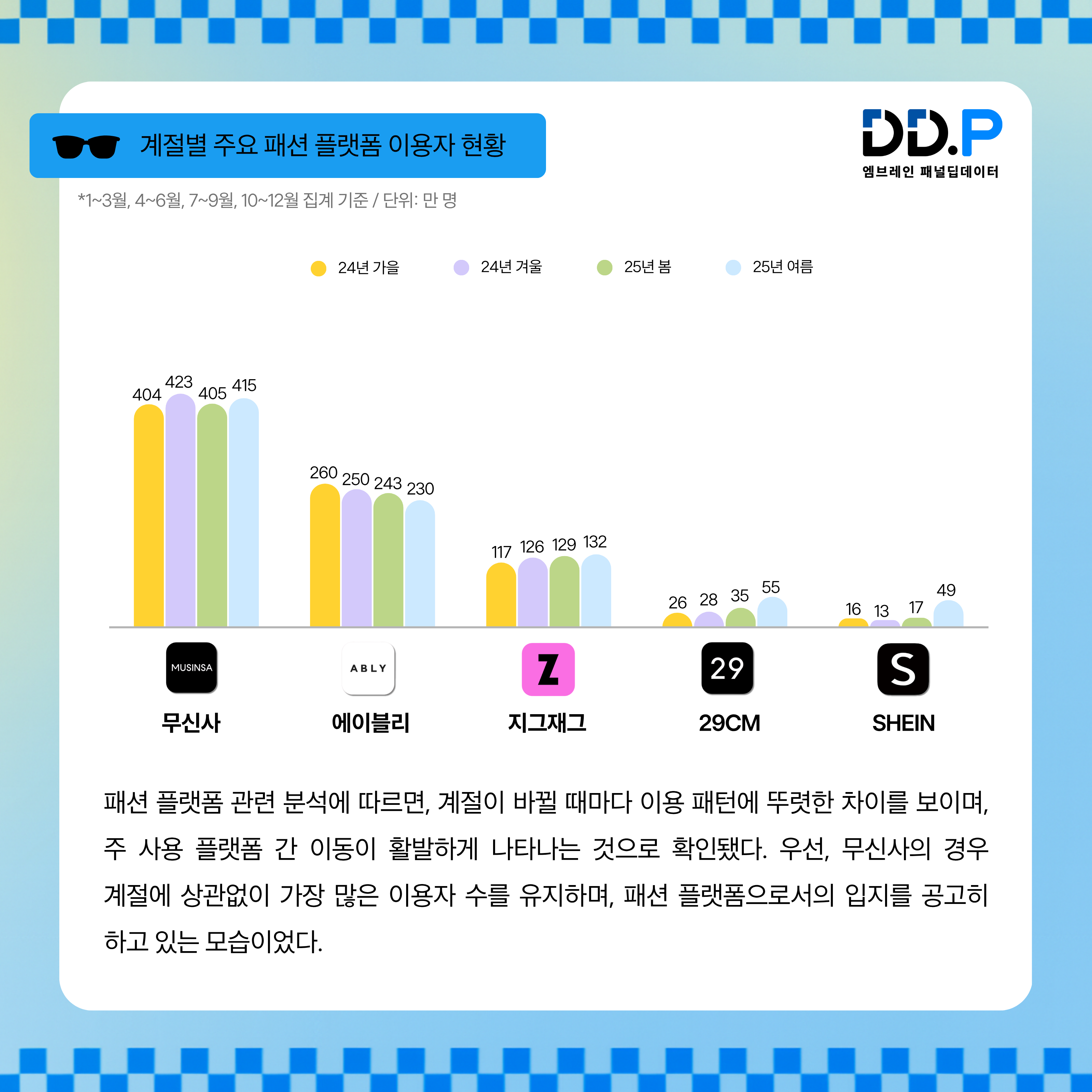 → 패션 플랫폼 시장이 계절 변화에 따라 빠르게 재편되고 있다. 봄·여름·가을·겨울 시즌마다 주로 이용하는 앱이 달라지면서, 소비자들의 관심이 한 플랫폼에 머물기보다 여러 앱 사이를 오가는 흐름이 뚜렷해지고 있는 모습이다. 계절별 쇼핑 니즈에 따라 플랫폼 간 이동이 반복되는 가운데, 다가오는 가을 시즌에는 어떤 플랫폼이 소비자들의 선택을 받게 될지 귀추가 주목된다.