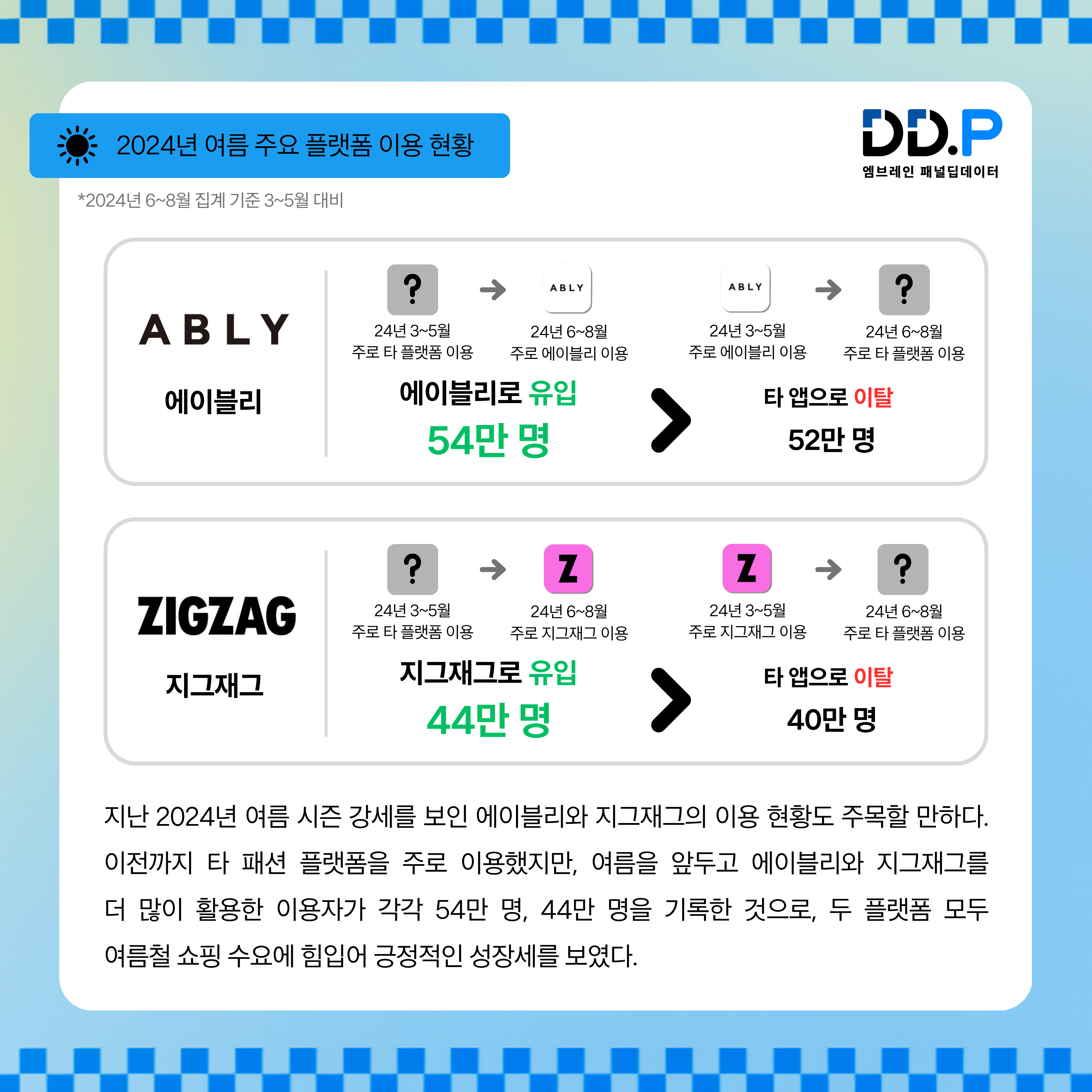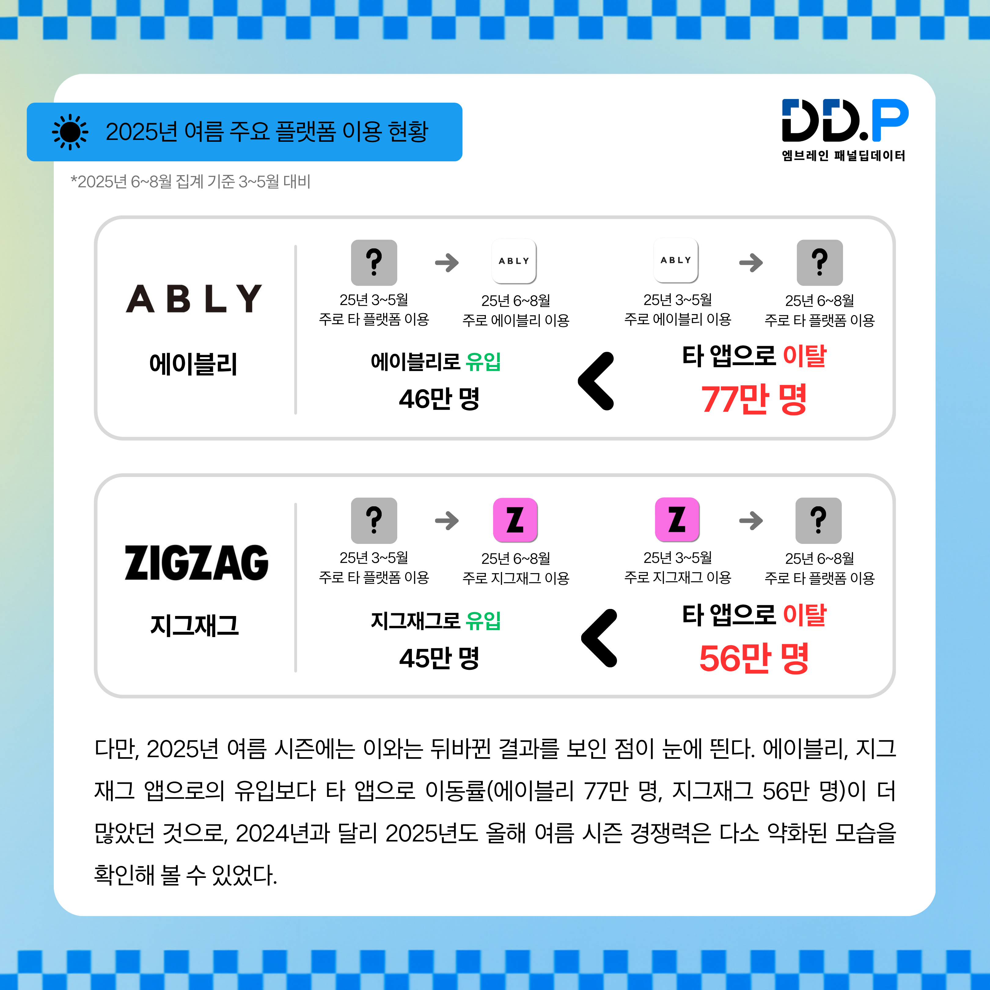 한편, 지난 2024년 여름 시즌 강세를 보인 에이블리와 지그재그의 이용 현황도 주목할 만하다. 이전까지 타 패션 플랫폼을 주로 이용했지만, 여름을 앞두고 에이블리와 지그재그를 더 많이 활용한 이용자가 각각 54만 명, 44만 명을 기록한 것으로, 두 플랫폼 모두 여름철 쇼핑 수요에 힘입어 긍정적인 성장세를 보였다. 다만, 2025년 여름 시즌에는 이와는 뒤바뀐 결과를 보인 점이 눈에 띈다. 에이블리, 지그재그 앱으로의 유입보다 타 앱으로 이동률(에이블리 77만 명, 지그재그 56만 명)이 더 많았던 것으로, 2024년과 달리 2025년도 올해 여름 시즌 경쟁력은 다소 약화된 모습을 확인해 볼 수 있었다.