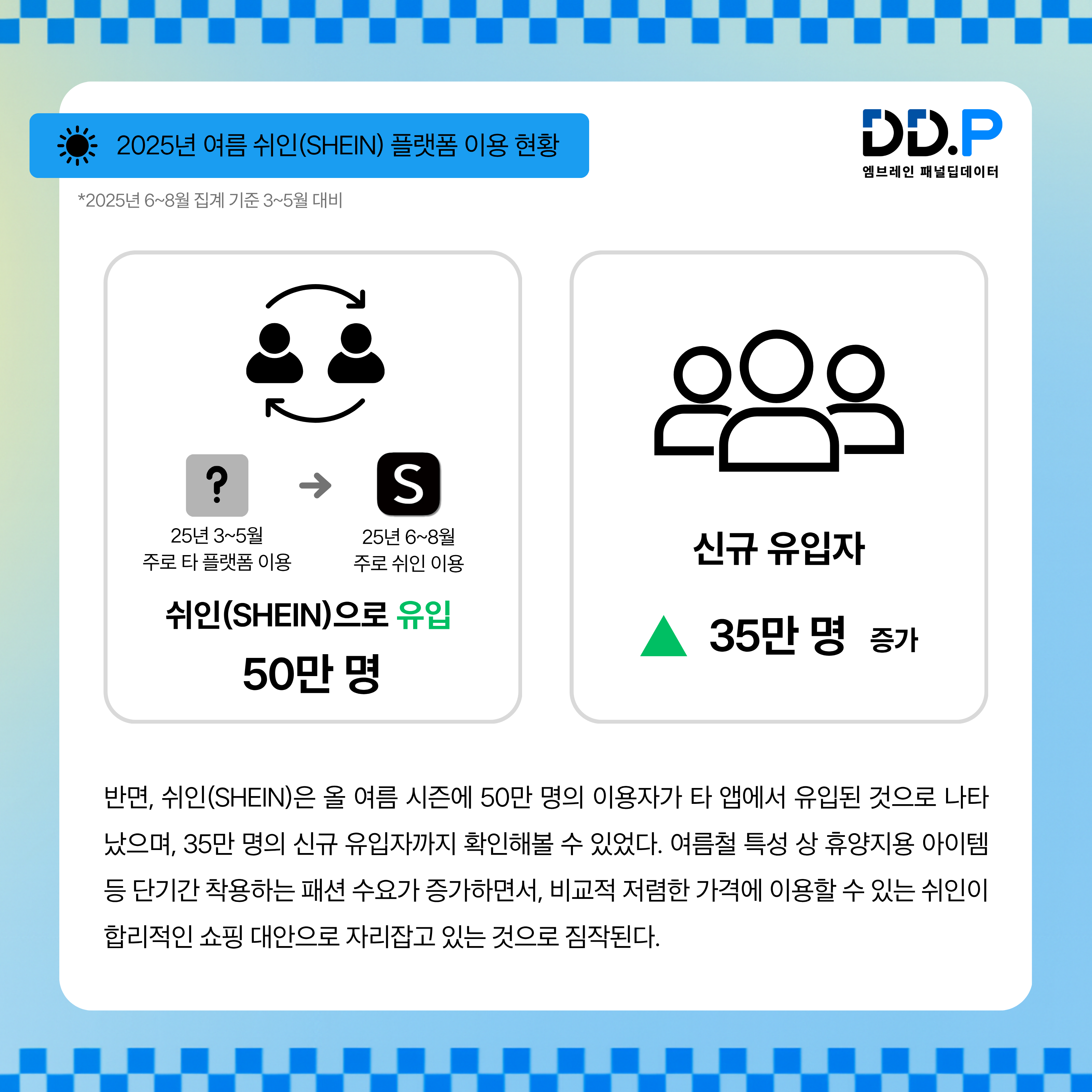 반면, 중국 패션 플랫폼 쉬인(SHEIN)의 경우 올 여름 시즌에 50만 명의 이용자가 타 앱에서 유입된 것으로 나타났으며, 35만 명의 신규 유입자까지 확인해볼 수 있었다(데이터 별도문의). 여름철 특성 상 휴양지용 아이템 등 단기간 착용하는 패션 수요가 증가하면서, 비교적 저렴한 가격에 이용할 수 있는 쉬인이 합리적인 쇼핑 대안으로 자리잡고 있는 것으로 짐작된다.
