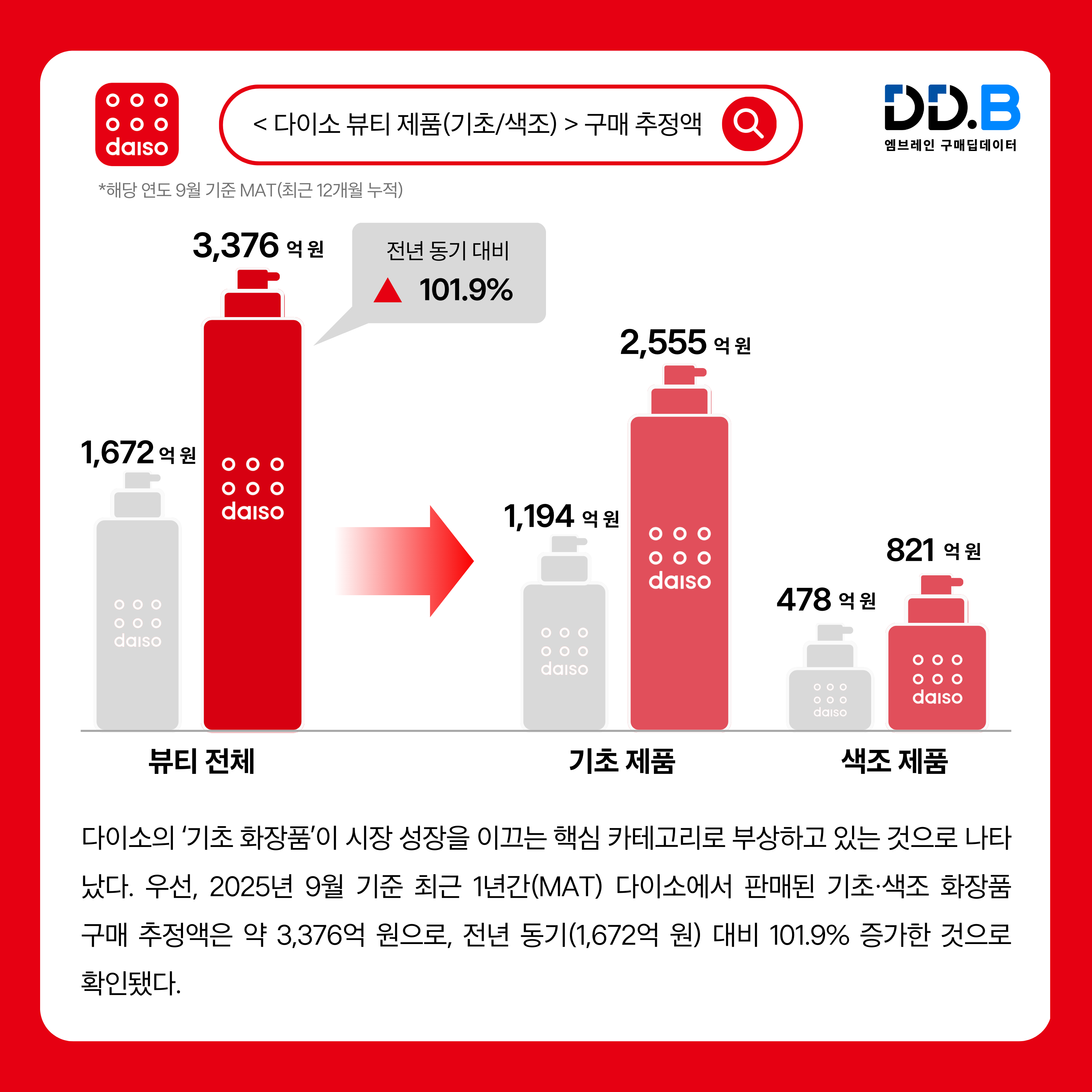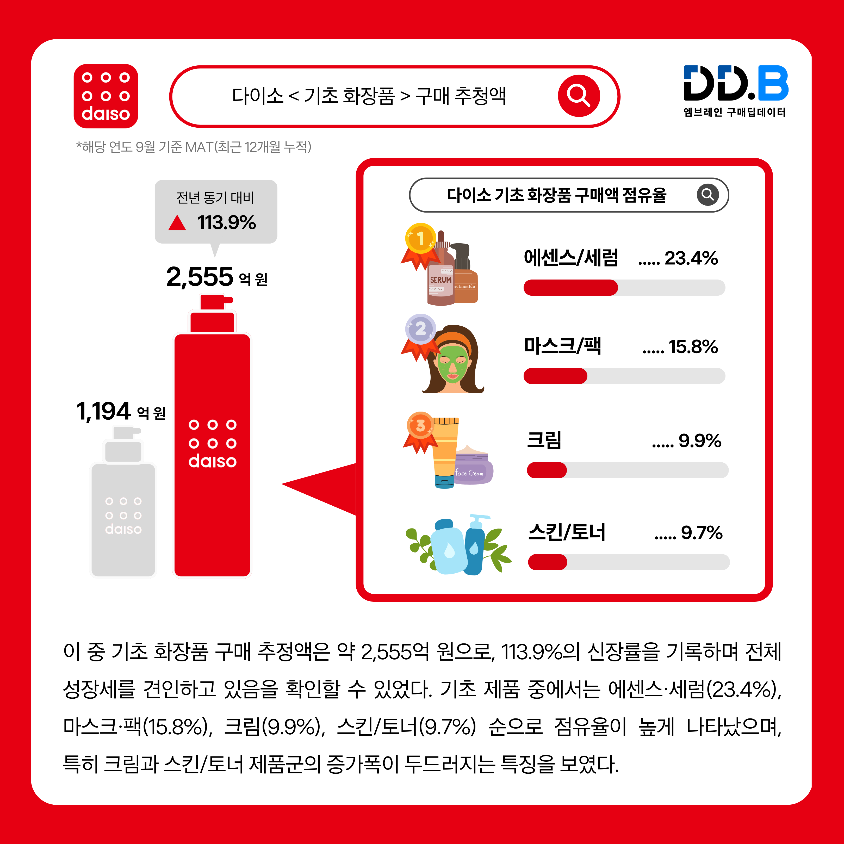 → 엠브레인 딥데이터®[1]의 다이소 뷰티 구매 트렌드 분석에 따르면, 다이소의 ‘기초 화장품’이 시장 성장을 이끄는 핵심 카테고리로 부상하고 있는 것으로 나타났다. 우선, 2025년 9월 기준 최근 1년간(MAT) 다이소에서 판매된 기초·색조 화장품 구매 추정액은 약 3,376억 원으로, 전년 동기(1,672억 원) 대비 101.9% 증가한 것으로 확인됐다. 이 중 기초 화장품 구매 추정액은 약 2,555억 원으로, 113.9%의 신장률을 기록하며 전체 성장세를 견인하고 있음을 확인할 수 있었다. 기초 제품 중에서는 에센스·세럼(23.4%), 마스크·팩(15.8%), 크림(9.9%), 스킨/토너(9.7%) 순으로 점유율이 높게 나타났으며, 특히 크림과 스킨/토너 제품군의 증가폭이 두드러지는 특징을 보였다.