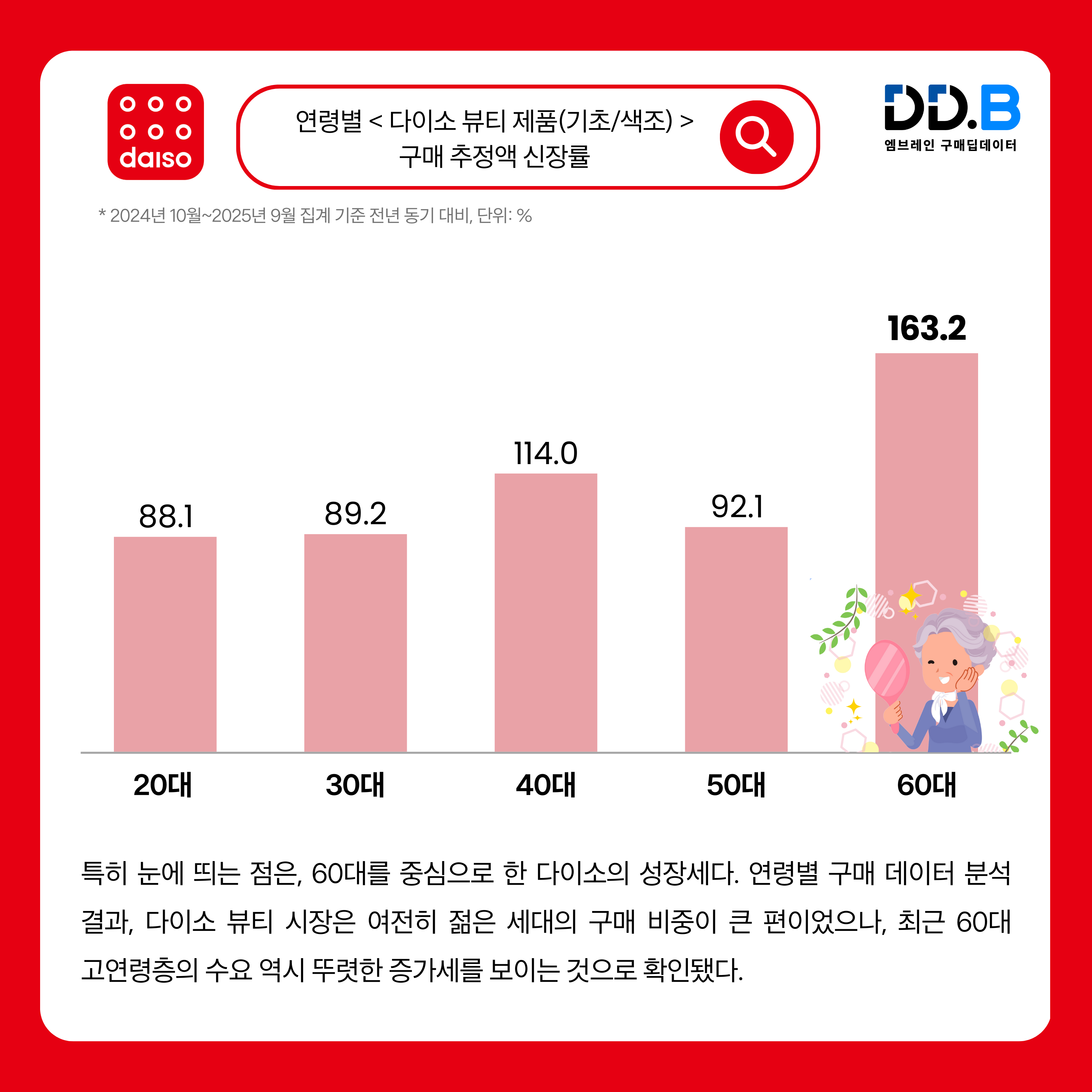 특히 눈에 띄는 점은, 60대를 중심으로 한 다이소의 성장세다. 연령별 구매 데이터 분석 결과, 다이소 뷰티 시장은 여전히 젊은 세대의 구매 비중이 큰 편이었으나, 최근 60대 고연령층의 수요 역시 뚜렷한 증가세를 보이는 것으로 확인됐다(그래프 참조). 그동안 다이소 화장품이 젊은 세대의 전유물로 여겨지던 것과 달리, 특정 세대를 넘어 전 연령층으로 확대되고 있음을 엿볼 수 있는 결과였다. 다이소가 입문형 기초 제품을 중심으로 한 실속형 라인업을 갖추면서, 브랜드보다 효능을 직접 확인하려는 시니어층의 구매 기준까지 충족시키고 있는 것으로 풀이된다.