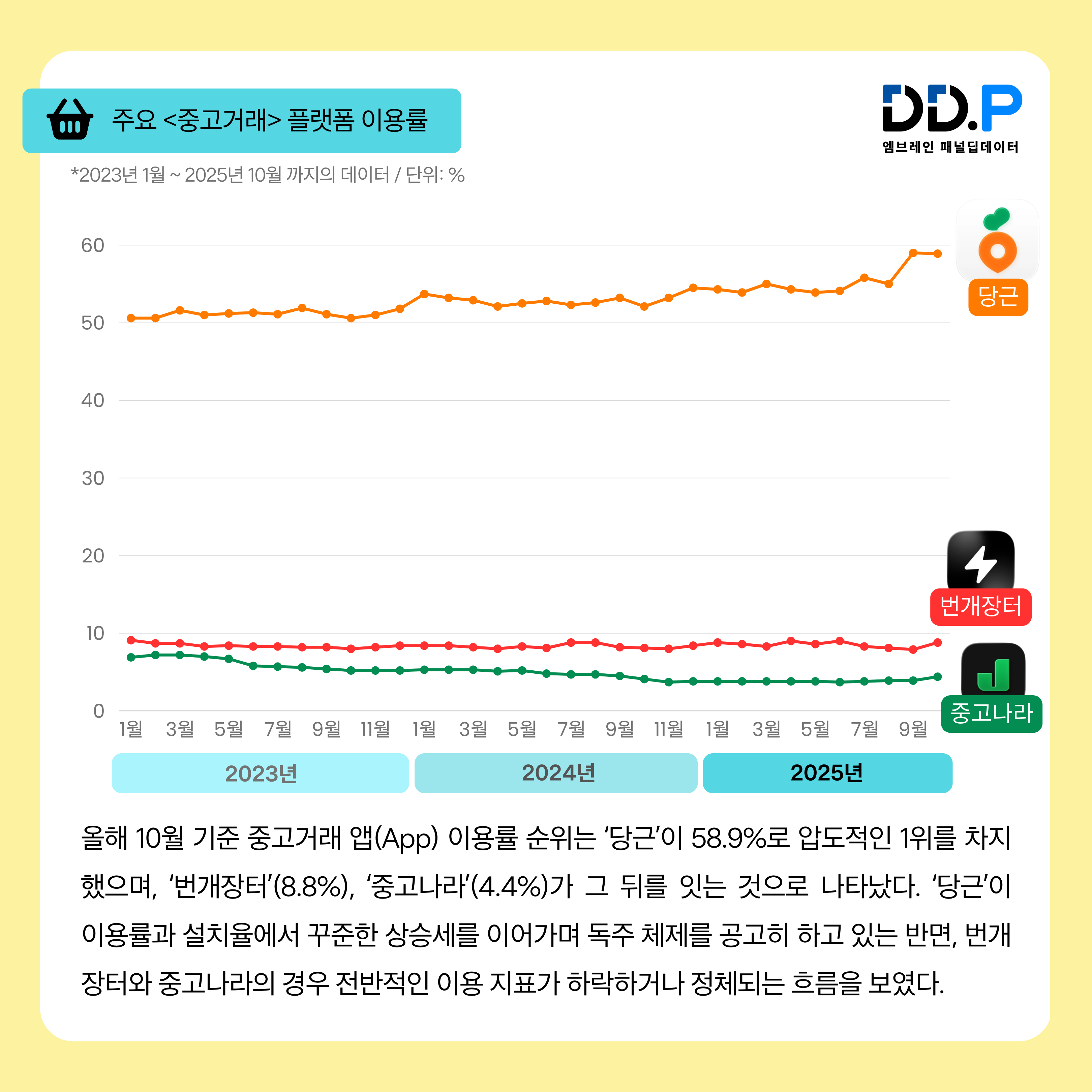 → 엠브레인 딥데이터®[1]의 ‘중고거래 플랫폼’ 이용 분석에 따르면, 올해 10월 기준 중고거래 앱(App) 이용률은 ‘당근’이 58.9%로 압도적 1위를 차지했으며, ‘번개장터’(8.8%), ‘중고나라’(4.4%)가 그 뒤를 잇는 것으로 나타났다. ‘당근’이 이용률과 설치율에서 꾸준한 상승세를 보이며 독주 체제를 공고히 하는 반면, 번개장터와 중고나라는 전반적인 이용 지표가 하락하거나 정체되며 시장 내 경쟁력 약화를 보였다.